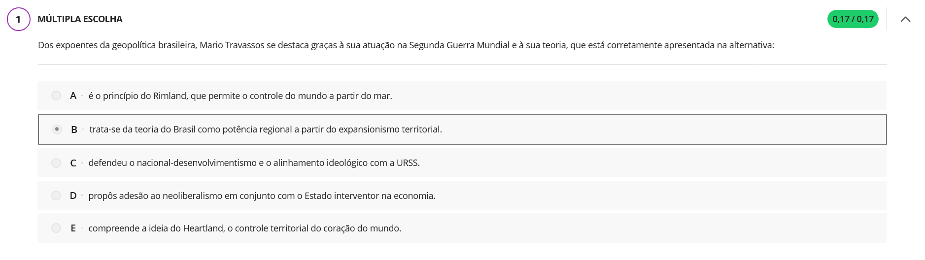 1 MÚLTIPLA ESCOLHA 0,17/0,17 Dos expoentes da geopolítica brasileira, Mario Travassos se destaca graças à sua atuação na Segunda Guerra Mundial e à sua teoria, que está corretamente apresentada na alternativa: A é O princípio do Rimland, que permite O controle do mundo a partir do mar. trata-se da teoria do Brasil como potência regional a partir do expansionismo territorial. defendeu nacional-desenvolvimentismo e O alinhamento ideológico com a URSS. D propôs adesão ao neoliberalismo em conjunto com Estado interventor na economia. E compreende a ideia do Heartland, controle territorial do coração do mundo.