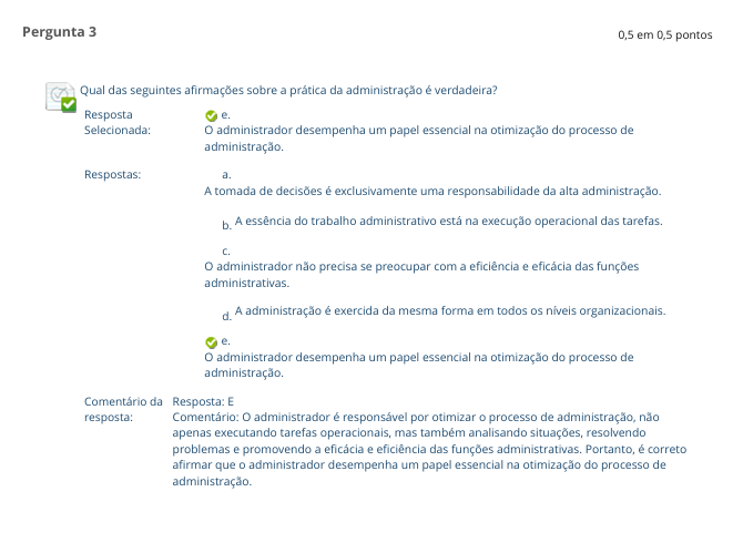 Pergunta 3 0,5 em 0,5 pontos Qual das seguintes afirmações sobre a da administração é verdadeira? Resposta e. Selecionada: administrador desempenha um papel essencial na otimização do processo de administração. Respostas: a. A tomada de decisões é exclusivamente uma responsabilidade da alta administração. b.A essência do trabalho administrativo está na execução operacional das tarefas. O administrador não precisa se preocupar com a eficiência e das funções administrativas. d. A administração é exercida da mesma forma em todos os niveis organizacionais. e. administrador desempenha um papel essencial na otimização do processo de administração. Comentário da Resposta: E resposta: Comentário: administrador é responsável por otimizar 0 processo de administração, não apenas executando tarefas operacionais, mas também analisando situações, resolvendo problemas e promovendo a e eficiência das funções administrativas. Portanto, é correto afirmar que 0 administrador desempenha um papel essencial na otimização do processo de administração.