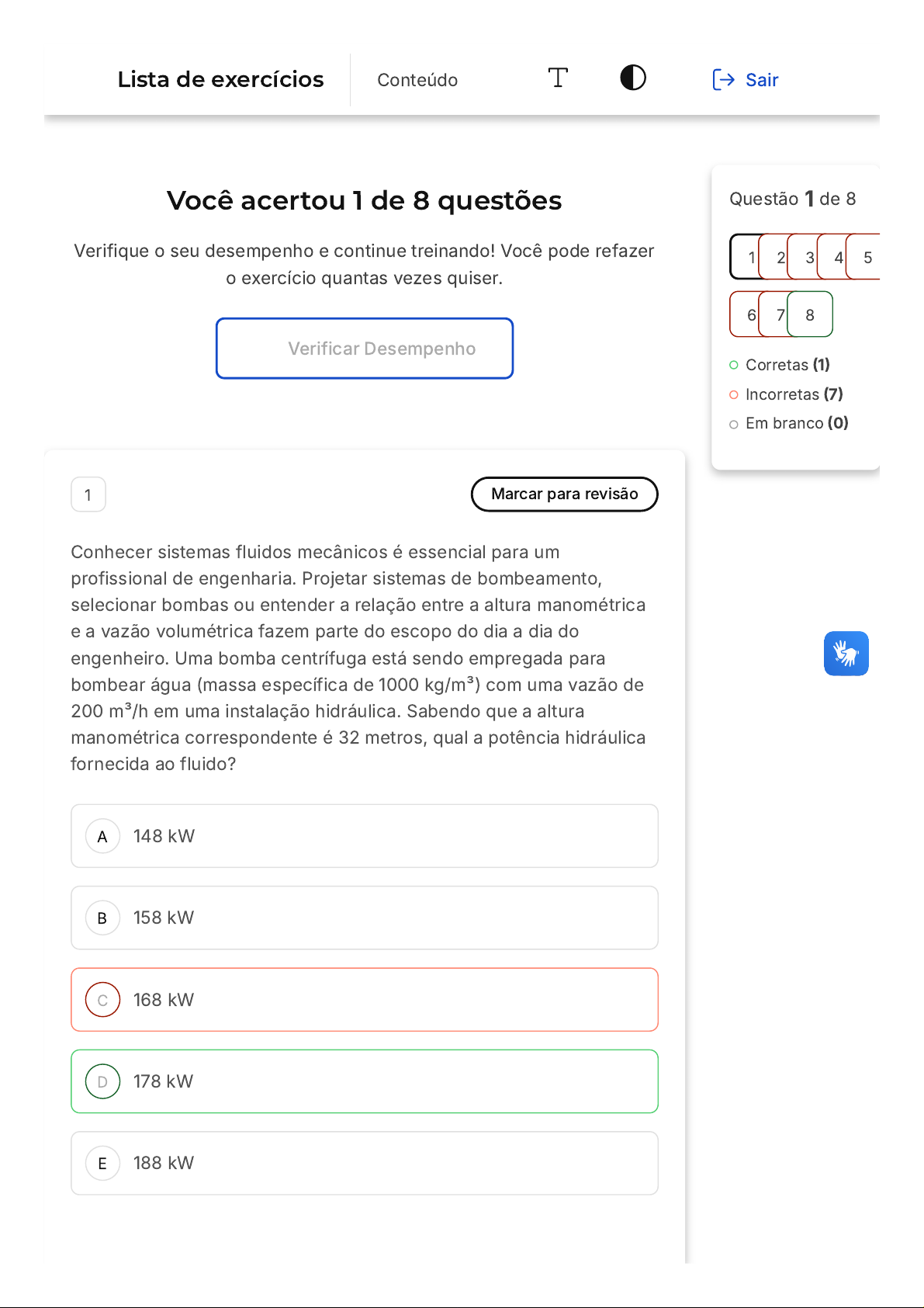 Você acertou 1 de 8 questões Verifique o seu desempenho e continue treinando! Você pode refazer o exercício quantas vezes quiser. Verificar Desempenho A B C D E 1 Marcar para revisão Conhecer sistemas fluidos mecânicos é essencial para um profissional de engenharia. Projetar sistemas de bombeamento, selecionar bombas ou entender a relação entre a altura manométrica e a vazão volumétrica fazem parte do escopo do dia a dia do engenheiro. Uma bomba centrífuga está sendo empregada para bombear água (massa específica de 1000 kg/m³) com uma vazão de 200 m³/h em uma instalação hidráulica. Sabendo que a altura manométrica correspondente é 32 metros, qual a potência hidráulica fornecida ao fluido? 148 kW 158 kW 168 kW 178 kW 188 kW Questão 1 de 8 Corretas (1) Incorretas (7) Em branco (0) 1 2 3 4 5 6 7 8 Lista de exercícios Conteúdo Sair A B C D E Resposta incorreta Opa! A alternativa correta é a letra D. Confira o gabarito comentado! Gabarito Comentado A potência hidráulica é calculada por: Assumindo a aceleração local da gravidade como 10 m/s² e substituindo os valores numéricos na equação A, temos que: 2 Marcar para revisão Conhecer sistemas fluidos mecânicos é essencial para um profissional de engenharia. Projetar sistemas de bombeamento, selecionar bombas ou entender a relação entre a altura manométrica e a vazão volumétrica fazem parte do escopo do dia a dia do engenheiro. Uma bomba centrífuga possui a seguinte curva característica: com H em metros e Q em metros cúbicos por segundo. Se para um determinado sistema ela fornece uma altura manométrica de 50 metros, qual a vazão volumétrica na descarga? 0,09 m³/s 0,10 m³/s 0,11 m³/s 0,12 m³/s 0,13 m³/s A B C Resposta incorreta Opa! A alternativa correta é a letra E. Confira o gabarito comentado! Gabarito Comentado A vazão volumétrica na descarga é calculada isolando o termo Q na equação característica: Como a raiz negativa não é fisicamente possível, tomamos como resposta a raiz positiva, logo, a vazão é igual a 0,13 m³/s. 3 Marcar para revisão Conhecer sistemas fluidos mecânicos é essencial para um profissional de engenharia. Projetar sistemas de bombeamento, selecionar bombas ou entender a relação entre a altura manométrica e a vazão volumétrica fazem parte do escopo do dia a dia do engenheiro. Em uma indústria de armazenamento de granéis líquidos, um engenheiro selecionou uma bomba para escoar 1000 m³/h um combustível de um tanque para o outro, com uma cota entre os níveis de líquido de 35 metros. Sabendo que ambos os tanques estão na pressão atmosférica e com nível constante, e com perda de carga total na sucção e descarga de 5,5 metros, a altura manométrica real dessa bomba é: 39,5m 40,5m 41,5m D E A B C 42,5m 43,5m Resposta incorreta Opa! A alternativa correta é a letra B. Confira o gabarito comentado! Gabarito Comentado A altura manométrica real da bomba é calculada por: 4 Marcar para revisão Conhecer sistemas fluidos mecânicos é essencial para um profissional de engenharia. Projetar sistemas de bombeamento, selecionar bombas ou entender a relação entre a altura manométrica e a vazão volumétrica fazem parte do escopo do dia a dia do engenheiro. Uma bomba centrífuga contendo um rotor semiaberto opera com uma rotação de 1000 rpm e uma altura manométrica de 4 metros. O expoente da lei da afinidade para esse rotor é de 2,68. Se a rotação for aumentada para 1800 rpm, a nova altura manométrica é: 11,3 m 13,3 m 15,3 m D E A B 17,3 m 19,3 m Resposta incorreta Opa! A alternativa correta é a letra E. Confira o gabarito comentado! Gabarito Comentado Na condição descrita no enunciado para rotores semiabertos, temos a seguinte relação para a altura manométrica: Substituindo os valores numéricos: 5 Marcar para revisão Conhecer sistemas fluidos mecânicos é essencial para um profissional de engenharia. Projetar sistemas de bombeamento, selecionar bombas ou entender a relação entre a altura manométrica e a vazão volumétrica fazem parte do escopo do dia a dia do engenheiro. Uma instalação possui a seguinte curva do sistema: , com H em metros e Q em m³/s. Uma bomba centrífuga deve ser colocada nesse sistema e fornecer uma vazão de 5 m³/s. O engenheiro responsável escolheu uma bomba no almoxarifado e verificou que ela pode fornecer a vazão desejada. Porém, nessas condições, qual a altura manométrica H que a bomba irá fornecer? 40 m 50 m C D E 60 m 70 m 80 m Resposta incorreta Opa! A alternativa correta é a letra A. Confira o gabarito comentado! Gabarito Comentado A altura manométrica, que é a energia que a bomba fornece ao fluido por unidade de peso, é determinada substituindo a vazão Q na equação da curva do sistema. Neste caso, a vazão desejada é de 5 m³/s. Substituindo esse valor na equação, obtemos a altura manométrica H que a bomba irá fornecer. A equação utilizada é a seguinte: Portanto, a altura manométrica fornecida pela bomba é de 40 metros, o que corresponde à alternativa A. 6 Marcar para revisão Conhecer sistemas fluidos mecânicos é essencial para um profissional de engenharia. Projetar sistemas de bombeamento, selecionar bombas ou entender a relação entre a altura manométrica e a vazão volumétrica fazem parte do escopo do dia a dia do engenheiro. Um sistema possui duas bombas centrífugas diferentes associadas em série. A potência hidráulica total fornecida pelo sistema é de 500 kW e a vazão volumétrica é de 0,052 m³/s. O fluido possui massa específica de 1200 kg/m³. Se a altura manométrica da bomba 1 é de 250 metros, a altura manométrica da bomba 2 será? A B C D E 551,28 m 561,28 m 571,28 m 581,28 m 591,28 m Resposta incorreta Opa! A alternativa correta é a letra A. Confira o gabarito comentado! Gabarito Comentado A potência hidráulica total fornecida pelas duas bombas ao fluido é calculada por: Substituindo os valores numéricos na equação A. Importante: lemb