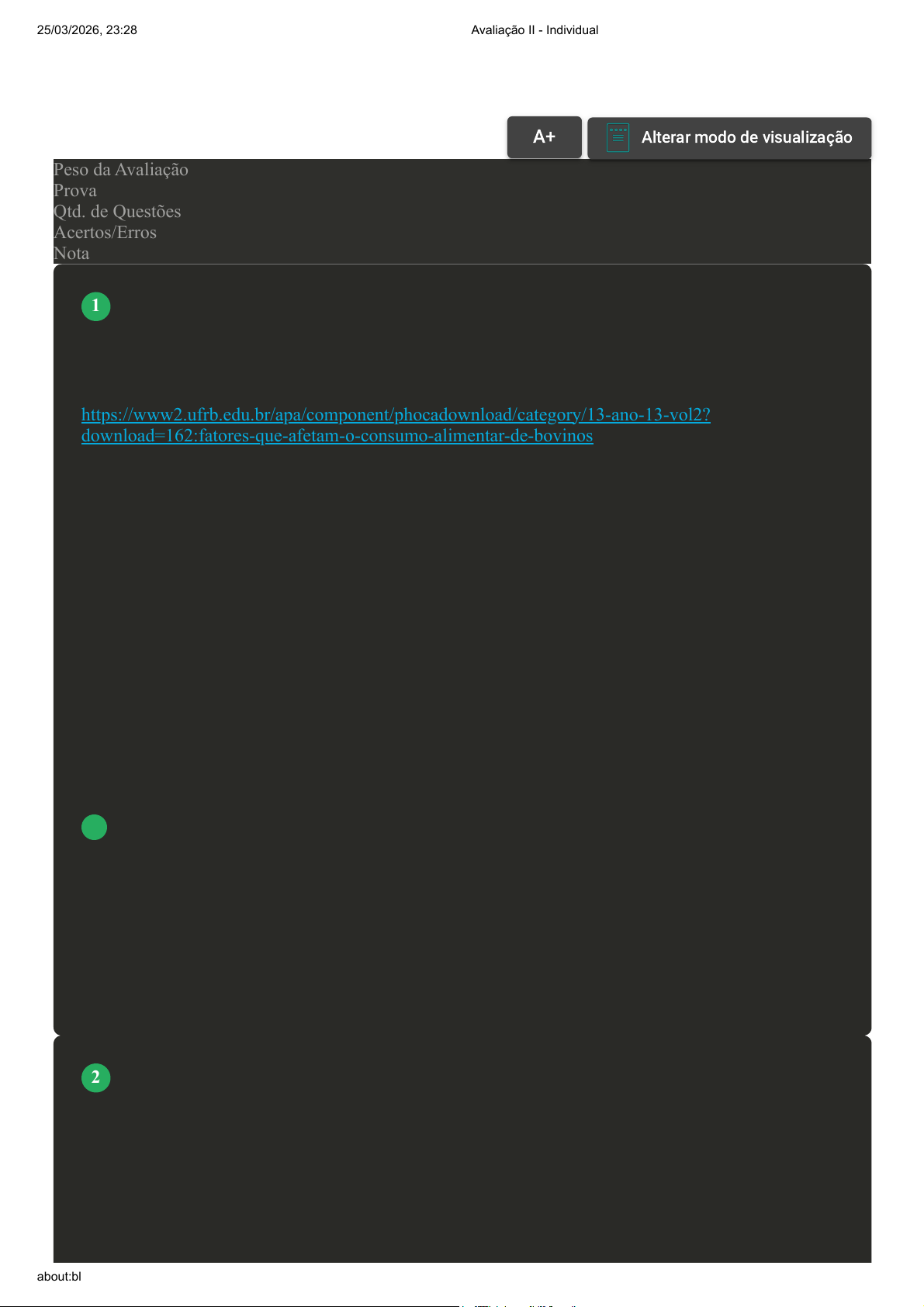 Prova Impressa GABARITO | Avaliação II - Individual (Cod.:1598658) Peso da Avaliação 1,50 Prova 116997046 Qtd. de Questões 10 Acertos/Erros 8/2 Nota 8,00 Diversos fatores podem afetar o consumo e a digestibilidade dos alimentos pelos animais. Fonte: FERREIRA S. F. et al. Fatores que afetam o consumo alimentar de bovinos. Arquivos de Pesquisa Animal, [s.l.], v. 2, n. 1, p. 9 - 19, 2013. Disponível em: https://www2.ufrb.edu.br/apa/component/phocadownload/category/13-ano-13-vol2? download=162:fatores-que-afetam-o-consumo-alimentar-de-bovinos. Acesso em: 8 mar. 2024. Com relação do consumo e digestibilidade, analise as afirmativas a seguir: I. A temperatura ambiente pode afetar o consumo de um nutriente e o consumo do alimento. II. No consumo controlado, os nutrientes são controlados, mas a ração é dada à vontade aos animais. III. O grau de lignificação de um alimento pode interferir no seu consumo, mas não na sua digestibilidade. IV. A idade do animal e o grau de maturidade da forragem limitam o consumo e a digestibilidade dos alimentos. É correto o que se afirmar em: A II e III, apenas. B I e IV, apenas. C I, II e III, apenas. D II, III e IV, apenas. A produtividade e a perenidade das pastagens decorrem de sua capacidade de reconstituição de nova área foliar, após o pastejo, a qual está estreitamente relacionada com as condições ambientais e as práticas de manejo da pastagem. As condições do ambiente são determinantes no processo de formação e manutenção dos tecidos vegetais e, consequentemente, da formação da área foliar. Fonte: WILSON, J. R. Environmental and nutritional factors affecting herbage quality. In: HACKER, J. B. (Ed.). Nutritional limits to animal production from pastures. Farnham: CAB, 1982. Qual dos fatores a seguir constitui como fator abiótico que influencia o crescimento das forragens? VOLTAR A+Aumentar, FonteAlterar modo de visualização 1 2 25/03/2026, 23:28 Avaliação II - Individual about:blank 1/7 https://www2.ufrb.edu.br/apa/component/phocadownload/category/13-ano-13-vol2?download=162:fatores-que-afetam-o-consumo-alimentar-de-bovinos https://www2.ufrb.edu.br/apa/component/phocadownload/category/13-ano-13-vol2?download=162:fatores-que-afetam-o-consumo-alimentar-de-bovinos A Temperatura. B Atmosfera. C Genética. D Meio ambiente. O diferimento de pastagens implica em submeter a planta forrageira a um longo período de crescimento como alternativa para contornar o efeito da estacionalidade, podendo assim aumentar a taxa de lotação animal na propriedade dentro dos limites impostos por este método de pastejo. Esta técnica é de grau de intensificação intermediário, e pode trazer retorno econômico para a propriedade, mas que requer especial atenção do pecuarista em sua adoção. Fonte: CARNEVALLI, R. A. Princípios sobre manejo de pastagens. Disponível em: https://www.embrapa.br/documents/1354377/1743400/plantas+forrageiras.pdf/b07981d5-fecc-4485- b799-49cb52f48432?version=1.0. Acesso em: 8 mar. 2024. Com base nas informações apresentadas, avalie as asserções a seguir e a relação proposta entre elas: I. Devido à estacionalidade das plantas forrageiras, o Brasil detém um dos maiores rebanhos bovinos comerciais do mundo e apresenta uma produtividade próxima do ideal para esse tipo de exploração. PORQUE II. O fenômeno da estacionalidade, que é observado em maior ou menor escala em todo o Brasil, é decorrente de alterações nas condições climáticas e causa uma variação acentuada de ganho de peso sobre os animais e um consequente atraso da idade de abate. A respeito dessas asserções, assinale a opção correta: A As asserções I e II são verdadeiras, mas a II não é uma justificativa correta da I. B As asserções I e II são falsas. C A asserção I é uma proposição falsa e a II é uma proposição verdadeira. D A asserção I é uma proposição verdadeira e a II é uma proposição falsa. E As asserções I e II são verdadeiras, e a II é uma justificativa correta da I. 3 25/03/2026, 23:28 Avaliação II - Individual about:blank 2/7 Em qualquer atividade agropecuária, uma das etapas é a realização de um diagnóstico da situação que a unidade produtiva se encontra. Em termos de posicionamento de fertilizantes, a elaboração de um diagnóstico correto é fundamental para os passos seguintes (Dias-Filho, 2021). Fonte: DIAS-FILHO, M. B. Fertilidade do solo em pastagem: como construir e monitorar. Belém, PA: Embrapa Amazônia Oriental, 2021. No que se diz respeito à fertilidade do solo nas pastagens, analise as afirmativas a seguir: I. Quanto maior o teor de um nutriente do solo em relação ao teor crítico estabelecido, maior será a probabilidade de resposta das culturas à calagem ou à adubação. II. Os fatores ambientais que mais influenciam no crescimento das pastagens e no rendimento de matéria seca são a radiação solar, o fotoperíodo, a temperatura do ar e a temperatura e umidade do solo. III. O objetivo do sistema de recomendação de fertilizantes é atingir e permanecer na faixa “alto”, considerada a faixa de disponibilidade mais adequada para as plantas. IV. Um diagnóstico de fertilidade do solo passa pelo enquadramento dos resultados dos parâmetros apresentados na análise química de solo e de tecido vegetal em amplitudes de valores, conforme probabilidade de resposta das plantas. É correto o que se afirma em: A II, III e IV, apenas. B I, II e III, apenas. C III e IV, apenas. D II e III, apenas. E I e IV, apenas. O % VC (valor cultural) das sementes se refere à capacidade de germinação e qualidade das mesmas para a formação de pastagem. Para determinar a quantidade mínima de sementes a ser distribuída em uma área, é essencial conhecer o % VC do lote de sementes, pois isso influencia diretamente na taxa de germinação das sementes e, consequentemente, na qualidade e densidade da pastagem formada. Sobre os dados apresentados, assinale a alternativa que apres