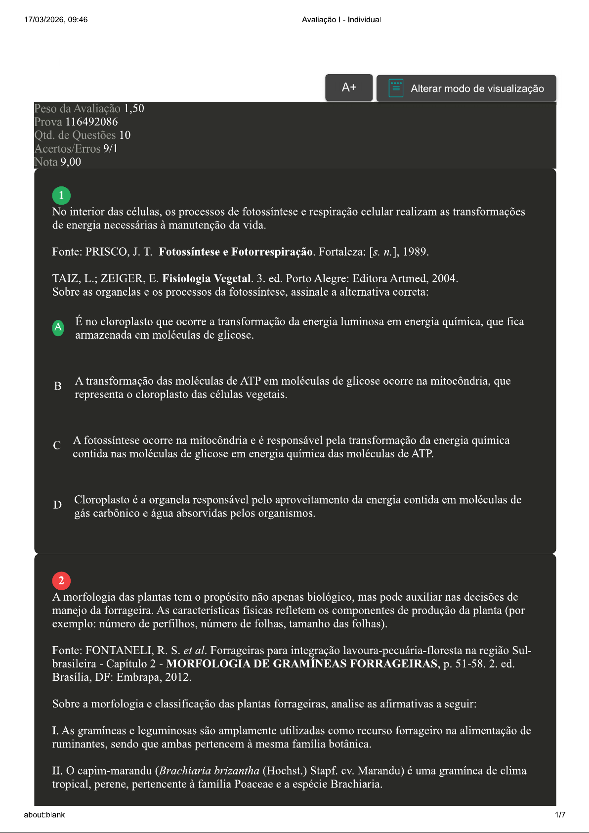17/03/2026, 09:46 Avaliação I - Individual A+ Alterar modo de visualização Peso da Avaliação 1,50 Prova 116492086 Qtd. de Questões 10 Acertos/Erros 9/1 Nota 9,00 1 No interior das células, os processos de fotossíntese e respiração celular realizam as transformações de energia necessárias à manutenção da vida. Fonte: PRISCO, J.T. Fotossíntese e Fotorrespiração. Fortaleza: [s. n.], 1989. TAIZ, L.; ZEIGER, E. Fisiologia Vegetal. 3. ed. Porto Alegre: Editora Artmed, 2004. Sobre as organelas e os processos da fotossíntese, assinale a alternativa correta: A É no cloroplasto que ocorre a transformação da energia luminosa em energia química, que fica armazenada em moléculas de glicose. A transformação das moléculas de ATP em moléculas de glicose ocorre na mitocôndria, que representa o cloroplasto das células vegetais. A fotossíntese ocorre na mitocôndria e é responsável pela transformação da energia química contida nas moléculas de glicose em energia química das moléculas de ATP. D Cloroplasto é a organela responsável pelo aproveitamento da energia contida em moléculas de gás carbônico e água absorvidas pelos organismos. 2 A morfologia das plantas tem o propósito não apenas biológico, mas pode auxiliar nas decisões de manejo da forrageira. As características físicas refletem os componentes de produção da planta (por exemplo: número de perfilhos, número de folhas, tamanho das folhas). Fonte: FONTANELI, R. S. et al. Forrageiras para integração lavoura-pecuária-floresta na região Sul- brasileira Capítulo 2 MORFOLOGIA DE GRAMÍNEAS FORRAGEIRAS, 51-58. 2. ed. Brasília, DF: Embrapa, 2012. Sobre a morfologia e classificação das plantas forrageiras, analise as afirmativas a seguir: I. As gramíneas e leguminosas são amplamente utilizadas como recurso forrageiro na alimentação de ruminantes, sendo que ambas pertencem à mesma família botânica. II. capim-marandu (Brachiaria brizantha (Hochst.) Stapf. cv. Marandu) é uma gramínea de clima tropical, perene, pertencente à família Poaceae e a espécie Brachiaria. about:blank 1/717/03/2026, 09:46 Avaliação Individual III. A categoria básica da hierarquia taxonômica é o gênero. nome da espécie é constituído por duas partes, sendo a primeira a família a qual pertence, seguido do epíteto específico. IV. Cultivar é definido como um grupo de indivíduos que apresentam características comuns entre si originadas por polinização natural e que podem ser obtidos pela seleção de plantas. É correto o que se afirma em: A III e IV, apenas. B II e III, apenas. I, II, III e IV. D I, II e III, apenas. Revisar Conteúdo do Livro 3 As plantas são compostas por diferentes estruturas que garantem sua fixação, nutrição, disseminação e hidratação. estudo de cada uma dessas partes é chamado de morfologia vegetal e abrange a compreensão das características das folhas, flores, raízes, caules, troncos, hastes, entre outros elementos. Com relação às plantas forrageiras, tais conhecimentos dessas características garantem a correta utilização para obter a produtividade e a perenidade das espécies. Fonte: ALCANTARA, P. B.; BUFARAH, G. Plantas Forrageiras: Gramíneas e Leguminosas. São Paulo: Nobel, 1979. Com relação à morfologia e sistemática das plantas forrageiras, assinale a alternativa correta: I. As espécies forrageiras que possuem rizomas necessariamente possuem hábito de crescimento rasteiro ou prostrado. II. meristema apical é responsável pelo controle do desenvolvimento das gemas axilares e a partir de onde surgem as novas folhas. III. Na classificação segundo o período de maior produção, gramíneas e leguminosas podem ser hibernais (clima temperado) e estivais (clima tropical). IV. colmo e o pseudocolmo são formados pelas bainhas das folhas mais velhas e são responsáveis pela sustentação da parte aérea da planta. É correto o que se afirma em: A I, II e III, apenas. B II e III, apenas. about:blank 2/717/03/2026, 09:46 Avaliação - Individual I e IV, apenas. D II, III e IV, apenas. 4 Nas últimas décadas, grandes áreas de matas nativas no Brasil vêm sendo intensamente modificadas pela agricultura, pelos sistemas agroflorestais e principalmente pela agropecuária. A transformação dessas áreas em pastagem se inicia normalmente com o corte da floresta primária, seguido de queima, introdução de culturas e degradação do solo. Existem ainda poucas informações a respeito da variação espacial ou mesmo de coletas de longo prazo tanto da variação da biomassa, como do índice de área foliar (IAF), área foliar específica (SLA) e altura da pastagem. Fonte: GUARDA, V.D. Bases Ecofisiológicas da Assimilação de Carbono e Suas Implicações na Produção de Forragem. Palmas: Embrapa Pesca e Aquicultura, 2014. Com base nas informações apresentadas, avalie as asserções a seguir e a relação proposta entre elas: I. As variações naturais no IAF, a altura e a biomassa de algumas espécies observam-se em resposta às variações sazonal e interanual do clima e da umidade no solo. PORQUE II. Em prolongados períodos de seca, as plantas podem responder ao estresse hídrico e limitações na transpiração através do fechamento dos estômatos, seguido de perdas das folhas e em casos extremos, mortes de partes das plantas. A respeito dessas asserções, assinale a opção correta: A As asserções I e II são verdadeiras, e a II é uma justificativa correta da I. B A asserção I é uma proposição falsa e a II é uma proposição verdadeira. A asserção I é uma proposição verdadeira e a II é uma proposição falsa. D As asserções I e II são verdadeiras, mas a II não é uma justificativa correta da I. 5 Os mecanismos de transporte de seiva bruta em plantas dependem, em menor escala, da capilaridade que existe nos vasos xilemáticos e da pressão promovida pela raiz durante a absorção de água e nutrientes do solo. Fonte: KERBAUY, G.B.