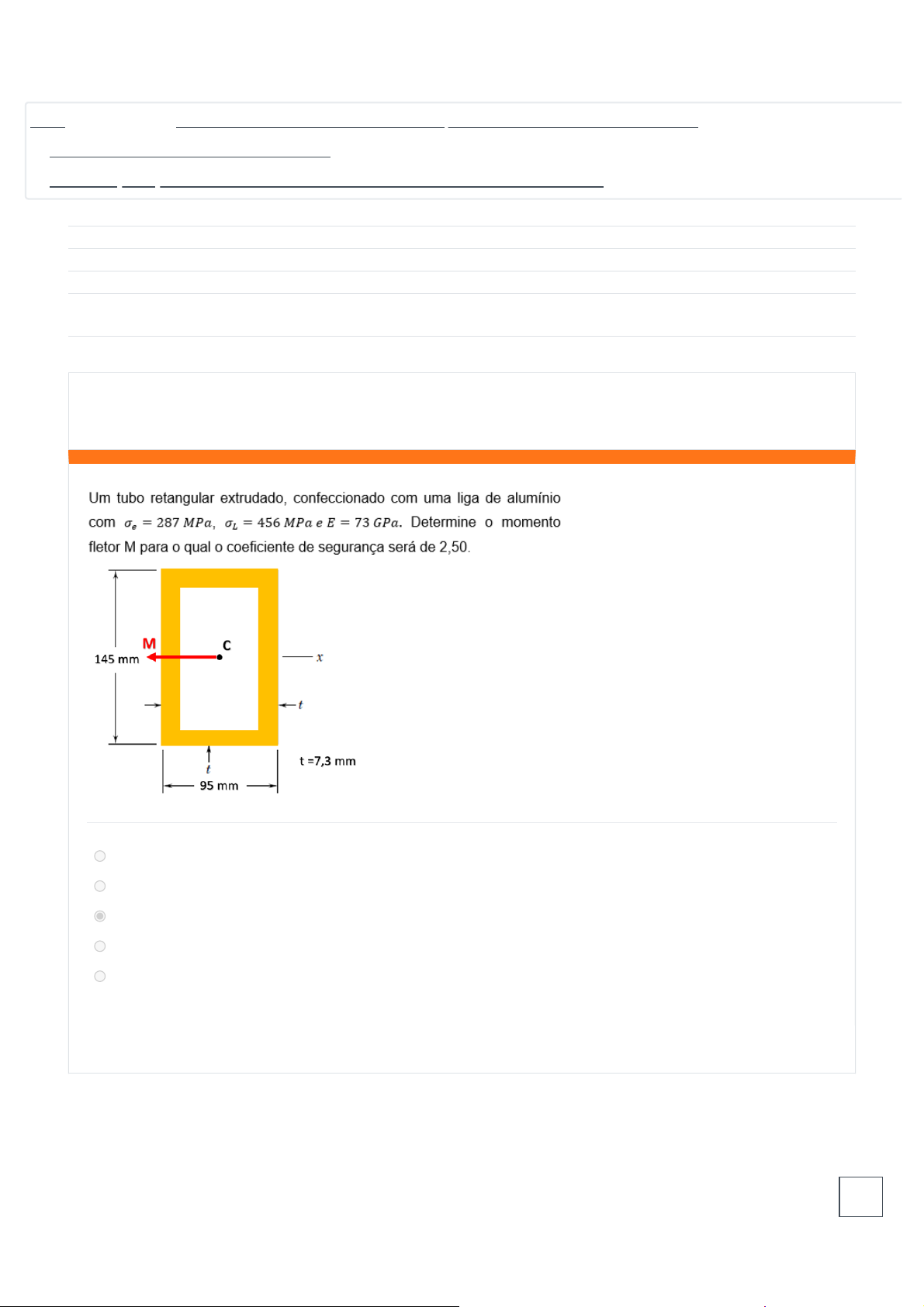 Iniciado em segunda, 19 jan 2026, 18:17 Estado Finalizada Concluída em segunda, 19 jan 2026, 18:26 Tempo empregado 8 minutos 44 segundos Avaliar 0,50 de um máximo de 0,50(100%) Questão 1 Completo Atingiu 0,05 de 0,05 a. M = 8,48 kN.m b. M = 8,15 kN.m c. M = 7,92 kN.m d. M = 7,03 kN.m e. M = 7,54 kN.m Sua resposta está correta. Painel / Meus cursos / BACHARELADO EM ENGENHARIA DE PRODUÇÃO-disc. 48- RESISTÊNCIA DOS MATERIAIS / ATIVIDADE DE ESTUDO 02 - VALOR 0,5 PONTOS / AB11 - CLIQUE AQUI PARA REALIZAR A ATIVIDADE DE ESTUDO 02 - PRAZO FINAL: 09/03/2026 https://www.eadunifatecie.com.br/course/view.php?id=94659 https://www.eadunifatecie.com.br/course/view.php?id=94659 https://www.eadunifatecie.com.br/my/ https://www.eadunifatecie.com.br/course/view.php?id=94659 https://www.eadunifatecie.com.br/course/view.php?id=94659#section-9 https://www.eadunifatecie.com.br/mod/quiz/view.php?id=3084519 Questão 2 Completo Atingiu 0,05 de 0,05 A barra ABC está submetida a torques de mesmo valor como mostra a figura. Sabendo que ambas as partes (AB e BC) são maciças com diâmetros de 50 mm e 30 mm respectivamente, e que a tensão admissível para o material da barra é de 100 MPa determine qual é o maior valor de T que pode ser aplicado. a. Tmáx = 1.004,70 kNm b. Tmáx = 0,530 Nm c. Tmáx = 0,82 Nm d. Tmáx = 98,17 Nmm e. Tmáx = 1,23/ Nm Sua resposta está correta. Questão 3 Completo Atingiu 0,05 de 0,05 Determine o deslocamento da barra de aço mostrada na figura abaixo submetida às forças dadas (E = 200 GPa). a. b. c. d. e. Sua resposta está correta. Questão 4 Completo Atingiu 0,05 de 0,05 Ambas as partes da barra ABC são feitas de um alumínio para o qual, E = 70 GPa. Sabendo que a intensidade de P é 6 kN, determine o valor de Q de modo que o deslocamento em A seja zero. a. Q = 25,13 kN para cima b. Q = 9,87 kN para baixo c. Q = 5,57 kN para baixo d. Q = 27,85 kN para cima e. Q = 11,14 kN para cima Sua resposta está correta. Questão 5 Completo Atingiu 0,05 de 0,05 A viga engastada mostrada na figura suporta uma carga distribuída no valor de 15 kN/m. Encontre a equação da linha elástica em função de x. a. b. c. d. e. Sua resposta está correta. Questão 6 Completo Atingiu 0,05 de 0,05 A seção transversal mostrada na figura, que compõe uma viga prismática de madeira submetida a um carregamento externo, está submetida a um esforço de cisalhamento no valor de V = 20 kN. Sabendo que a tensão de cisalhamento admissível para o material que a compõe é de 0,965 MPa, determine a menor dimensão “a” da sua seção transversal, sabendo que a altura é 1,8 x o valor da base. a. 100 mm b. 238 mm c. 74 mm d. 76 mm e. 132 mm Sua resposta está correta. Questão 7 Completo Atingiu 0,05 de 0,05 A viga mostrada na figura é feita de madeira e possui tensão admissível ao cisalhamento no valor de 0,785 MPa. Quando o carregamento concentrado de 20 kN é aplicado, qual é o valor da tensão de cisalhamento máxima? A viga está em segurança? a. 21,4 MPa. Segura b. 0,107 MPa. Segura c. 0,70 MPa. Segura d. 2,14 MPa. Não é segura e. 1,07 MPa. Não é segura Sua resposta está correta. Questão 8 Completo Atingiu 0,05 de 0,05 Uma barra de aço de seção transversal retangular medindo 15,9 mm x 58,3 mm está submetida a momentos fletores iguais e opostos atuando no plano vertical de simetria da barra. Determine o valor do momento fletor M que provoca escoamento na barra. Considere: a. M = 2,89 kN.m b. M = 2,07 kN.m c. M = 2,55 kN.m d. M = 2,65 kN.m e. M = 2,42 kN.m Sua resposta está correta. Questão 9 Completo Atingiu 0,05 de 0,05 A viga mostrada na figura é feita com duas tábuas. Determine a tensão de cisalhamento máxima que aparece na junção aba- alma quando o carregamento de 10 kN/m é aplicado. Os apoios exercem apenas reações verticais na viga. a. 1,35 Mpa b. 121,2 Mpa c. 36,37 Mpa d. 12,12 Mpa e. 4,04 Mpa Sua resposta está correta. Questão 10 Completo Atingiu 0,05 de 0,05 Se a viga de abas largas com seção transversal como mostra a figura for submetia a um cisalhamento V = 120 kN, determine o valor do salto da tensão que ocorre no encontro aba-alma. a. 47,13 Mpa b. 60 Mpa c. 2,48 Mpa d. 49,61 Mpa e. 61,41 Mpa Sua resposta está correta. ◄ CLIQUE AQUI PARA REALIZAR O FÓRUM DE DISCUSSÃO Seguir para... ENQUETE DE SATISFAÇÃO - EAD UNIFATECIE ► https://www.eadunifatecie.com.br/mod/forum/view.php?id=3084518&forceview=1 https://www.eadunifatecie.com.br/mod/feedback/view.php?id=3084520&forceview=1