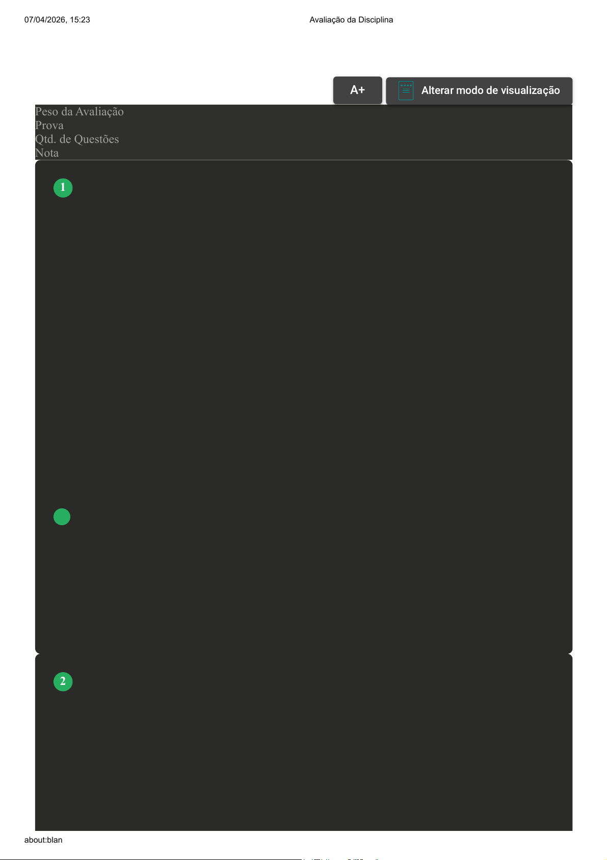 Prova Impressa GABARITO | Avaliação da Disciplina (Cod.:809955) Peso da Avaliação 10,00 Prova 110748241 Qtd. de Questões 20 Nota 10,00 Miranda (2016) defende o trabalho pedagógico criativo por meio da realização pedagógica engajada em valiosos desenvolvimentos e aprendizagens dos estudantes. Podem ser atividades originais ou (re)adaptadas, com novidades, metodologicamente planejadas que permitam suas avaliações de impacto nos níveis de desenvolvimento e aprendizagem dos alunos. MIRANDA, Simão de. Estratégias Didáticas para Aulas Criativas. 1 ed. Campinas: Papirus, 2016. Sobre as táticas para a realização de um trabalho pedagógico criativo, classifique V para as sentenças verdadeiras e F para as falsas. ( ) Realizar um trabalho pedagógico flexível. ( ) Considerar os inúmeros estilos de aprendizagem. ( ) Realizar perguntas originais e interessantes na ação pedagógica. ( ) Incentivar a autoavaliação e independência dos estudantes. Assinale a alternativa que apresenta a sequência CORRETA: A F – V – V – F B V – V – V – V. C V – F – F – V. D V – F – V – F. “Uma teoria coerente da alfabetização exigiria uma articulação e integração dos estudos e pesquisas a respeito de suas diferentes facetas” (SOARES, 2020, p. 20), ou seja, uma teoria desenvolvida por meio de estudos multidisciplinares, abrangendo principalmente as quatro principais perspectivas que estudam a alfabetização, são elas: psicológica, psicolinguística, sociolinguística e linguística. Magda. Alfabetização e Letramento. 7 ed. São Paulo: Contexto, 2020. Tendo em vista o que você aprendeu sobre estas perspectivas, assinale a alternativa correta: VOLTAR A+Aumentar, FonteAlterar modo de visualização 1 2 07/04/2026, 15:23 Avaliação da Disciplina about:blank 1/13 A Na abordagem linguística a alfabetização trabalha com o uso social da língua para não promover o aprendizado acadêmico. B A abordagem psicolinguística não aborda a compreensão da natureza simbólica onde se encontra a criança. C Na abordagem sociolinguística a alfabetização é vista por meio do uso social da língua, relacionando-se com as diferenças dialetais brasileiras. D A perspectiva psicológica trabalha com os requisitos necessários da alfabetização para os indivíduos aprendem a cantar e a soletrar. Vygotsky criou um trabalho interdisciplinar. Produziu pesquisas no desenvolvimento e estudo da criança. Considerava a disciplina de Pedologia “como sendo a ciência básica do desenvolvimento humano, uma síntese das diferentes disciplinas que estudam a criança” (OLIVEIRA, 1997, p. 20). OLIVEIRA, Marta Kohl de. Vygotsky: aprendizado e desenvolvimento, um processo sócio histórico. 4. ed. São Paulo: Scipione, 1997. Referente as contribuições de Vygotsky para a sociedade, assinale a alternativa CORRETA: A Vygotsky não contribuiu a sociedade com suas pesquisas, pois elas não se aplicam ao campo da alfabetização e letramento. B Vygotsky contribuiu a sociedade por meio de pesquisas direcionadas ao campo da química e da física social. C Vygotsky contribuiu a sociedade com conhecimentos que compreendem os processos de educação em sua integridade. D Vygotsky contribuiu a sociedade com pesquisas destinadas somente a terceira idade e seu comportamento social. Estudamos no primeiro capítulo grandes autores e suas teorias. Dentre eles encontram-se John Dewey, Dermeval Saviani e Lev Vygotsky. Todos contribuíram significativamente à educação, pois criaram pensamentos que somam à didática e metodologias educacionais utilizadas na contemporaneidade. Nesse aspecto relacione cada pesquisador às suas teorias. I – John Dewey. 3 4 07/04/2026, 15:23 Avaliação da Disciplina about:blank 2/13 II – Dermeval Saviani. III – Lev Vygotsky. ( ) Educação progressiva. ( ) Teoria histórico cultural. ( ) Teoria histórico crítica. Assinale a alternativa que apresenta a sequência CORRETA: A I – I – II. B III – II – I. C I – III – II. D I – II – III. Juntamente a David Ausubel, na década de 1960, o pesquisador e professor Edgar Dale, criou um estudo sobre as diferentes modalidades de ensino de acordo suas efetividades, conhecido no Brasil como a Pirâmide da Aprendizagem. Miranda (2016) adaptou a pirâmide de acordo a realidade brasileira MIRANDA, Simão de. Estratégias Didáticas para Aulas Criativas. 1 ed. Campinas: Papirus, 2016. Sobre a Pirâmide da Aprendizagem, classifique V para as sentenças verdadeiras e F para as falsas. ( ) As estratégias situadas mais no topo da pirâmide, tem menores possibilidades de ação. ( ) As estratégias passivas estão totalmente associadas ao método tradicional de ensino. ( ) Estratégias e práticas mais consistentes e produtivas resultam em habilidades ativas. ( ) A Pirâmide torna-se incentivo, fazendo os professores insistirem em didáticas criativas. Assinale a alternativa que apresenta a sequência CORRETA: A V – V – V – V. B F – V – V – F C V – F – V – F. 5 07/04/2026, 15:23 Avaliação da Disciplina about:blank 3/13 D V – F – F – V. Os significados socialmente externos, também conhecidos por marcas externas, transformam-se em processos internos na medida em que um indivíduo vai aprendendo. O momento em que os signos, por quaisquer fatores externos, passam a fazer parte do eu de cada indivíduo. Na sala de aula é quando o aluno aprende e interioriza os conteúdos e atividades, carregando-os consigo no cotidiano por meio de representações mentais que substituem objetos do mundo real. Vygotsky chama esse processo de INTERNALIZAÇÃO. Marque verdadeiro ou falso: ( ) Considera-se como processo de internalização o momento em que os signos, por quaisquer fatores externos, passam a fazer parte do eu de cada indivíduo. ( ) Considera-se como processo de internalização o aprendizado do estudante, no momento em que ele leva ao seu cotidiano os conteúdos aprendidos em sala. ( ) Processo de i