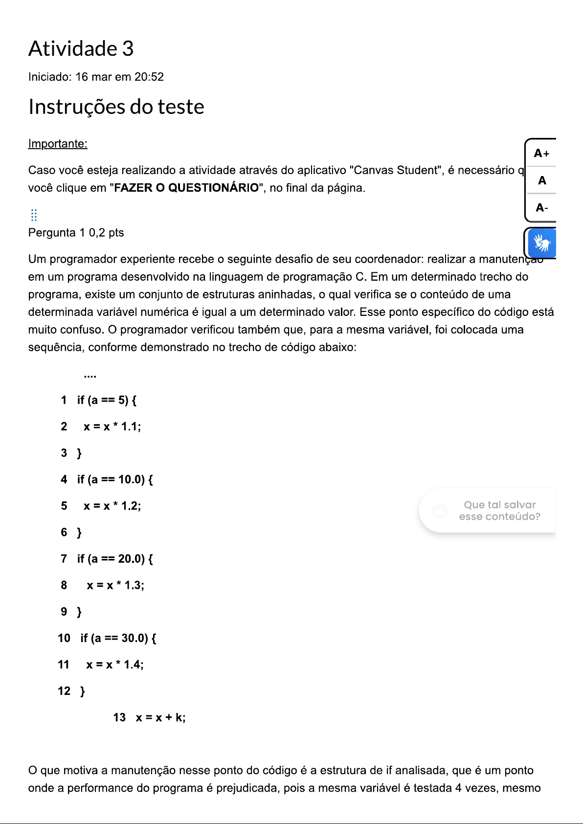 Atividade 3 Iniciado: 16 mar em 20:52 Instruções do teste Importante: A+ Caso você esteja realizando a atividade através do aplicativo "Canvas Student", é necessário q A você clique em "FAZER QUESTIONÁRIO", no final da página. A- Pergunta 1 0,2 pts Um programador experiente recebe seguinte desafio de seu coordenador: realizar a manutenção em um programa desenvolvido na linguagem de programação C. Em um determinado trecho do programa, existe um conjunto de estruturas aninhadas, qual verifica se conteúdo de uma determinada variável numérica é igual a um determinado valor. Esse ponto específico do código está muito confuso. programador verificou também que, para a mesma variável, foi colocada uma sequência, conforme demonstrado no trecho de código abaixo: 1 if (a == 5) { 2 3 } 4 if (a == 10.0) 5 Que tal salvar esse conteúdo? 6 } 7 if (a 20.0) { 8 9 } 10 if (a == 30.0) { 11 12 } 13 que motiva a manutenção nesse ponto do código é a estrutura de if analisada, que é um ponto onde a performance do programa é prejudicada, pois a mesma variável é testada 4 vezes, mesmoque o resultado do primeiro if já tenha sido verdadeiro. Considerando as informações apresentadas, assinale a opção correta: programador pode alterar toda a sequência de if por uma estrutura SWITCH. Nesse sentido, as anomalias de performance e clareza de código seriam resolvidas com comando SWITCH. A+ programador deverá alterar programa por um único comando if, compondo as 4 relações com os operad lógicos && e A Para resolver o problema de 4 testes obrigatórios, deve-se colocar o comando goto onde deverá estar localiz A- ao final do último teste if. programador deverá alterar programa somente por outra estrutura if-else-if, pois a linguagem não disponibiliza outro recurso para esse fim. Para resolver o problema de 4 testes obrigatórios, deve-se colocar o comando return no bloco de comando verdadeiro de cada if, com isso, programa atenderá à condição e não fará a verificação do próximo if. Pergunta 2 0,2 pts A pseudolinguagem é um conjunto de elementos que são usados para descrever um algoritmo. Estes elementos incluem palavras-chave, símbolos, instruções e variáveis. uso destes elementos ajuda a tornar o algoritmo mais compreensível para usuários comuns, pois eles são mais fáceis de serem interpretados do que código de programação. Além disso, a pseudolinguagem também pode ser usada para ajudar a identificar erros no algoritmo antes que o código seja escrito aqui, é importante compreender a estrutura de um algoritmo e conceito de Que tal salvar esse conteúdo? A partir disso, assinale a alternativa que melhor descreve conceito de "palavra reservada": Termos que devem ser obrigatoriamente utilizados ao desenvolver seu código. Termos que são escolhidos pelo desenvolvedor como os principais dentro de seu código. Termos considerados indesejáveis por serem derivados de uma linguagem não-formal. Termos que devem ser evitados, não podendo ser utilizados para nomear variáveis. Termos que servem para designar os elementos que compõem a estrutura de um algoritmo. Pergunta 3 0,2 ptsO laço de repetição é um recurso da lógica de programação imprescindível para o controle de fluxo de um programa. Em linguagem C, podemos utilizar três comandos que atendem perfeitamente a esse recurso, que são os for, while e do-while. A estrutura de repetição for tem por objetivo executar um bloco de comando, por um certo número de vezes, controlado por uma variável específica para esse fim. Sugerido quando o número de repetições é controlado por uma variável controladora ou quando houver a necessidade de inicialização e atualização. A+ Considerando as informações apresentadas, avalie as afirmações a seguir: A A- I. Para determinada situação que necessita de um laço de repetição, podemos utilizar qua um dos os três comados em (for, while ou do-while), porém, do ponto de vista lógico, e de performance, são recomendados comandos específicos para determinados tipos de problema. II. comando do-while é bastante recomendável quando se fizer necessário executar um bloco pelo menos uma vez e após a primeira vez. III. No comando while, se a condição for falsa na entrada do laço de repetição, bloco não é executado nenhuma vez, o que faz com que laço não seja executado. É correto que se afirma, apenas, em: II, apenas. III, apenas. Que tal salvar esse conteúdo? III, apenas. e III. apenas. Pergunta 4 0,2 pts Leia texto e analise a figura: paradigma de programação estruturada defende que todo processamento pode ser realizado pelo uso de três tipos de estruturas: sequencial, condicional e de repetição.A+ + Condição 1 Condição 2 Condição n A A- BLOCO DE BLOCO DE BLOCO DE COMANDO 1 COMANDO 2 COMANDO n Considerando o texto e imagem acima, assim como conteúdo visto, avalie as afirmações a seguir: I. A figura refere-se a uma estrutura de decisão, onde várias condições levam a vários possíveis caminhos, sendo um verdadeiro e os demais falsos. II. Nessa estrutura bloco de operações executado será aquele correspondente à condição solicitada, sendo que o algoritmo irá executar somente um único bloco de comando para gerar a saída. Que tal salvar III. Esta estrutura realiza uma repetição (looping), sendo iniciada pelo esse conteúdo? comandos e, em sequência, testando a condição de parada. Aqui, bloco executado enquanto a condição for verdadeira. Considerando as afirmações, é correto que se afirma, apenas, em: II. ? III.Pergunta 5 0,2 pts A linguagem de programa possui um conjunto de testes condicionais que determinam o curso da ação. Uma expressão condicional chega a um valor verdadeiro ou falso. Isso permite que uma ampla gama de rotinas seja codificada de forma extremamente eficiente. suporta dois tipos de comando de seleção: os comandos if e switch. Além disso, operador ? (símbolo para operador ternário) 