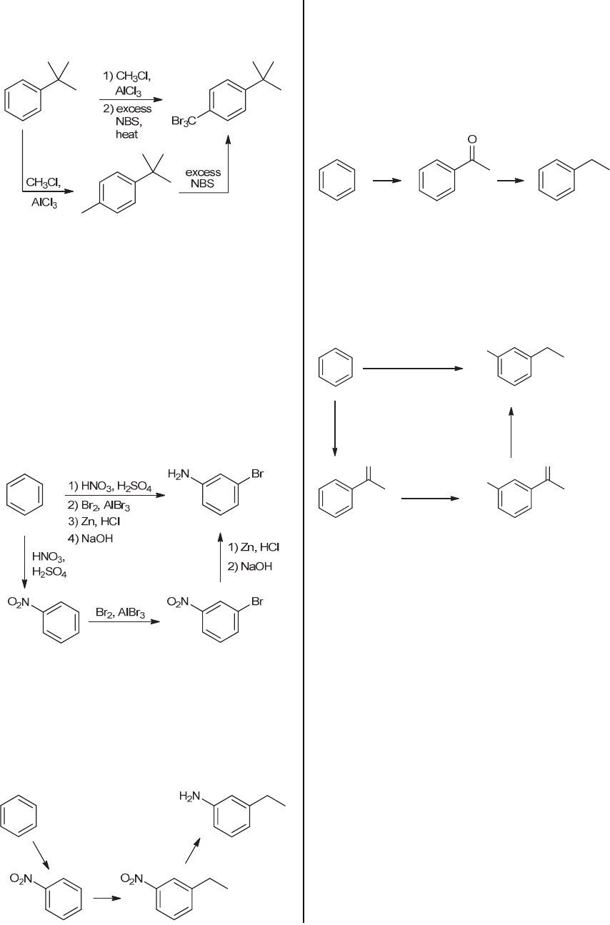 CHAPTER 18 675 not have any benzylic protons, so no bromine atoms are installed in that location. Only the methyl group undergoes benzylic bromination (exhaustively), as shown: 18.53. (a) Installation of the amino group requires a two-step process (nitration, followed by reduction), while installation of the bromine atom can be achieved in just one step. Now let’s consider the order of events. These two groups must be installed in a meta fashion, but both groups are ortho-para directors. Installation of these two groups (in either order) does not appear to give the desired meta substitution pattern. However, recall that installation of the amino group requires two steps. The first step is nitration, and a nitro group is a meta-director. So, we can achieve the desired transformation by performing the bromination process after the nitration process but before the reduction process, as shown here: (b) Installation of the amino group requires two steps (nitration, followed by reduction), while installation of the ethyl group can be achieved in just one step (via a Friedel-Crafts alkylation). The substituents must be installed in a meta fashion, yet both substituents are ortho-para directors. To circumvent the problem, we consider utilizing the meta-directing effects of the nitro group to achieve the desired regiochemical outcome: However, this strategy will not succeed because the middle step is flawed. Specifically, a Friedel-Crafts alkylation cannot be performed on a strongly deactivated ring (such as nitrobenzene). Therefore, we must find another way to install the two groups in a meta fashion. The trick that we used in the solution to Problem 19.57a can be used here again. That is, we install the ethyl group via a two-step process (Friedel-Crafts acylation, followed by reduction): By installing the ethyl group in this way, we can capitalize on the directing effects of the carbonyl group, before reducing it. As seen below, a Friedel-Crafts acylation installs an acyl group, which is a meta-director. Subsequent nitration allows for the installation of a nitro group in the meta position. And finally, reduction (of both groups) gives the product, as shown. H2N 1) CH3COCl, AlCl3 2) HNO3, H2SO4 3) HCl, Zn(Hg), heat CH3COCl, AlCl3 O HNO3, O O2N 1) HCl, Zn(Hg), heat H2SO4 2) NaOH 4) NaOH 18.54. (a) The second step of the synthesis will not work, because a strongly deactivated ring will not undergo a Friedel-Crafts alkylation. The product of the first step, nitrobenzene, will be unreactive in the second step. (b) The second step of the synthesis will not efficiently install a propyl group, because a carbocation rearrangement can occur, which can result in the installation of an isopropyl group. A mixture of products is expected. (c) The second step of the synthesis will not install the acyl group in the meta position. It will be installed in a position that is either ortho or para to the bromine atom. (d) The second step of the synthesis will not install the bromine atom in the ortho position, because of steric hindrance from the tert-butyl group. Bromination will occur primarily at the para position. 18.55. (a) This compound has two aromatic rings, each of which is monosubstituted. One aromatic ring (left) is connected directly to a carbonyl group and is therefore deactivated. The other aromatic ring (right) is connected to a methylene group (CH2) and is therefore activated (the substituent is treated like an alkyl group). So, we expect monobromination to occur on the activated ring. www.MyEbookNiche.eCrater.com