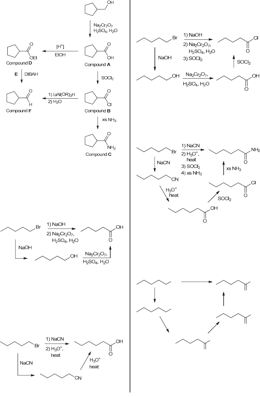 CHAPTER 20 801 20.49. (a) This transformation does not involve a change in the carbon skeleton. Only the identity of the functional group must be changed. To accomplish this transformation, the starting material can be treated with NaOH to give 1-pentanol via an SN2 reaction. Subsequent oxidation of the primary alcohol gives the desired carboxylic acid. (b) This transformation involves a change in the carbon skeleton (one extra carbon atom must be inserted), as well as a change in the identity and location of the functional group. To accomplish this transformation, the starting material can be treated with NaCN, thereby converting 1-bromopentane into hexanenitrile via an SN2 reaction. Subsequent acid catalyzed hydrolysis of the nitrile (upon treatment with aqueous acid) gives hexanoic acid. (c) First, 1-bromopentane can be converted into pentanoic acid in just two steps, as shown in the solution to part (a) of this problem. Then, treating this carboxylic acid with SOCl2 will give the desired acid chloride. (d) First, 1-bromopentane can be converted into hexanoic acid in just two steps, as shown in the solution to part (b) of this problem. Then, this carboxylic acid can be converted into an acid halide, followed by treatment with excess ammonia to give the desired product: (e) First, 1-bromopentane can be converted into pentanoic acid in just two steps, as shown in the solution to part (a) of this problem. This carboxylic acid can then be converted into an acid halide, followed by treatment with excess ammonia to give the desired product: OH O Br OH NaOH Na2Cr2O7, H2SO4, H2O Cl O NH2 O SOCl2 xs NH33) SOCl2 4) xs NH3 1) NaOH 2) Na2Cr2O7, H2SO4, H2O (f) First, 1-bromopentane can be converted into hexanoic acid in just two steps, as shown in the solution to part (b) of this problem. Upon treatment with ethanol in acid-catalyzed conditions, the carboxylic acid can be www.MyEbookNiche.eCrater.com
