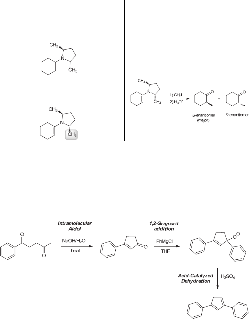 CHAPTER 21 901 21.109. (a) Only one isomer of the enamine forms due to rotational symmetry possessed by the secondary amine. Due to this symmetry property, the two possible conformational isomers for this enamine are equivalent. (b) When the enamine in part (a) reacts with methyl iodide, the methyl group closer to the carbon atom of the enamine is oriented below the plane of the page. So, approach by the electrophile from that direction is hindered, resulting in (R)-2-methylcyclohexanone being the minor product. In contrast, since the approach of methyl iodide from the top face of the page is unimpeded by this substituent, (S)-2-methylcyclohexanone is the major product. And since this is the only isomer of the enamine undergoing alkylation, the S-enantiomer is the major product formed. This means that the rotational symmetry of the starting secondary amine is responsible for the % ee achieved. 21.110. While there are three alpha positions in the molecule, deprotonation at only one of them (the terminal methyl group) will lead to the formation of a 5-membered ring. The first reaction is a base-catalyzed, intramolecular aldol condensation reaction, affording an -unsaturated ketone. Addition of the Grignard reagent phenylmagnesium chloride gives an alkoxide ion. Treatment with sulfuric acid causes protonation of the alkoxide ion, followed by acid- catalyzed dehydration to afford the highly conjugated diene shown below. www.MyEbookNiche.eCrater.com
