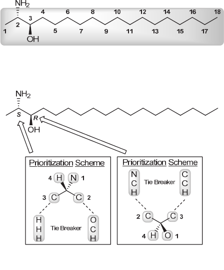 APPENDIX Nomenclature of Polyfunctional Compounds A.1. This compound is a primary amine because there is only one alkyl group attached to the nitrogen, but it also has a hydroxyl group. Because alcohol functionalities have a higher suffix priority than amine groups, the compound will be named as an alcohol, and the amine will be named as a substituent (an amino group). Referencing Table 4.1, we can infer that an 18-carbon chain is called an octadecane, so this alcohol is an octadecanol. Numbering from left to right gives the alcohol and the amine the lowest possible numbers. The name so far is 2-amino-3-octadecanol (or 2-aminoctadecan-3-ol using the new IUPAC rules). Lastly, the configuration of each chiral center must be specified. The full IUPAC name is thus (2S,3R)-2-amino-3-octadecanol. www.MyEbookNiche.eCrater.com