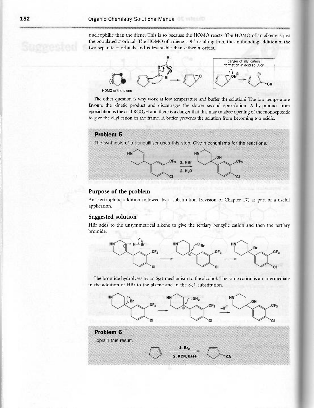 152 Organic Chemistry Solutions Manual nucleophilic than the diene. This is so because the HOMO reacts. The HOMO of an alkene is just the populated π orbital. The HOMO of a diene is resulting from the antibonding addition of the two separate π orbitals and is less stable than either π orbital. R danger of allyl cation formation in acid solution D H OH HOMO of the diene The other question is why work at low temperature and buffer the solution? The low temperature favours the kinetic product and discourages the slower second epoxidation. A by-product from epoxidation is the acid H and there is a danger that this may catalyse opening of the monoepoxide to give the allyl cation in the frame. A buffer prevents the solution from becoming too acidic. Problem 5 The synthesis of a tranquillizer uses this step. Give mechanisms for the reactions. HN HN CF₃ 1. HBr CF₃ 2. CI CI Purpose of the problem An electrophilic addition followed by a substitution (revision of Chapter 17) as part of a useful application. Suggested solution HBr adds to the unsymmetrical alkene to give the tertiary benzylic cation and then the tertiary bromide. HN H Br HN Br HN Br CF₃ CF₃ CF₃ CI CI CI The bromide hydrolyses by an SN1 mechanism to the alcohol. The same cation is an intermediate in the addition of HBr to the alkene and in the SN 1 substitution. HN HN HN Br CF₃ CF₃ CF₃ CI CI CI Problem 6 Explain this result. 1. Br₂ 2. KCN, base CN