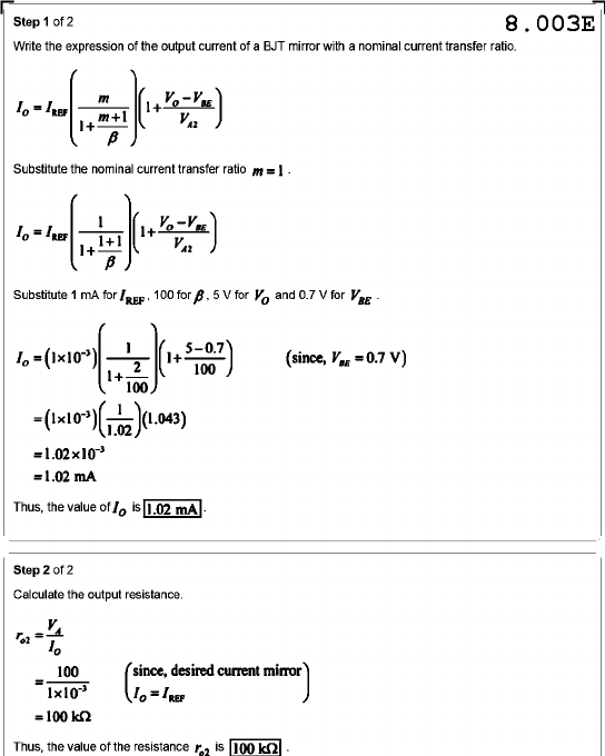Step 1 of 2 8.003E Write the expression of the output current of a BJT mirror with a nominal current transfer ratio. Substitute the nominal current transfer ratio Substitute 1 mA for 100 for 5V for and 0.7 V for (since, =1.02x10⁻³ =1.02 mA Thus, the value of is 1.02 mA Step 2 of 2 Calculate the output resistance. desired current mirror) Thus, the value of the resistance is 100