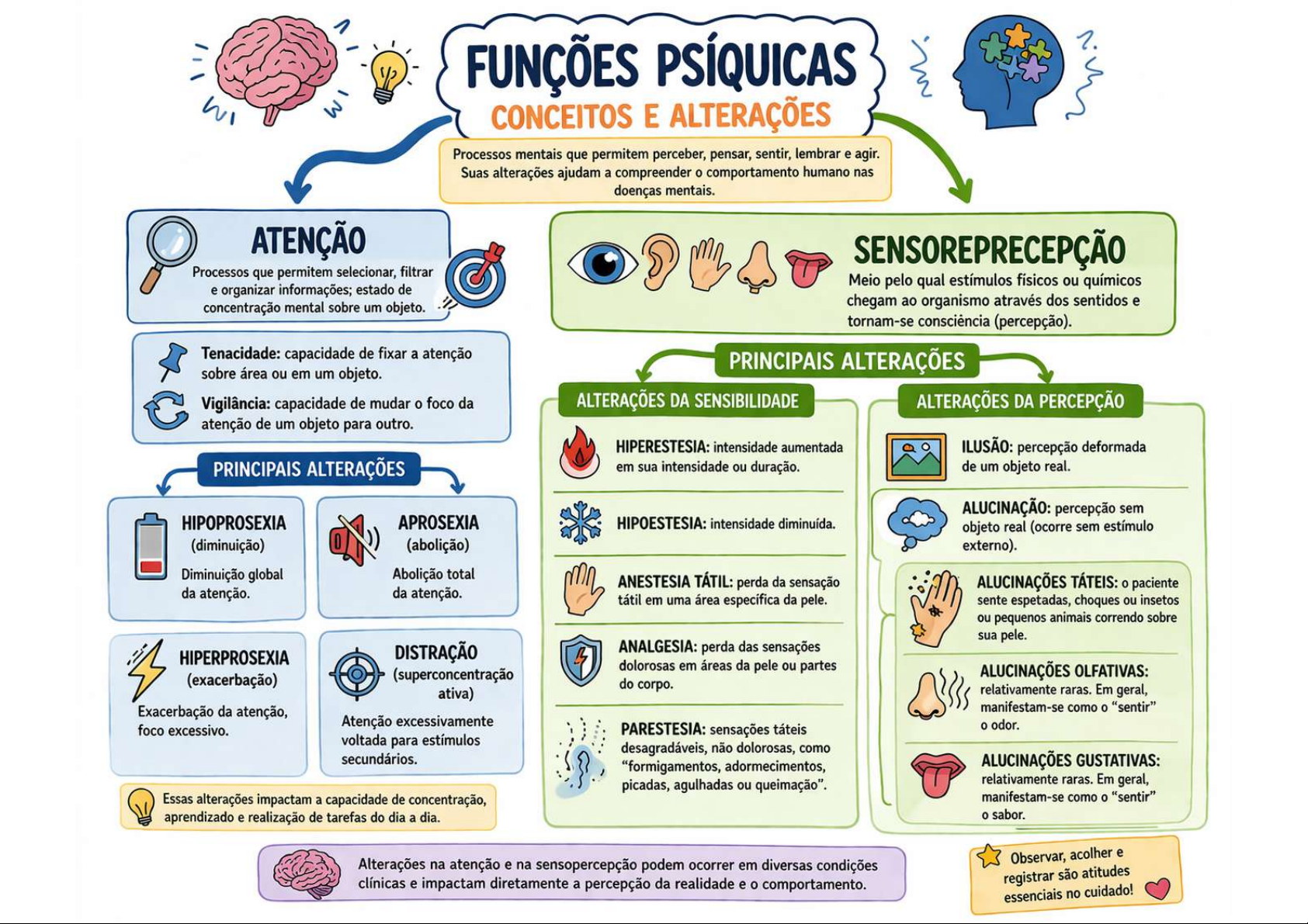 FUNÇÕES PSÍQUICAS CONCEITOS E ALTERAÇÕES Processos mentais que permitem perceber, pensar, sentir, lembrar e agir. Suas alterações ajudam a compreender comportamento humano nas doenças mentais. ATENÇÃO SENSOREPRECEPÇÃO Processos que permitem selecionar, filtrar Meio pelo qual estímulos físicos ou químicos e organizar informações; estado de concentração mental sobre um objeto. chegam ao organismo através dos sentidos e tornam-se (percepção). Tenacidade: capacidade de fixar a atenção PRINCIPAIS ALTERAÇÕES sobre área ou em um objeto. Vigilância: capacidade de mudar foco da ALTERAÇÕES DA SENSIBILIDADE ALTERAÇÕES DA PERCEPÇÃO atenção de um objeto para outro. HIPERESTESIA: intensidade aumentada ILUSÃO: percepção deformada PRINCIPAIS ALTERAÇÕES em sua intensidade ou duração. de um objeto real. ALUCINAÇÃO: percepção sem HIPOPROSEXIA APROSEXIA HIPOESTESIA: intensidade diminuída. objeto real (ocorre sem estímulo (diminuição) (abolição) externo). Diminuição global Abolição total ANESTESIA TÁTIL: perda da sensação ALUCINAÇÕES TÁTEIS: paciente da atenção. da atenção. tátil em uma área específica da pele. sente espetadas, choques ou insetos ou pequenos animais correndo sobre sua pele. HIPERPROSEXIA DISTRAÇÃO ANALGESIA: perda das sensações dolorosas em áreas da pele ou partes (exacerbação) (superconcentração ALUCINAÇÕES OLFATIVAS: do corpo. ativa) relativamente raras. Em geral, Exacerbação da atenção, manifestam-se como "sentir" foco excessivo. Atenção excessivamente PARESTESIA: sensações táteis odor. voltada para estímulos desagradáveis, não dolorosas, como secundários. "formigamentos, adormecimentos, ALUCINAÇÕES GUSTATIVAS: picadas, agulhadas ou queimação". relativamente raras. Em geral, Essas alterações impactam a capacidade de concentração, manifestam-se como o "sentir" aprendizado e realização de tarefas do dia a dia. sabor. Observar, acolher e Alterações na atenção e na sensopercepção podem ocorrer em diversas condições clínicas e impactam diretamente a percepção da realidade e comportamento. registrar são atitudes essenciais no cuidado!