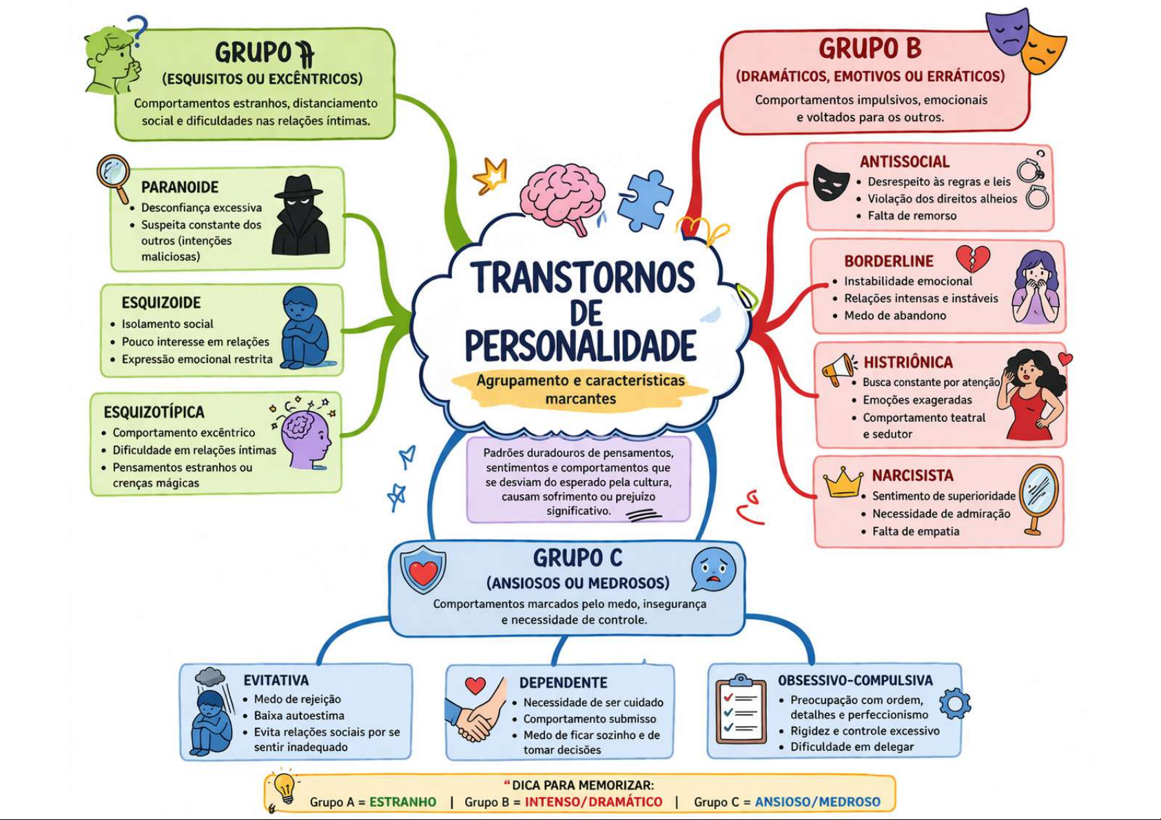 GRUPO GRUPO B (ESQUISITOS OU EXCÊNTRICOS) (DRAMÁTICOS, EMOTIVOS ou ERRÁTICOS) Comportamentos estranhos, distanciamento Comportamentos impulsivos, emocionais social e dificuldades nas relações íntimas. e voltados para os outros. ANTISSOCIAL PARANOIDE Desrespeito às regras e leis Violação dos direitos alheios Desconfiança excessiva Falta de remorso Suspeita constante dos outros (intenções maliciosas) BORDERLINE TRANSTORNOS Instabilidade emocional ESQUIZOIDE Relações intensas e instáveis DE Medo de abandono Isolamento social Pouco interesse em relações PERSONALIDADE Expressão emocional restrita HISTRIÔNICA Agrupamento e características Busca constante por atenção marcantes Emoções exageradas ESQUIZOTÍPICA Comportamento teatral Comportamento excêntrico e sedutor Dificuldade em relações íntimas Padrões duradouros de pensamentos, Pensamentos estranhos ou sentimentos e comportamentos que NARCISISTA crenças mágicas se desviam do esperado pela cultura, causam sofrimento ou prejuizo Sentimento de superioridade significativo. Necessidade de admiração Falta de empatia GRUPO (ANSIOSOS ou MEDROSOS) Comportamentos marcados pelo medo, insegurança e necessidade de controle. EVITATIVA DEPENDENTE OBSESSIVO-COMPULSIVA Medo de rejeição Necessidade de ser cuidado Preocupação com ordem, Baixa autoestima Comportamento submisso detalhes e perfeccionismo Evita relações sociais por se Medo de ficar sozinho e de Rigidez e controle excessivo sentir inadequado tomar decisões Dificuldade em delegar DICA PARA MEMORIZAR: Grupo A = ESTRANHO Grupo = INTENSO/DRAMÁTICO Grupo = ANSIOSO/MEDROSO