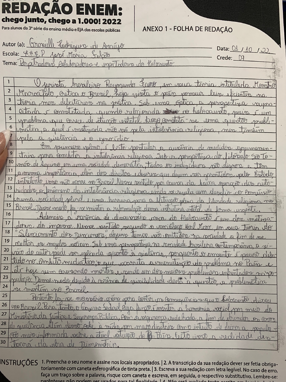 REDAÇÃO ENEM: chego junto, chego a 1.000! 2022 Para alunos da série do ensino médio e EJA das escolas públicas ANEXO 1 - FOLHA DE REDAÇÃO Autor (a): de Data: Escola: Maria Crede: 09 Tema: do 1 surista Raymundo teoria 2 critica Bronil hoja D pain lein na 3 teoria na a 4 citada 5 relacionada um 5 uproblema que de uma 6 matica, tombem a 8 Em primeiro liato postular a de 9 tain pora a Sub a Soo To- 10 de Aquino em uma tim 11 a don deveren que pelo 12 13 inno no sentido per ola bauca auto- ainda me revela um Cometrio 14 sociedade plurd uma pora a plena da religiona no 15 16 me mister a dema de forma urgente. Ademains carincia de do um 17 do D Korl teoria do 18 don a me 19 mozelon Sub contemporanea, a 20 21 do autor piede sper quonto tido ambito scarrita problema no Pain e 22 23 ate um devido à de dada a 24 no 25 pora conter on D 26 no Para donto, D a per do 27 28 Publica, a fim de on de Atem midia intuits a 29 main informada a do a redidade 30 teara da INSTRUÇÕES 1. Preencha o seu nome e assine nos locais apropriados. I 2. A transcrição da sua redação dever ser fetia obriga- toriamente com caneta esferográfica de tinta preta. I 3. Escreva a sua redação com letra legível. No caso de erro, faça um traço sobre a palavra, risque com caneta e escreva, em seguida, o respectivo substitutivo. Lembre-se: parênteses não ser usados tal Não será texto escrito