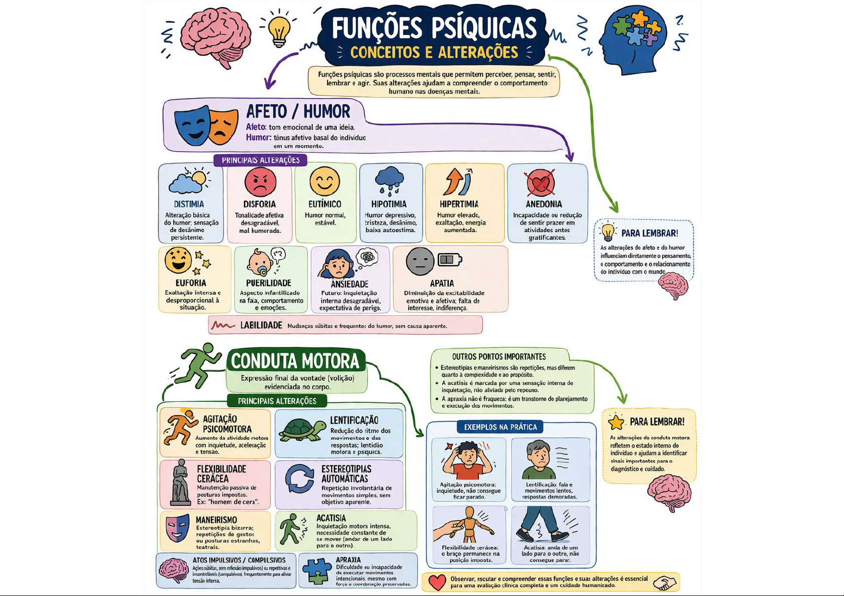 FUNÇÕES PSÍQUICAS CONCEITOS E ALTERAÇÕES Funções psíquicas são processos mentais que permitem perceber, pensar, sentir, lembrar e agir. Suas alterações ajudam a compreender comportamento humano nas doenças mentais. AFETO / HUMOR Afeto: tom emocional de uma ideia. Humor: tônus afetivo basal do individuo em um momento. PRINCIPAIS ALTERAÇÕES DISTIMIA DISFORIA EUTÍMICO HIPOTIMIA HIPERTIMIA ANEDONIA Alteração básica Tonalidade afetiva Humor normal, Humor depressivo, Humor elevado, Incapacidade ou redução do humor; sensação desagradável, estável. tristeza, energia de sentir prazer em de desânimo mal humorada. baixa autoestima. aumentada. atividades antes PARA LEMBRAR! persistente. gratificantes. As alterações do afeto e do humor influenciam diretamente o pensamento, 0 comportamento e relacionamento do indivíduo com mundo EUFORIA PUERILIDADE ANSIEDADE APATIA Exaltação intensa e Aspecto infantilizado Futuro: inquietação Diminuição da excitabilidade desproporcional à na fala, comportamento interna desagradável, emotiva e afetiva; falta de situação. e emoções. expectativa de perigo. interesse, indiferença. LABILIDADE Mudanças súbitas e frequentes do humor, sem causa aparente. CONDUTA MOTORA OUTROS PONTOS IMPORTANTES Estereotipias e maneirismos são repetições, mas diferem Expressão final da vontade (volição) quanto à complexidade e ao propósito. evidenciada no corpo. A acatisia é marcada por uma sensação interna de inquietação, não aliviada pelo repouso. PRINCIPAIS ALTERAÇÕES A apraxia não é fraqueza: é um transtorno do planejamento e execução dos movimentos. AGITAÇÃO LENTIFICAÇÃO PARA LEMBRAR! PSICOMOTORA EXEMPLOS NA PRÁTICA Redução do ritmo dos Aumento da atividade motora movimentos e das As alterações da conduta motora com inquietude, aceleração respostas; lentidão refletem estado interno do e motora e psiquica. individuo e ajudam a identificar sinais importantes para FLEXIBILIDADE ESTEREOTIPIAS diagnóstico e CERÁCEA AUTOMÁTICAS Manutenção passiva de Agitação psicomotora: Lentificação: fala e Repetição involuntária de inquietude, não consegue movimentos lentos, posturas impostas. movimentos simples, sem ficar parado. respostas demoradas. Ex: "homem de cera". objetivo aparente. MANEIRISMO ACATISIA Estereotipia bizarra; Inquietação motora intensa, repetições de gestos necessidade constante de ou posturas estranhas, se mover (andar de um lado teatrais. para outro). Flexibilidade cerácea: Acatisia: anda de um o braço permanece na lado para o outro, não ATOS IMPULSIVOS / COMPULSIVOS APRAXIA posição imposta. consegue parar. Ações súbitas, sem (impulsivos) ou repetitivas Dificuldade ou incapacidade incontroliveis frequentemente para afiviar de executar movimentos tensão interna. mesmo com Observar, escutar e compreender essas funções e suas alterações é essencial força e coordenação preservadas. para uma avaliação clínica completa e um cuidado humanizado.