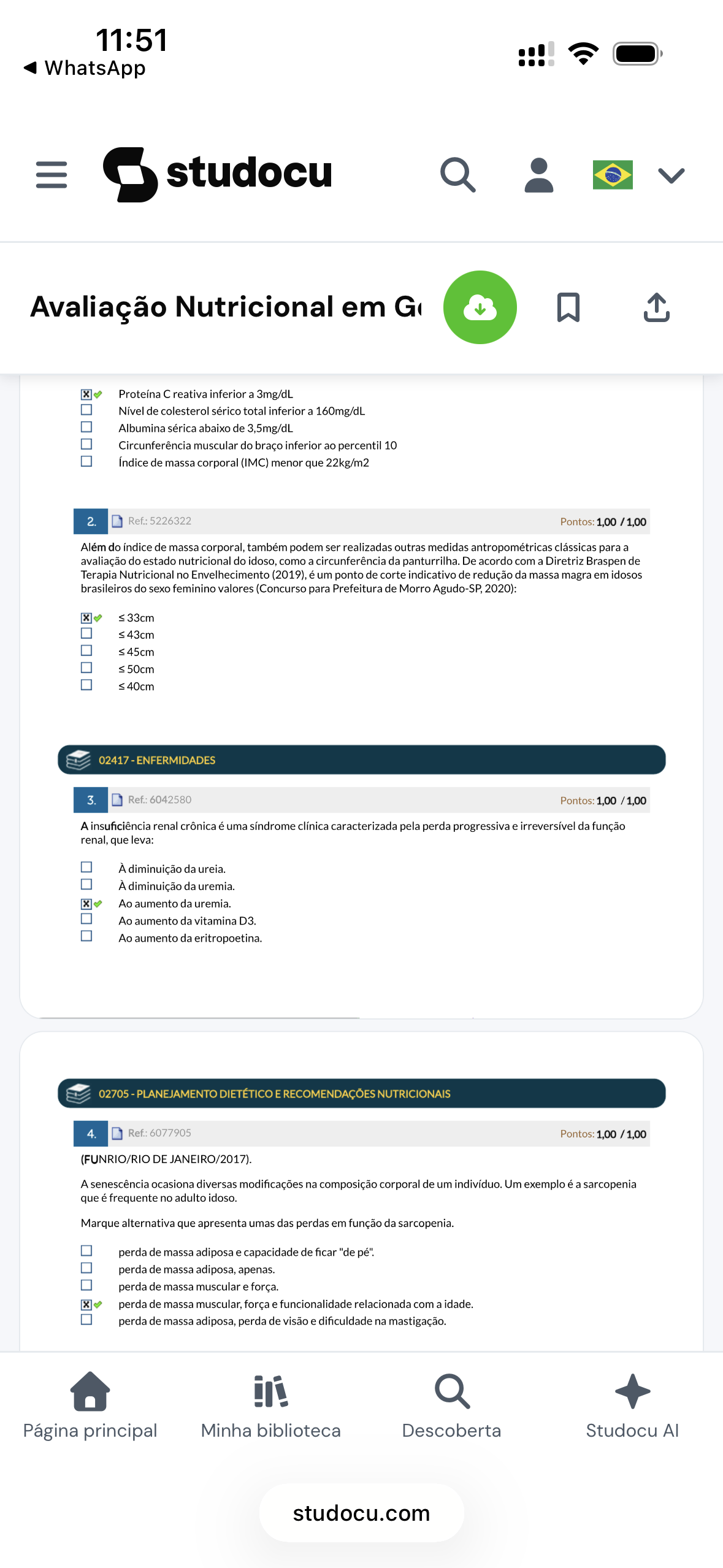 11:51 WhatsApp studocu Avaliação Nutricional em G Proteína reativa inferior a 3mg/dL Nível de colesterol sérico total inferior a 160mg/dL Albumina sérica abaixo de 3,5mg/dL Circunferência muscular do braço inferior ao percentil 10 Índice de massa corporal (IMC) menor que 22kg/m2 2. Ref.: 5226322 Pontos: Além do índice de massa corporal, também podem ser realizadas outras medidas antropométricas clássicas para a avaliação do estado nutricional do idoso, como a circunferência da panturrilha. De acordo com a Diretriz Braspen de Terapia Nutricional no Envelhecimento (2019), é um ponto de corte indicativo de redução da massa magra em idosos brasileiros do sexo feminino valores (Concurso para Prefeitura de Morro Agudo-SP, 2020): ≤ 33cm 43cm 45cm 50cm 40cm 02417 ENFERMIDADES 3. Ref.: 6042580 Pontos: A insuficiência renal crônica é uma síndrome clínica caracterizada pela perda progressiva e irreversível da função renal, que leva: À diminuição da ureia. À diminuição da uremia. Ao aumento da uremia. Ao aumento da vitamina D3. Ao aumento da eritropoetina. 02705 PLANEJAMENTO DIETÉTICO E RECOMENDAÇÕES NUTRICIONAIS 4. Ref.: 6077905 Pontos: (FUNRIO/RIO DE JANEIRO/2017). A senescência ocasiona diversas modificações na composição corporal de um indivíduo. Um exemplo é a sarcopenia que é frequente no adulto idoso. Marque alternativa que apresenta umas das perdas em função da sarcopenia. perda de massa adiposa e capacidade de ficar "de pé". perda de massa adiposa, apenas. perda de massa muscular e força. perda de massa muscular, força e funcionalidade relacionada com a idade. perda de massa adiposa, perda de visão e dificuldade na mastigação. Página principal Minha biblioteca Descoberta Studocu studocu.com