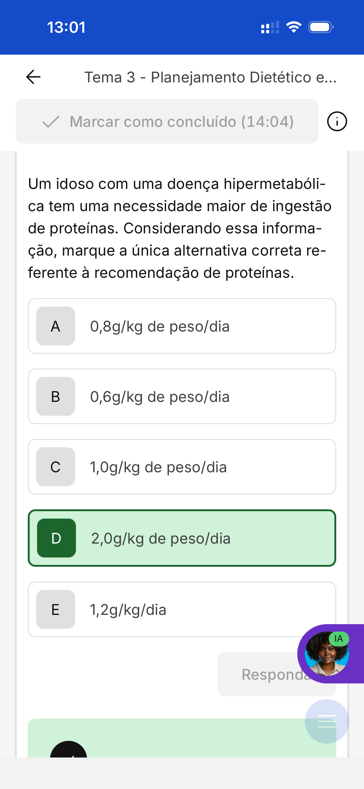 13:01 Tema 3 - Planejamento Dietético e... Marcar como concluído (14:04) i Um idoso com uma doença hipermetabóli- ca tem uma necessidade maior de ingestão de proteínas. Considerando essa informa- ção, marque a única alternativa correta re- ferente à recomendação de proteínas. A 0,8g/kg de peso/dia 0,6g/kg de peso/dia c 1,0g/kg de peso/dia D 2,0g/kg de peso/dia E 1,2g/kg/dia IA Respond
