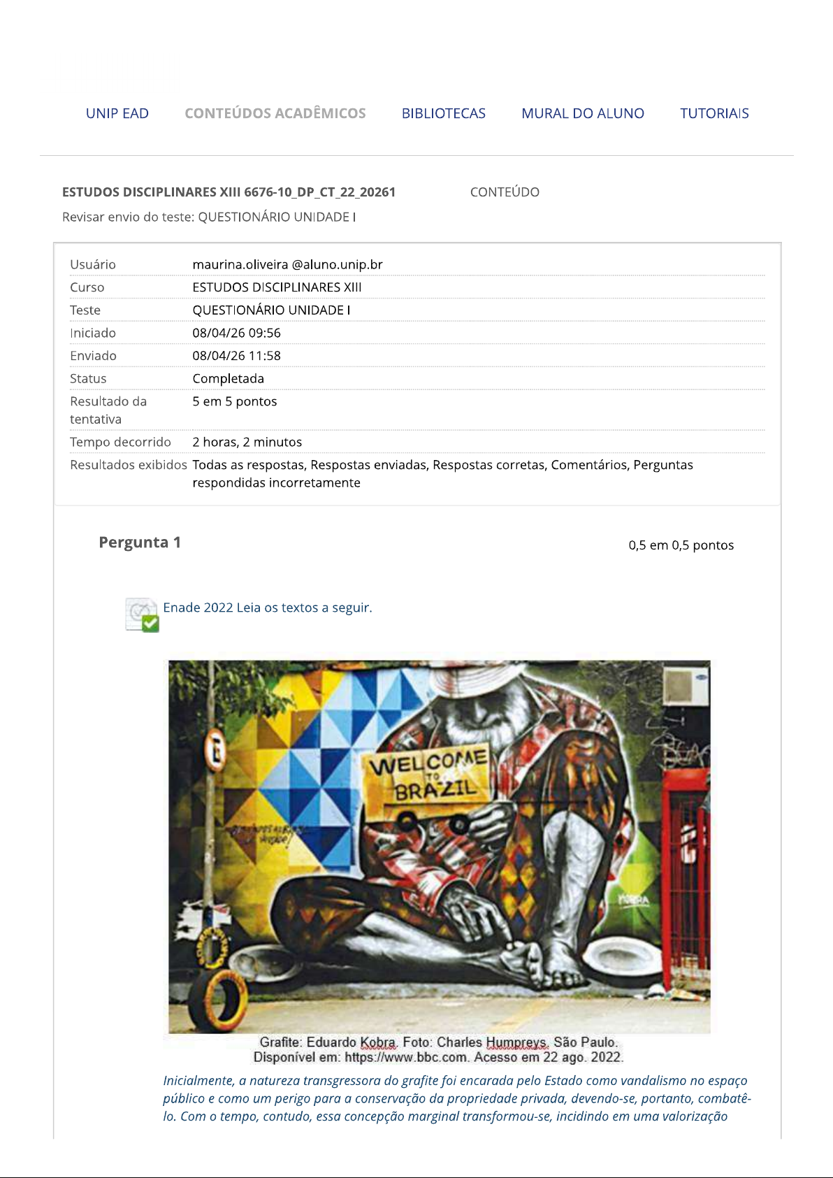 UNIP EAD CONTEÚDOS ACADÊMICOS BIBLIOTECAS MURAL DO ALUNO TUTORIAIS ESTUDOS DISCIPLINARES XIII 6676-10_DP_CT_22_20261 CONTEÚDO Revisar envio do teste: QUESTIONÁRIO UNIDADE I Usuário maurina.oliveira @aluno.unip.br Curso ESTUDOS DISCIPLINARES XIII Teste QUESTIONÁRIO UNIDADE I Iniciado 08/04/26 09:56 Enviado 08/04/26 11:58 Status Completada Resultado da 5 em 5 pontos tentativa Tempo decorrido 2 horas, 2 minutos Resultados exibidos Todas as respostas, Respostas enviadas, Respostas corretas, Comentários, Perguntas respondidas incorretamente Pergunta 1 0,5 em 0,5 pontos Enade 2022 Leia os textos a seguir. WELCOME TO BRAZIL Grafite: Eduardo Kobra. Foto: Charles Humpreys. São Paulo. Disponível em: https://www.bbc.com. Acesso em 22 ago. 2022. Inicialmente, a natureza transgressora do grafite foi encarada pelo Estado como vandalismo espaço público e como um perigo para a conservação da propriedade privada, devendo-se, portanto, combatê- lo. Com tempo, contudo, essa concepção marginal transformou-se, incidindo em uma valorizaçãoaceitável pelo Estado e positiva para a sociedade. Essa transição do grafite, de arte marginal para manifestação artística reconhecida e aceita, tem revelado aspectos importantes não somente para os profissionais do grafite, mas para a sociedade como um todo, pois incorpora a possibilidade de ele ser um produto artístico de valor cultural, econômico e ideológico. PIRES, M.; SANTOS, F.A. A cidade de São Paulo e suas dinâmicas: graffiti, Lei Cidade Limpa e publicidade urbana. Anais do Museu Paulista: História e Cultura Material. V. 26, São Paulo, 2018 (com adaptações). Considerando-se texto e a imagem apresentados, é correto afirmar que grafite consiste em uma: Resposta Selecionada: expressão cultural que problematiza os valores e as relações da sociedade com os espaços onde é produzida. Respostas: a. expressão popular associada à contestação e, por isso, não é reconhecido como arte. b. expressão convencional de hierarquias consolidadas ao longo do tempo e ainda presentes na sociedade. expressão cultural que problematiza os valores e as relações da sociedade com os espaços onde é produzida. d. intervenção urbana que traz prejuízos para a sociedade porque gera conflitos latentes entre diferentes classes sociais. e. intervenção estética realizada com propósito de embelezamento padronizado dos espaços urbanos pelo uso de cores intensas e contrastantes. Comentário da Resposta: resposta: A Alternativa incorreta. grafite é uma expressão popular associada à contestação e, por isso, foi, durante muito tempo, marginalizado. Hoje, esse ponto de vista alterou-se, e essa manifestação passou a ser compreendida como legítima modalidade artística. Alternativa incorreta. Como expressão artística associada à contestação de valores estabelecidos, o grafite contrapõe-se diretamente à expressão convencional das hierarquias sociais consolidadas ao longo do tempo. Alternativa correta. Há profunda correlação entre os grafites e os espaços urbanos onde eles estão inseridos. Nesse sentido, eles devem ser entendidos como manifestações artísticas que procuram problematizar os valores sociais vigentes e hegemônicos. D Alternativa incorreta. Como qualquer manifestação artística, os grafites contribuem para a reflexão e a interação social, na medida em que constituem uma forma de expressão que expõe as diversas tensões sociais latentes à espera de uma solução. E Alternativa incorreta. Há um senso estético imanente aos grafites, mas propósito dessas manifestações artísticas transcende conceito meramente visual e decorativo e estende-se a discussões em torno de questões mais proeminentes nas esferas socioeconômicas, culturais, étnicas, políticas etc.Pergunta 2 0,5 em 0,5 pontos Enade 2021 com adaptações Leia os textos I e a seguir. Texto A hortaliça é feia ou estragada? ! Está estragada: estiver estiver estiver não E feia: estiver do Embrapa Disponível em: Acesso em: 27 maio 2020. Texto Em alguns países da Europa, permite-se que um produto de menor valor estético seja comercializado. Estamos falando de um pepino deformado ou de uma cebola pequena, mas não de um produto contaminado com resíduos químicos ou agentes biológicos. No caso do Brasil, problema vai além da aparência, porque há hortaliças ruins - contaminadas, murchas, machucadas que chegam às bancas para ser comercializadas. Mas, se nos dois contextos há perda de alimentos e preconceito em relação às hortaliças fora do padrão visual, mas boas para consumo, quais seriam as alternativas para evitar desperdício e melhorar a qualidade dos produtos? Para os pesquisadores do assunto, não adianta replicar a experiência europeia no Brasil, de exigir hortaliças esteticamente perfeitas, porque também teríamos produtos sendo desprezados ainda na etapa de produção. Não devemos passar de um mercado pouco exigente, que gera desperdício no varejo e nas residências, para um mercado exigente que gera perda no campo. A solução do problema é conscientizar os diversos elos da cadeia produtiva, especialmente varejistas e consumidores, para que sejam esclarecidos sobre quais aspectos da aparência das hortaliças comprometem a qualidade. Quanto maior a exigência do mercado por hortaliças de aparência perfeita, maior desperdício de alimentos. Por sua vez, quanto maior a exigência por hortaliças sem danos, causados pela falta de cuidado e pela falta de higiene, menor será a perda de alimentos e maior a qualidade da alimentação da população brasileira. Disponível em: cias/-/noticia/29626389/manuseio-c orreto-preserva-a-qualidade-e-a-vida-util-das-hortalicas. Acesso em: 27 maio 2020 (com adaptações). Considerando as informações apresentadas, avalie as asserções e a relação proposta entre elas. texto sintetiza uma informação principal do texto II, ao apresentar critérios para distinguir alterações visuais q