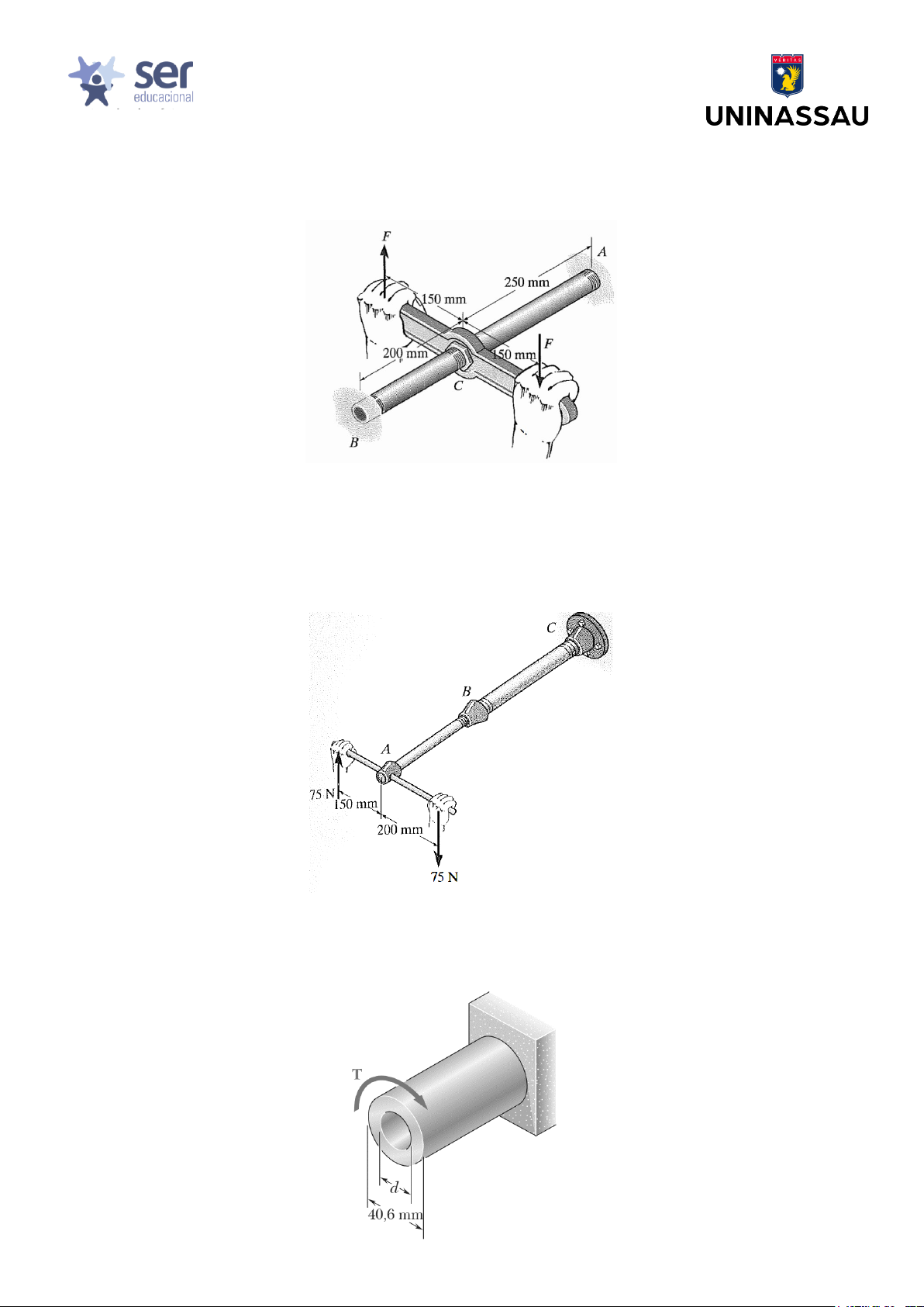 CENTRO UNIVERSITÁRIO DE JUAZEIRO DO NORTE CURSO DE GRADUAÇÃO EM ENGENHARIA CIVIL DISCIPLINA: RESISTÊNCIA DOS MATERIAIS APLICADA LISTA DE EXERCÍCIOS QUESTÃO 01: O tubo de bronze tem diâmetro externo de 37,5 mm e espessura de 0,3 mm. A conexão em C está sendo apertada com uma chave de torque. Se for aplicada uma força F = 100 N, determine a tensão de cisalhamento máxima no tubo. QUESTÃO 02. O conjunto é composto por duas seções de tubo de aço galvanizado interligadas por uma redução em B. O tubo menor tem diâmetro externo de 18,75 mm e diâmetro interno de 17 mm, enquanto o tubo maior tem diâmetro externo de 25 mm e diâmetro interno de 21.5 mm. Se o tubo estiver firmemente preso à parede em C, determine a tensão de cisalhamento máxima desenvolvida em cada seção do tubo quando o conjugado mostrado na figura for aplicado ao cabo da chave. QUESTÃO 03. Sabendo que d = 30,5 mm, determine o torque T que causa a máxima tensão de cisalhamento de 51,7 MPa no eixo vazado mostrado. CENTRO UNIVERSITÁRIO DE JUAZEIRO DO NORTE CURSO DE GRADUAÇÃO EM ENGENHARIA CIVIL DISCIPLINA: RESISTÊNCIA DOS MATERIAIS APLICADA LISTA DE EXERCÍCIOS QUESTÃO 04. O navio em A está começando a perfurar um poço de petróleo no fundo do oceano a uma profundidade de 1524 m. Sabendo que o topo da broca de aço (G = 77,2 GPa) de 203 mm de diâmetro dá duas voltas completas até que a broca em B comece a girar, determine a tensão de cisalhamento máxima provocada na broca pela torção. QUESTÃO 05. Uma peça vazada de bronze laminado a frio (G=40 GPa) está mostrada na figura. Tem diâmetros externo de 150 mm e interno de 100 mm. Dentro e concêntrica com esta peça de bronze, há uma barra de aço (G = 80 GPa) maciça com 50 mm de diâmetro. Os dois eixos estão rigidamente conectados a uma barra na extremidade direita e à parede na extremidade esquerda. Determine a rotação da barra AB devida ao binário mostrado. CENTRO UNIVERSITÁRIO DE JUAZEIRO DO NORTE CURSO DE GRADUAÇÃO EM ENGENHARIA CIVIL DISCIPLINA: RESISTÊNCIA DOS MATERIAIS APLICADA LISTA DE EXERCÍCIOS QUESTÃO 06. Dois eixos de seção transversal cheia estão acoplados por engrenagens, conforme mostra a figura. Sabendo que G = 77,2 GPa para cada eixo, determine o ângulo de rotação da extremidade A quando T₁ = 1200 Nm. Considere que o único ponto fixo é o D, os demais pontos nos mancais permitem a livre rotação das barras. QUESTÃO 07. Três eixos maciços de aço (G-77 GPa), cada um com 18 mm de diâmetro, são conectados pelas engrenagens mostradas. Para os carregamentos dados, determinar: (a) o ângulo de torção da extremidade A, do eixo AB; (b) o ângulo de torção da extremidade E, do eixo EF.
