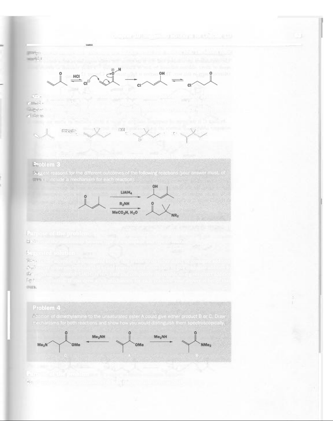 Chapter 10 Suggested solutions for Chapter 10 63 must be present during the conjugate addition so that must be done first. The second route lead to the required product. H 0 0 OH 0 HCI CI CI CI the conjugate addition has removed the alkene, direct addition is the only option for the nucleophile. The alternative order of events would probably lead to direct addition by the reagent followed by protonation of the double bond. You were not asked what the product wrong reaction sequence is, but it might be this. o Ho Ho EtMgBr HCI + CI Problem 3 reasons for the different outcomes of the following reactions (your answer must, of include a mechanism for each reaction). 0 R₂NH 0 MeCO₂H, H2O NR₂ Purpose of the problem Revision of the relationship between type of nucleophile and type of reaction. Suggested solution The Michael acceptor is a conjugated ketone that is able to do either direct or conjugate addition. are softer nucleophiles able to add reversibly and more likely to give conjugate addition by control. is very hard and completely irreversible so it gives direct addition kinetic control. If you drew a full mechanism for each reaction, your answer is better than Problem 4 Addition of dimethylamine to the unsaturated ester A could give either product B or C. Draw mechanisms for both reactions and show how you would distinguish them spectroscopically. 0 0 OMe OMe NMe₂ C A B Purpose of the problem To get you to draw the mechanisms for both reactions and to revise NMR.
