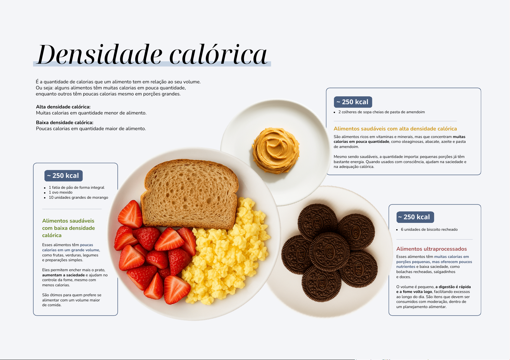 ~ 250 kcal 6 unidades de biscoito recheado Alimentos ultraprocessados Esses alimentos têm muitas calorias em porções pequenas, mas oferecem poucos nutrientes e baixa saciedade, como bolachas recheadas, salgadinhos e doces. O volume é pequeno, a digestão é rápida e a fome volta logo, facilitando excessos ao longo do dia. São itens que devem ser consumidos com moderação, dentro de um planejamento alimentar. ~ 250 kcal 2 colheres de sopa cheias de pasta de amendoim Alimentos saudáveis com alta densidade calórica São alimentos ricos em vitaminas e minerais, mas que concentram muitas calorias em pouca quantidade, como oleaginosas, abacate, azeite e pasta de amendoim. Mesmo sendo saudáveis, a quantidade importa: pequenas porções já têm bastante energia. Quando usados com consciência, ajudam na saciedade e na adequação calórica. ~ 250 kcal 1 fatia de pão de forma integral 1 ovo mexido 10 unidades grandes de morango Alimentos saudáveis com baixa densidade calórica Esses alimentos têm poucas calorias em um grande volume, como frutas, verduras, legumes e preparações simples. Eles permitem encher mais o prato, aumentam a saciedade e ajudam no controle da fome, mesmo com menos calorias. São ótimos para quem prefere se alimentar com um volume maior de comida. Densidade calórica É a quantidade de calorias que um alimento tem em relação ao seu volume. Ou seja: alguns alimentos têm muitas calorias em pouca quantidade, enquanto outros têm poucas calorias mesmo em porções grandes. Alta densidade calórica: Muitas calorias em quantidade menor de alimento. Baixa densidade calórica: Poucas calorias em quantidade maior de alimento.