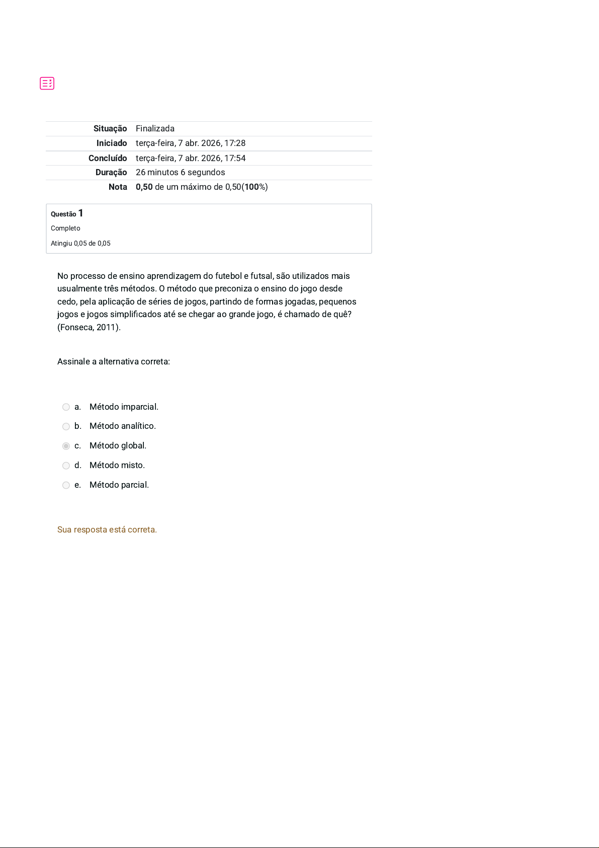 Situação Finalizada Iniciado terça-feira, 7 abr. 2026, 17:28 Concluído terça-feira, 7 abr. 2026, 17:54 Duração 26 minutos 6 segundos Nota 0,50 de um máximo de 0,50(100%) Questão 1 Completo Atingiu 0,05 de 0,05 No processo de ensino aprendizagem do futebol e futsal, são utilizados mais usualmente três métodos. O método que preconiza o ensino do jogo desde cedo, pela aplicação de séries de jogos, partindo de formas jogadas, pequenos jogos e jogos simplificados até se chegar ao grande jogo, é chamado de quê? (Fonseca, 2011). Assinale a alternativa correta: a. Método imparcial. b. Método analítico. c. Método global. d. Método misto. e. Método parcial. Sua resposta está correta. Questão 2 Completo Atingiu 0,05 de 0,05 Questão 3 Completo Atingiu 0,05 de 0,05 Analise o trecho a seguir e preencha a lacuna: A ação tática deve sempre ser orientada e consciente, relacionada a um objetivo específico e pautada pelas regras do esporte, sendo que o conhecimento das opções táticas individuais e das combinações táticas de grupo facilita a obtenção do êxito (Almeida, 2012). Nesse sentido, toda ação de um jogador no Handebol, na qual procure uma situação 1x1, sem uma ação direta do seu companheiro de equipe para alcançar o objetivo almejado, é considerada tática _______________? Assinale a alternativa correta: a. Tática de Grupo. b. Tática Psicológica. c. Tática de Equipe. d. Tática Individual. e. Tática suicida. Sua resposta está correta. Dentre os principais fundamentos técnicos individuais do basquetebol, o que podemos citar? Assinale a alternativa correta: a. Arremesso, cortada e drible. b. Arremesso, giro e drible. c. Bloqueio, giro e drible. d. Recepção, manchete e saque. e. Arremesso, giro e chute. Sua resposta está correta. Questão 4 Completo Atingiu 0,05 de 0,05 Questão 5 Completo Atingiu 0,05 de 0,05 O futebol brasileiro deu sorte assim que nasceu. Embora tenha sido introduzido aqui no país no final do século XIX com um inconfundível sotaque britânico, o tipo de jogo adotado possuía em seu DNA características que logo o distinguiram do futebol então praticado na Europa (Guterman, 2009). O esporte foi trazido para o Brasil por um filho de engenheiro escocês e uma brasileira filha de ingleses. Qual seu nome? Assinale a alternativa correta: a. Charles Miller. b. Edson Arantes do Nascimento. c. Henry Fox. d. William Nelson. e. John Miller. Sua resposta está correta. As técnicas podem ser entendidas como os movimentos cujos resultados são obtidos a partir de ações mais econômicas e efetivas (Filin, 1996). Como técnicas coletivas do basquetebol, podemos entender aqueles movimentos que visam o resultado e que necessitam da participação de dois ou mais jogadores, são elas? Assinale a alternativa correta: a. Recepção, cortada, rebote, situações de jogo (1x1, 2x2, 3x2). b. Drible, cortada, bloqueio, situações de jogo (1x1, 2x2, 3x2). c. Recepção, passe, rebote, situações de jogo (1x1, 2x2, 3x2). d. Saque, passe, rebote, situações de jogo (1x1, 2x2, 3x2). e. Recepção, passe, chute, situações de jogo (1x1, 2x2, 3x2). Sua resposta está correta. Questão 6 Completo Atingiu 0,05 de 0,05 Questão 7 Completo Atingiu 0,05 de 0,05 Em meio a crises econômicas e à bagunça administrativa, o futebol brasileiro se transformou em exportador de craques, a chamada “década perdida”. O fenômeno coincidiu com a “desnacionalização” do futebol por meio da formação de times europeus a partir da colheita de atletas de todas as partes do mundo. Jogadores como Falcão, Sócrates e Zico se transferiram para Roma, Fiorentina e Udinese respectivamente (Guterman, 2009). Em que década esse fenômeno aconteceu? Assinale a alternativa correta: a. Década de 1990. b. Década de 1980. c. Década de 1950. d. Década de 1970. e. Década de 1960. Sua resposta está correta. É polêmica a origem do futebol de salão, pois brasileiros e uruguaios são os prováveis fundadores desse esporte. A história brasileira diz que foi criado em 1930, na Associação Cristã de Moços, em ______________, e depois difundiu-se por todo o País e foi o Brasil que o organizou. Por isso é considerado o “pai” do Futebol de Salão (Andrade Junior, 1999). Em qual cidade brasileira foi fundado o futsal? Assinale a alternativa correta: a. Belo Horizonte. b. Rio de Janeiro. c. Porto Alegre. d. Montevidéu. e. São Paulo. Sua resposta está correta. Questão 8 Completo Atingiu 0,05 de 0,05 Questão 9 Completo Atingiu 0,05 de 0,05 Fundamentos individuais no futebol são utilizados pelos jogadores de uma equipe em benefício próprio, a fim de executar uma ação motora sem ajuda de um companheiro, ou seja, em forma individual, e até onde as regras lhes permitem (Arruda, 2010). Nesse sentido, qual conjunto de fundamentos técnicos não são inerentes aos jogadores de linha no futebol? Assinale a alternativa correta: a. Saque e Cortada. b. Cabeceio e condução de bola com a planta do pé. c. Condução de bola com o interior do pé e Drible. d. Chute com a ponta do pé e controle de bola. e. Dribles Complexos (finta) e Chute com o peito do pé. Sua resposta está correta. O jogo de handebol se desenvolverá solucionando com êxito todas as tarefas impostas se os jogadores conseguirem buscar alternativas baseadas nas possibilidades técnicas (Franke, 2018). Nesse sentido, qual alternativa representa na íntegra os fundamentos técnicos do handebol? Assinale a alternativa correta: a. Empunhadura, recepção, passe, arremesso, drible e chute. b. Empunhadura, recepção, passe, saque, drible e finta. c. Empunhadura, recepção, passe, arremesso, drible e finta. d. Empunhadura, recepção, rebote, arremesso, drible e finta. e. Empunhadura, bloqueio, passe, arremesso, drible e finta. Sua resposta está correta. Questão 10 Completo Atingiu 0,05 de 0,05 Com relação às regras do basquetebol, qual afirmativa é a correta? a. A quadra de jogo tem 28 metros
