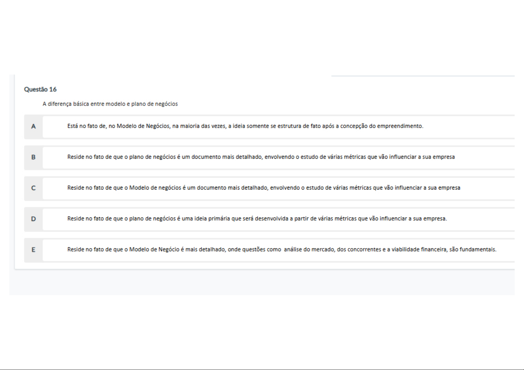 Questão 16 A diferença básica entre modelo e plano de negócios A Está no fato de, no Modelo de Negócios, na maioria das vezes, a ideia somente se estrutura de fato após a concepção do empreendimento. Reside no fato de que o plano de negócios é um documento mais detalhado, envolvendo o estudo de várias métricas que vão influenciar a sua empresa Reside no fato de que o Modelo de negócios é um documento mais detalhado, envolvendo o estudo de várias métricas que vão influenciar a sua empresa D Reside no fato de que o plano de negócios é uma ideia primária que será desenvolvida a partir de várias métricas que vão influenciar a sua empresa. E Reside no fato de que o Modelo de Negócio é mais detalhado, onde questões como análise do mercado, dos concorrentes e a viabilidade financeira, são fundamentais.Prova Regimental A1 2026/1 (2° evento) Curso Disciplina Turma Período CIÊNCIAS CONTÁBEIS (P/ BACH MODELOS INOVADORES EM Turma_005_NE (2202922_2608); 1 ATUARIAIS) (381) NEGÓCIOS Questão 15 Um dos pontos fundamentais da era do cliente é que, agora, ter foco no cliente não é mais suficiente. Essencial, hoje, é ter foco do cliente. Neste sentido, este foco significa: A Que você olha para 0 cliente e busca saber quais seriam suas preferências e necessidades, seus problemas e interesses. Que você olha para cliente e se preocupa com que ele gostaria; Que você se põe no lugar do cliente e passa a sentir suas necessidades, interesses e motivações. D Que você olha para cliente imaginando 0 que seria bom para ele; E Que é uma visão de fora para dentro.Prova Regimental A1 2026/1 (2° evento) Curso Disciplina Turma Período CIÊNCIAS CONTÁBEIS (P/ BACH MODELOS INOVADORES EM Turma_005_NE 1 ATUARIAIS) (381) NEGÓCIOS Questão 14 principal benefício do modelo é a sua simplicidade e rápida implementação. Com uma caneta, alguns post-its e uma boa mesa, empresário vai poder trabalhar com uma metodologia criativa para melhoria dos negócios. Ele deve responder a várias perguntas, como as identificadas abaixo, exceto. A que vou fazer? A resposta é a proposta de valor; Quanto vou gastar? A finalidade é saber quais são as receitas e qual será a estrutura de custo para viabilizar negócio. Quando vou fazer? A ideia é definir quando público consumidor deseja produto; D Como vou fazer? objetivo é descobrir quais são os principais recursos, atividades e parceiros; E Para quem vou fazer? A ideia é definir público consumidor e as melhores maneiras de se relacionar com ele;Prova Regimental A1 2026/1 (2° evento) Curso Disciplina Turma Período CIÊNCIAS CONTÁBEIS (P/ BACH MODELOS INOVADORES EM Turma_005_NE 1 ATUARIAIS) (381) NEGÓCIOS Questão 13 Ao considerarmos a rotina de trabalho das indústrias, a digitalização colabora para reduzir significativamente o esforço braçal dos operários. Em outros segmentos, como comércio e serviços a revolução digital impactou no poder de coleta, armazenamento e uso dos dados para análises e tomadas de decisões. - ajudou as empresas a serem mais rápidas e certeiras em suas escolhas. III- a empresa se torna digital, os gestores descobrem que podem compartilhar a tecnologia e experiências com os outros departamentos sem muito esforço, pois as barreiras à implementação são mais fáceis de serem superadas. A partir das assertivas acima, é correta a alternativa A Todas as assertivas estão corretas Somente a assertiva está correta Somente as assertivas le III estão corretas D Somente as assertivas I e II estão corretas E Somente a assertiva III está corretaProva Regimental A1 2026/1 (2° evento) Curso Disciplina Turma Período CIÊNCIAS CONTÁBEIS (P/ BACH MODELOS INOVADORES EM Turma_005_NE 1 ECON, ATUARIAIS) (381) NEGÓCIOS Questão 12 Six Sigma diz respeito a algumas das técnicas usadas para otimizar processos de negócio em nível departamental, de grupos departamentais e também de grandes segmentos organizacionais. Avalie as assertivas abaixo I. A Motorola foi a primeira Empresa a introduzir métodos Seis Sigma em seu processo de fabricação. II. Depois que foi implementado pela Motorola, esses métodos Seis Sigma foram praticados por várias outras Empresas. III. Esses princípios foram empregados pela Empresa para reduzir a taxa de defeitos em sua linha de produção. IV. Seis Sigma é uma estrutura organizacional que se concentra na melhoria contínua, cujo objetivo principal é atingir metas e objetivos. A partir das assertivas acima, é correta a alternativa: A Somente as assertivas II e III estão corretas. Somente as assertivas le estão corretas. Todas as assertivas estão corretas. D Somente a assertiva III está correta. E Somente as assertivas le IV estão corretas.Prova Regimental A1 - 2026/1 (2° evento) Curso Disciplina Turma Período CIÊNCIAS CONTÁBEIS (P/ BACH MODELOS INOVADORES EM Turma_005_NE 1 ECON, ATUARIAIS) (381) NEGÓCIOS Questão 11 amplo progresso da TI (Tecnologia da Informação) abriu caminho para surgimento de inovações, levando a tecnologia a se tornar principal pilar da revolução digital. Esta inovação é: A A Internet As Mensagens em Wattsapp A Globalização D E.Mail E A ComunicaçãoProva Regimental A1 2026/1 (2° evento) Curso Disciplina Turma Período CIÊNCIAS CONTÁBEIS (P/ BACH MODELOS INOVADORES EM Turma_005_NE 1 ATUARIAIS) (381) NEGOCIOS Questão 10 Total Quality Management (TQM): Diz respeito ao Gerenciamento de Qualidade Total. Sobre tal método, assinale a alternativa correta: A Esses princípios foram empregados pela Empresa para reduzir a taxa de defeitos em sua linha de produção. A Motorola foi a primeira Empresa a introduzir métodos em seu processo de fabricação. Depois que foi implementado pela Motorola, esses métodos foram praticados por várias outras Empresas. D processo contínuo de detecção e redução ou eliminação de erros na fabricação, agilizando gerenciamento da cadeia de suprimentos, melhorando a experiência do cliente 