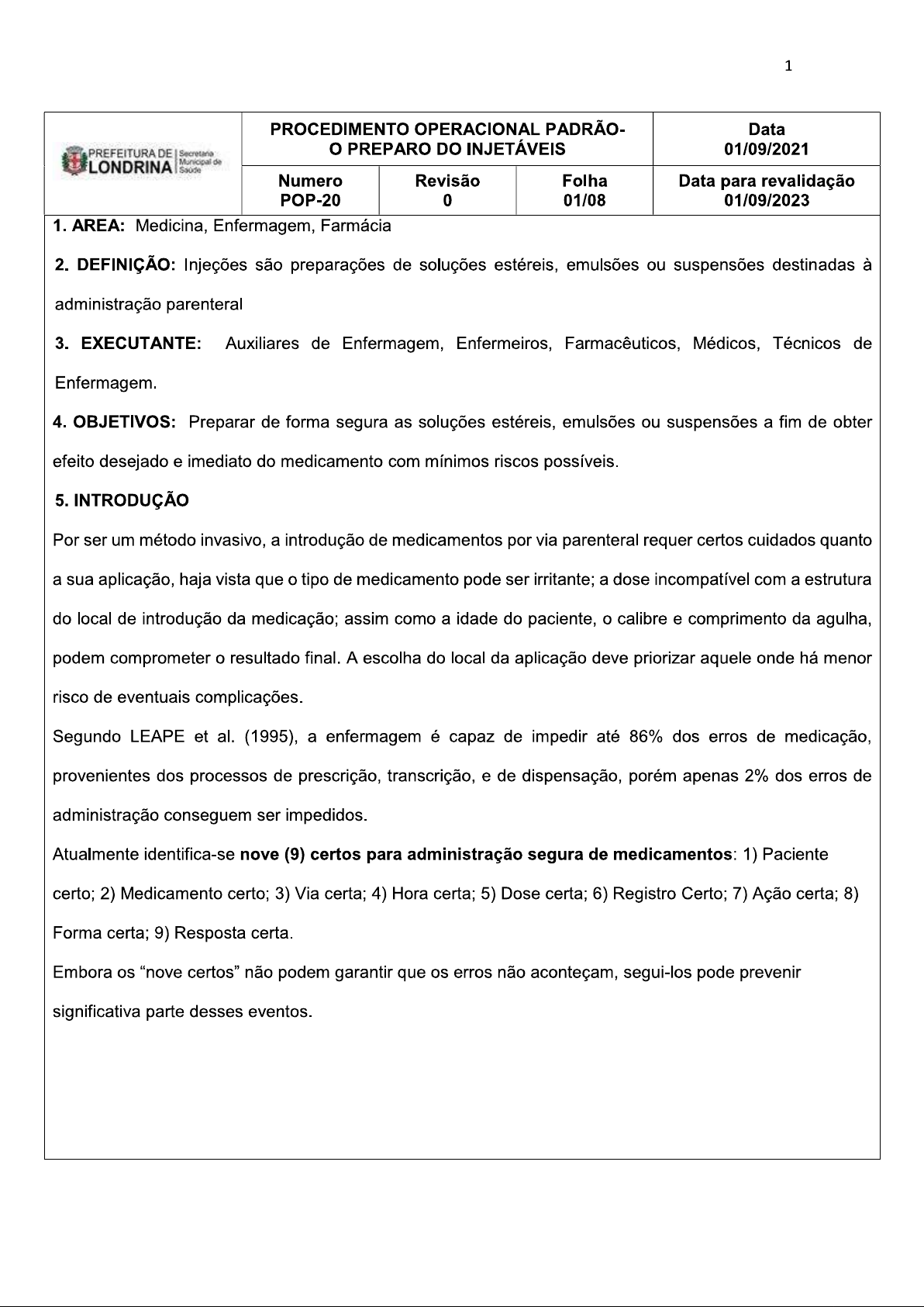 1 PROCEDIMENTO OPERACIONAL PADRÃO- Data PREFEITURA DE Secretaria PREPARO DO INJETÁVEIS 01/09/2021 LONDRINA Municipal de Saúde Numero Revisão Folha Data para revalidação POP-20 01/08 01/09/2023 1. AREA: Medicina, Enfermagem, Farmácia 2. DEFINIÇÃO: Injeções são preparações de soluções estéreis, emulsões ou suspensões destinadas à administração parenteral 3. EXECUTANTE: Auxiliares de Enfermagem, Enfermeiros, Farmacêuticos, Médicos, Técnicos de Enfermagem. 4. OBJETIVOS: Preparar de forma segura as soluções estéreis, emulsões ou suspensões a fim de obter efeito desejado e imediato do medicamento com mínimos riscos possíveis. 5. INTRODUÇÃO Por ser um método invasivo, a introdução de medicamentos por via parenteral requer certos cuidados quanto a sua aplicação, haja vista que o tipo de medicamento pode ser irritante; a dose incompatível com a estrutura do local de introdução da medicação; assim como a idade do paciente, o calibre e comprimento da agulha, podem comprometer o resultado final. A escolha do local da aplicação deve priorizar aquele onde há menor risco de eventuais complicações. Segundo LEAPE et al. (1995), a enfermagem é capaz de impedir até 86% dos erros de medicação, provenientes dos processos de prescrição, transcrição, e de dispensação, porém apenas 2% dos erros de administração conseguem ser impedidos. Atualmente identifica-se nove (9) certos para administração segura de medicamentos: 1) Paciente certo; 2) Medicamento certo; 3) Via certa; 4) Hora certa; 5) Dose certa; 6) Registro Certo; 7) Ação certa; 8) Forma certa; 9) Resposta certa. Embora os "nove certos" não podem garantir que os erros não aconteçam, segui-los pode prevenir significativa parte desses eventos.2 PROCEDIMENTO OPERACIONAL PADRÃO- Data PREFEITURA DE Secretaria PREPARO DO INJETÁVEIS 01/09/2021 LONDRINA Municipal de Numero Revisão Folha Data para revalidação POP-20 02/08 01/09/2023 Quadro 2: Nove (9) certos da medicação 9 CERTOS DA JUSTIFICATIVA MEDICAÇÃO 1) Paciente certo Utiliza-se dois indicadores (nome do paciente e Data 01/09/2021 de nascimento); perguntar ao paciente seus dados e confirmar em prontuário. 2) Medicamento Conferir se a medicação em mãos é a mesma que esta prescrita; lembrando que algumas certo medicações possuem embalagens ou nomes bastante parecidos. Questionar o paciente quanto a algum tipo de alergia e identificar no prontuário. 3) Via certa Certificar se a via de administração prescrita é a via tecnicamente recomendada para a administração dessa medicação; verificar se o diluente foi prescrito. Controlar o gotejo de acordo com o tempo de infusão da medicação, se for o caso; analisar via embalagem a compatibilidade da via de administração prescrita. Esclarecer todas as dúvidas com o enfermeiro, com o farmacêutico e o médico que prescreveu, se necessário. 4) Hora certa medicamento deve sempre ser administrado no horário prescrito: Atentar para o período de estabilidade da medicação após diluída; a antecipação ou atraso da medicação só deve ser realizado com consentimento do enfermeiro ou do médico que prescreveu. 5) Dose certa Conferir atentamente a dose prescrita principalmente em casos de doses fracionadas; conferir a velocidade de gotejo, realizar dupla checagem em casos de medicação em bomba de infusão. 6) Registro certo Garante a continuidade correta no tratamento; na prescrição colocar o horário correto e checar; nos registros de enfermagem registre os medicamentos realizados, e justifique os casos de adiantamento, cancelamento, recusa do paciente, ou motivo de não administração da medicação. 7) Ação certa paciente deve ser informado sobre qual medicamento será administrado, qual a indicação, a dose, e a frequência que será administrada. 8) Forma certa A forma farmacêutica também deve ser checada: medicamento a ser administrado possui a forma farmacêutica e a via a ser administrada; verifique se a forma farmacêutica e a via de administração correspondem as condições do paciente (exemplo nível de consciência, se permite a administração por via oral); 9) Resposta certa Observar atentamente paciente, para se certificar que medicamento atingiu o efeito esperado; registre todos os efeitos indesejados ocorridos, bem como sua intensidade; e principalmente não desconsidere a queixa do paciente.3 PROCEDIMENTO OPERACIONAL PADRÃO- Data PREPARO DO INJETÁVEIS 01/09/2021 PREFEITURA DE Secretaria LONDRINA Municipal de Saúde Numero Revisão Folha Data para revalidação POP-20 03/08 01/09/2023 6. VIAS DE ADMINISTRAÇÃO: Os medicamentos injetáveis administrados comumente nos serviços de saúde municipais são por via intradérmica (ID), subcutânea (SC), intramuscular (IM) e endovenosa ou intravenosa (EV ou IV) Figura:01-Tipos de injeções Intramuscular Endovenosa Intradermica Epiderme Derme Tecido Músculo Ângulo 90° 45° 25° Intramuscular Endovenosa Intradermica Fonte: Google imagens/ Tipos de injeções (adaptado) Considerando a especificidades das regiões anatômicas e a influência sobre a administração dos diferentes tipos de injeções, os comentários sobre anatomia e fisiologia da pele e músculos serão realizados junto com cada técnica descritas nos POPs seguintes.4 PROCEDIMENTO OPERACIONAL PADRÃO- Data PREFEITURA DE Secretaria PREPARO DO INJETÁVEIS 01/09/2021 LONDRINA Municipal de Saúde Numero Revisão Folha Data para revalidação POP-20 0 04/08 01/09/2023 6.1 Composição da Seringa e Agulha Figura 02- Composição da Seringa e Agulha Figura 03- Tipos de bicos de seringa Luer Lock ÊMBOLO CORPO OU CILINDRO BISEL HASTE BICO CANHÃO Luer Slip Fonte: Google imagens/ Tipos de bicos da seringa Fonte: Google imagens/ tipos de bicos de seringa 6.1.1 A escolha da seringa e da agulha: A escolha da seringa dependerá da quantidade da medicação a ser aplicada. Já a escolha da agulha deve se dar em função da: a) via de administração: 