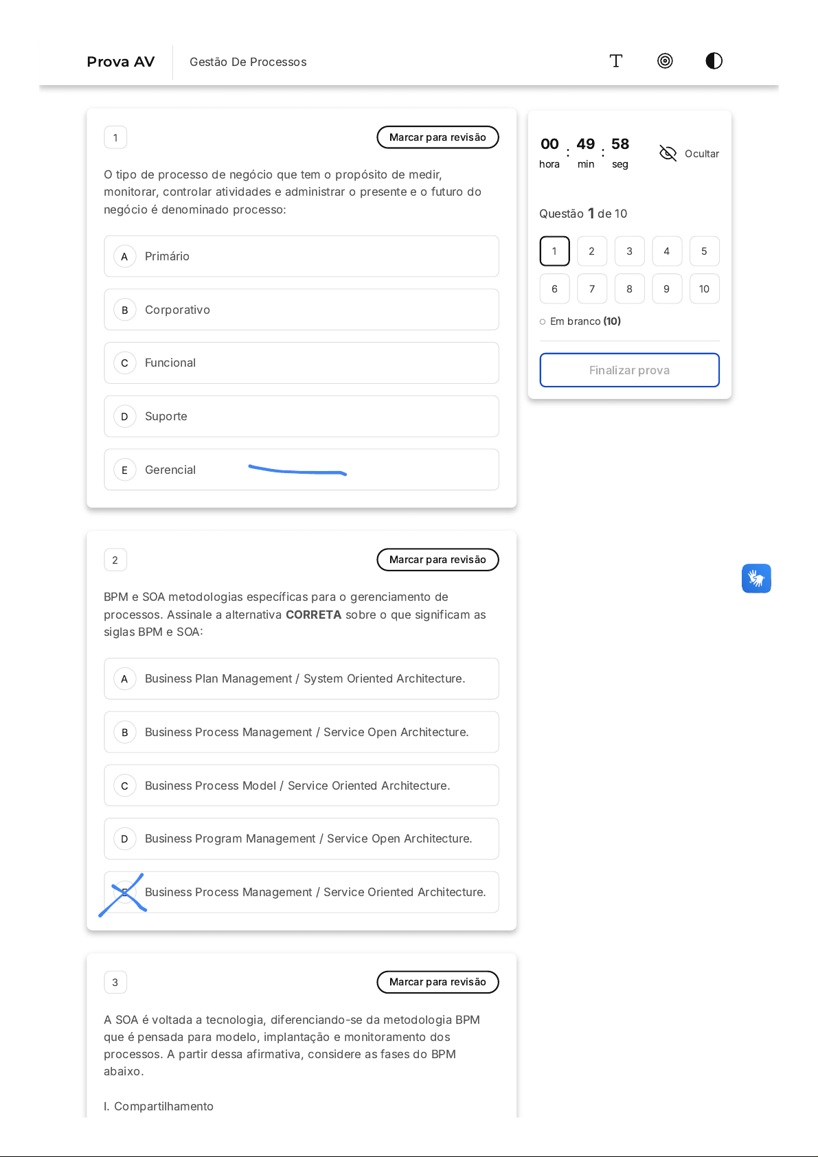 A B C D E A B C D E 1 Marcar para revisão O tipo de processo de negócio que tem o propósito de medir, monitorar, controlar atividades e administrar o presente e o futuro do negócio é denominado processo: Primário Corporativo Funcional Suporte Gerencial 2 Marcar para revisão BPM e SOA metodologias específicas para o gerenciamento de processos. Assinale a alternativa CORRETA sobre o que significam as siglas BPM e SOA: Business Plan Management / System Oriented Architecture. Business Process Management / Service Open Architecture. Business Process Model / Service Oriented Architecture. Business Program Management / Service Open Architecture. Business Process Management / Service Oriented Architecture. 3 Marcar para revisão A SOA é voltada a tecnologia, diferenciando-se da metodologia BPM que é pensada para modelo, implantação e monitoramento dos processos. A partir dessa afirmativa, considere as fases do BPM abaixo. I. Compartilhamento 00 hora : 49 min : 58 seg Ocultar Questão 1 de 10 Em branco (10) Finalizar prova 1 2 3 4 5 6 7 8 9 10 Prova AV Gestão De Processos A B C D E A B C D E II. Modelagem Inicial III. Simulação IV. Monitoramento São fases do BPM os itens I, apenas. II e III, apenas. I e IV, apenas. II, apenas. II, III e IV, apenas. 4 Marcar para revisão Os processos de negócios são a base de operações das organizações. Envolvem uma série de atividades interligadas entre si. Neste contexto, qual seria a melhor definição de processo? Uma atividade isolada sem interdependências Uma sequência de atividades que transforma insumos em resultados Atividades que geram um relatório financeiro anual da empresa Uma técnica de marketing para atrair clientes Atividades que tem umas funções específicas dentro do departamento de TI 5 Marcar para revisão Uma empresa global de marketing digital está buscando melhorar sua capacidade de resposta às rápidas mudanças nas tendências de consumo e nas tecnologias de anúncio. Como o sistema de gerenciamento OKR pode ser eficaz para esta empresa na adaptação a essas mudanças do mercado? A B C D E A B C D E Estabelecendo metas de longa duração que garantem a consistência e previsibilidade dos esforços de marketing Focando em metas quantitativas que enfatizam o crescimento a longo prazo, independentemente das mudanças do mercado Permitindo ajustes regulares e rápidos nos OKRs para refletir as mudanças nas tendências de marketing e na tecnologia Priorizando o desenvolvimento de novas ferramentas de marketing digital em detrimento do ajuste de estratégias existentes Mantendo os objetivos estratégicos estáticos para fortalecer a identidade de marca, mesmo com mudanças de mercado 6 Marcar para revisão Os processos empresariais são uma série de tarefas organizadas de maneira estruturada para a produção de produtos ou serviços, envolvendo atividades sequenciais com delimitações precisas de início, fim, entrada e saída. Nesse contexto, existem três tipos de processos. Os processos do tipo gerencial são aqueles que: coordenam os processos dos outros tipos; buscam eficiência e eficácia e não entregam valor diretamente ao cliente. suportam os processos essenciais das empresas; apoiam e executam atividades importantes. estão relacionados às principais atividades desempenhadas pela organização; entregam valor diretamente para o cliente. delimitam as atividades importantes da empresa e entregam valor diretamente ao cliente. organizam os esforços das principais atividades da empresa, as atividades fins e entregam valor ao cliente interno. 7 Marcar para revisão Uma organização precisa mobilizar recursos para promover melhorias de processos. Como não é possível a promoção de melhorias de forma generalizada, indique a alternativa que melhor exemplifique um critério técnico de priorização de processos que poderão passar por melhorias. A B C D E A B C D E A B C Maior tempo de execução Menor tempo de programação Risco associado Indicação da alta administração Indicação do conselho de administração 8 Marcar para revisão A identificação das conformidades pode ser realizada pelo comprador, pelo fornecedor, por organizações independentes e eventualmente pelo próprio cliente. Quando avaliada via testes técnicos, como, por exemplo, um produto têxtil é testado para confirmar a resistência ao rasgo. Essa descrição corresponde a qual tipo de avaliação? Ensaio Auditoria Inspeção Qualidade International Organization for Standardization (ISO) 9 Marcar para revisão Indicadores de desempenho são fundamentais para controlar os processos gerenciais. Sobre indicadores de desempenho, assinale a alternativa correta. Devem ser rastreáveis. Devem ser avaliados de forma qualitativa. Devem ser muitos para garantir a eficácia e eficiência. D E A B C D E Devem ser complexos. Deve ser secreto. 10 Marcar para revisão Resultado desejado na adoção das boas práticas de gestão, de forma a atender às leis, normas e políticas para os produtos, serviços e processos realizados na organização, é chamado de: compliance. governança corporativa. conformidade de processos de negócio. padrão de conformidade. responsabilidade social.