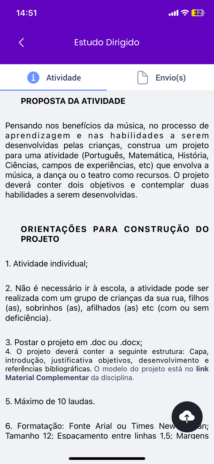 14:51 32 Estudo Dirigido i Atividade Envio(s) PROPOSTA DA ATIVIDADE Pensando nos benefícios da música, no processo de aprendizagem e nas habilidades a serem desenvolvidas pelas crianças, construa um projeto para uma atividade (Português, Matemática, História, Ciências, campos de experiências, etc) que envolva a música, a dança ou o teatro como recursos. projeto deverá conter dois objetivos e contemplar duas habilidades a serem desenvolvidas. ORIENTAÇÕES PARA CONSTRUÇÃO DO PROJETO 1. Atividade individual; 2. Não é necessário ir à escola, a atividade pode ser realizada com um grupo de crianças da sua rua, filhos (as), sobrinhos (as), afilhados (as) etc (com ou sem deficiência). 3. Postar o projeto em .doc ou .docx; 4. projeto deverá conter a seguinte estrutura: Capa, introdução, justificativa objetivos, desenvolvimento e referências bibliográficas. modelo do projeto está no link Material Complementar da disciplina. 5. Máximo de 10 laudas. 6. Formatação: Fonte Arial ou Times New an; Tamanho 12; Espaçamento entre linhas 1,5; Margens