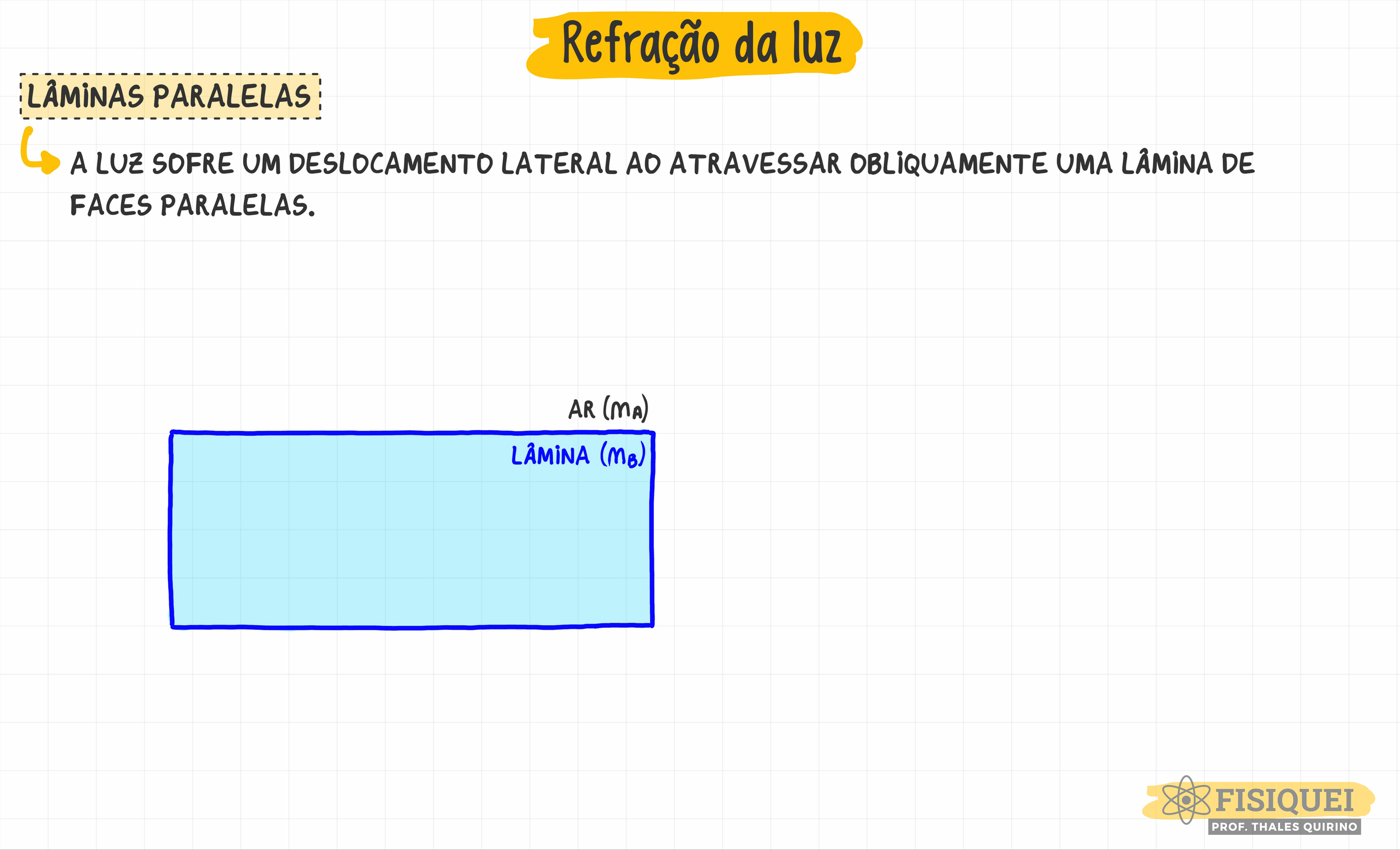Refração da luz PARALELAS A LUZ SOFRE UM DESLOCAMENTO LATERAL AO ATRAVESSAR UMA LÂMiNA DE FACES PARALELAS. AR (MA) LÂMiNA (MB) FISIQUEI PROF. THALES QUIRINO