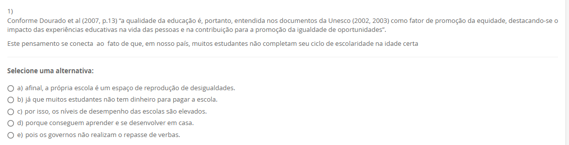 1) Conforme Dourado et al (2007, p.13) "a qualidade da educação é, portanto, entendida nos documentos da Unesco (2002, 2003) como fator de promoção da equidade, destacando-se impacto das experiências educativas na vida das pessoas e na contribuição para a promoção da igualdade de oportunidades". Este pensamento se conecta ao fato de que, em nosso país, muitos estudantes não completam seu ciclo de escolaridade na idade certa Selecione uma alternativa: a) afinal, a própria escola é um espaço de reprodução de desigualdades. b) já que muitos estudantes não tem dinheiro para pagar a escola. c) por isso, níveis de desempenho das escolas são elevados. d) porque conseguem aprender e se desenvolver em casa. e) pois governos não realizam repasse de verbas.