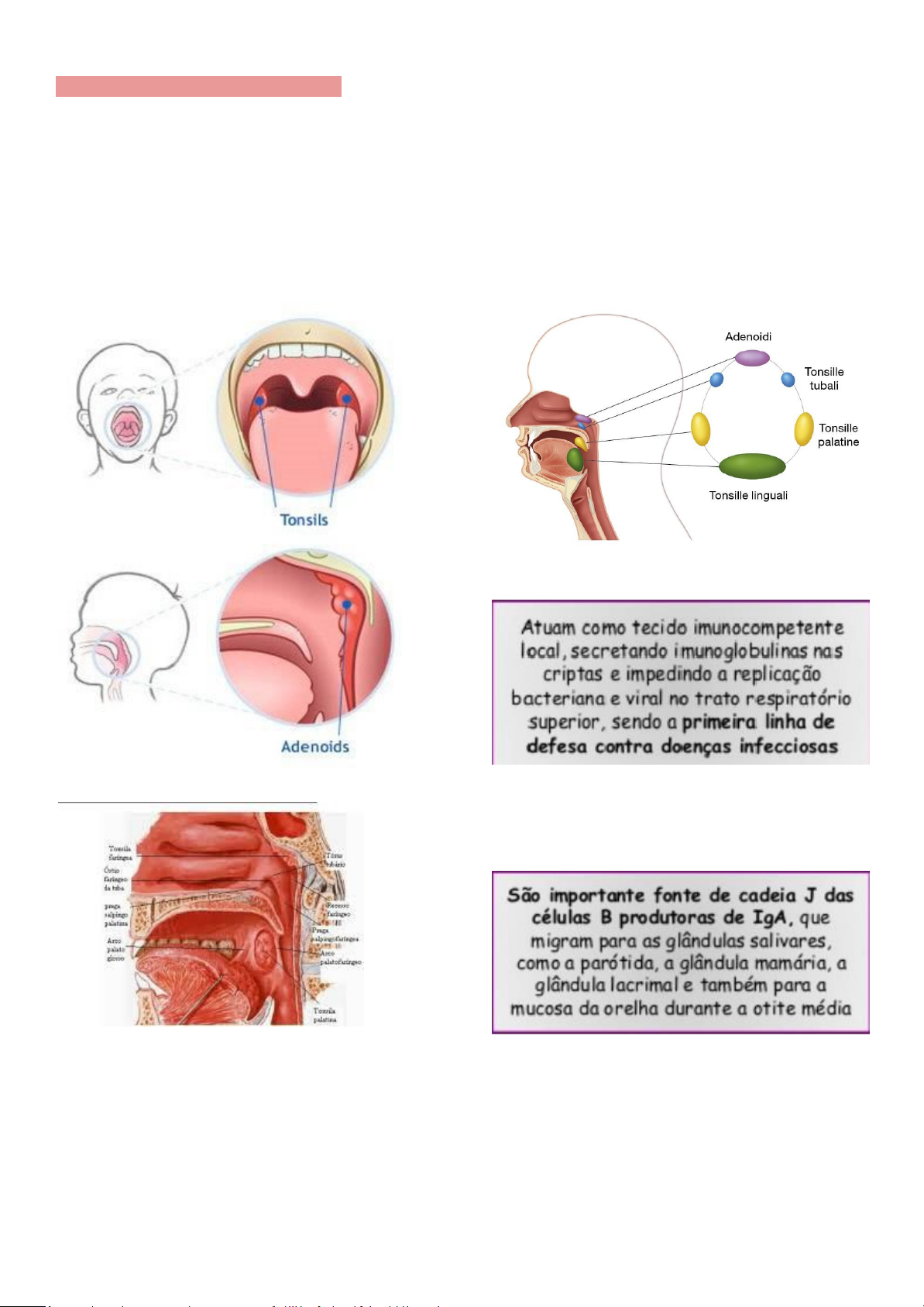 ANA GEÓRGIA - 8º MB AULA - FARINGOTONSILITES Anatomia - Tecido linfóide vai formar: adenoide, tonsilas peritubárias/ lingual. - Amígdalas/ tonsilas: costuma-se ver quando realiza a oroscopia. - Adenóide: seria a tonsila faríngea fica ao final do nariz - Cornetos inferiores, médios e superiores onde tem a vegetação da adenoide. Depois das papilas circunvaladas tem a tonsila lingual, e tem a tubária que fica perto da tuba auditiva. - Todos esses tecidos funcionam como a primeira defesa da via aérea superior e formam o tecido do anel linfático de Waldeyer (que é o conjunto desses tecidos, responsáveis pela produção de imunoglobulina, cadeia J (IgA). Anel Linfático de Waldeyer - A imunidade não será prejudicada se retirar algum desses tecidos, porque os outros continuam e produzem células de defesa. Função - No trato respiratório superior, a primeira linha de defesa é o anel linfático de Waldeyer. - Cadeia J -> produção de IgA. Defesa direta para a produção de imunoglobulinas, porém não é a única. Faringotonsilites - As IVAS têm prevalência elevada; - Odinofagia é a 3 ªcausa atendimento de urgência; ANA GEÓRGIA - 8º MB - Viral x Bacteriana (uso inadequado (uso inadequado de antibiótico). Importante diferenciar para ter uma melhor resposta ao tratamento (antibiótico). Existe uso inadequado do antibiótico, cerca de 65% das crianças até os 3 anos de vida vão ter faringotonsilites virais, não sendo necessário o uso de antibiótico. - Pus pode ser confundido com fibrina. Tecido imunocompetente local secretando igs nas criptas impedindo replicação dos patógenos; principalmente a IgA. Isso serve tanto para viral ou bacteriana. Incidência: CRIANÇAS e ADOLESCENTES; 1. Viral: 75% de crianças ‹ 3 anos 2. Bacteriana: 24% EBHGA - 2 a 12 anos. Principal agente é o Streptococcus bacteriano beta - hemolítico do grupo A. - Bacteriana: língua esbranquiçada, tem mais biofilme no dorso da língua. - Viral: quadro menos exuberante. Bacteriano: quadro mais clássico. Febre alta e persistente. Diagnóstico: - Exame cultural da orofaringe - padrão ouro Sensibilidade 90-95%. Única desvantagem: tempo para dar o diagnóstico (depende da proliferação do patógeno na cultura). - Teste rápido para detecção do antígeno estreptocócico- mais usado no dia. Pode ser feito na urgência porque sai mais rápido, Mas não é padrão ouro devido a sensibilidade. Sensibilidade 75% Especificidade 95% Complicações infecções por EBHGA: - Não supurativas Febre reumática Glomerulonefrite aguda 1 - 3 semanas ● Quadro de amigdalite que foi subtratada, não erradicou o patógeno e com 1 - 3 semanas começa com o novo quadro. - Supurativas Abscesso peritonsilar Abscesso retrofaríngeo Adenite / abscesso cervical ● Evoluem com abscesso. Sempre lembrar que a amígdala está em um local de tecido frouxo, é fácil propagar quando não é bem tratado. Pode ter uma mediastinite. Em complicações severas deve-se ter cuidado (abscesso cervical/ retrofaríngeo). Abscesso periamigdaliano, em grande parte ANA GEÓRGIA - 8º MB consegue drenar e mandar para casa com antibiótico oral. Grande maioria requer acompanhamento e internamento. iTRATAMENTO CLÍNICO Penicilinas Cefalosporinas 1 ◦ geração Macrolídeos ● Depende da gravidade do paciente ● Geralmente se inicia com penicilina e em casos que não podem usar, utiliza a cefalosporina de 1ª geração ou macrolídeos. ● Grande maioria das faringotonsilites sem complicação não precisa de internamento. Exceto em pacientes mais toxemiados, que não conseguem deglutir, é preciso internar e fazer ATB EV. ● Maioria o acompanhamento é ambulatorial TRATAMENTO CIRÚRGICO - Complicações - Amigdalites de repetição: amigdalectomia. Para isso se utiliza os critérios de Paradise - ver a indicação de amigdalectomia - Frequência: se teve a partir de 7 episódios em 1 ano ou se teve 5 ou mais episódios nos últimos 2 anos ou 3 episódios nos últimos 3 anos. - Associado com algum dos sintomas: adenopatia cervical > 2 cm e doloroso, temperatura > 38,3º, exsudato amigdalar e cultivo positivo para EBHGA. Frequência mais um sintoma associado já é indicado a cirurgia. Mas existem casos que podem ser indicados também. Abscesso peritonsilar / periamigdaliano ● Uma das complicações supurativas mais frequentes em urgência otorrino. ● A amígdala fica na orofaringe e tem um pilar anterior (que está em contato com o palato, que vai definir a loja amigdaliana anterior) e tem um pilar posterior (próximo a úvula). ● O ABSCESSO NÃO É NA AMÍGDALA. ● Estafilococos Aureus ou flora múltipla anaeróbios (mais frequente). Amigdalites não tratadas adequadamente. ● Dor de garganta unilateral e intensa ● Sialorréia ● Trismo - não consegue abrir a boca ● Febre - paciente mais toxemiado, que não consegue deglutir a saliva. ● Comprometimento estado geral ABSCESSO PERIAMIGDALIANO - Não pode abrir diretamente com o bisturi. Deve-se puncionar para ver se sai alguma secreção. Ao sair alguma secreção, amplia o local - Secreção purulenta, paciente não está ANA GEÓRGIA - 8º MB toxemiado pode drenar e colocar antibiótico, mandar para casa (macrolídeo/ polimicrobiano - clindamicina) - Pacientes internados, deve cobrir para gram +, gram - e anaeróbios ( clinda + rocefin). Mononucleose Infecciosa ● Vírus Epstein Barr ● Temperatura normal ou elevada ● Mal estar - geral / Astenia ● Tonsilas palatinas aumentadas de tamanho e com exsudato - ficam hiperemiadas, edemaciadas ● Hepatomegalia / Esplenomegalia (associadas ou isoladamente). ● Teste de Paul Bunnell - tem a pesquisa de anticorpos heterófilos IgM. No início da doença pode estar negativo, porque ainda só vai ter antígenos ou em crianças menores de 5 anos por causa do sistema imunológico imaturo (falso - negativo). ● Anti VCA: IgM anti VCA ›1:10, IgG anti VCA ›1:320 - quando positiva - IgM/ IgG. O exame mais importante é a