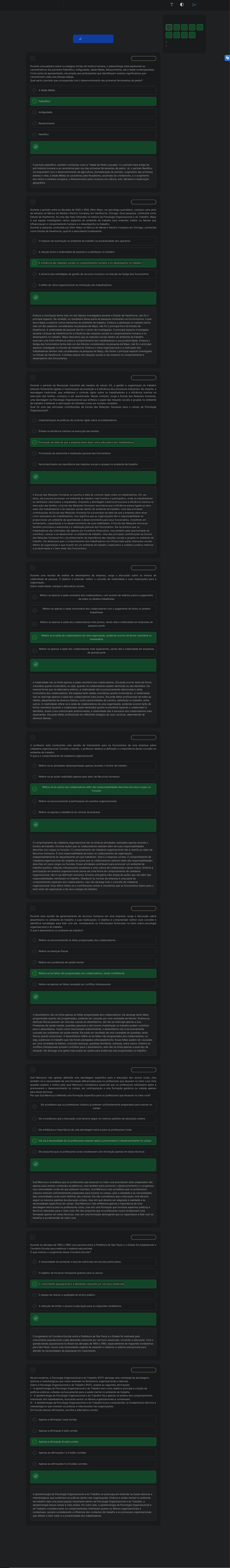 Você acertou 9 de 9 questões Verifique o seu desempenho e continue treinando! Você pode refazer o exercício quantas vezes quiser. Verificar Desempenho A B C D E A B C D E A B C D E A B C D E A B C D E A B C D E A B C D E A B C D E A B C D E 1 Marcar para revisão Durante uma palestra sobre os estágios iniciais da história humana, o paleontólogo está explicando as características dos períodos Paleolítico, Antiguidade, Idade Média, Renascimento, até a Idade contemporânea. Como parte da apresentação, ele propõe aos participantes que identifiquem eventos significativos que caracterizam cada uma dessas etapas. Qual seria o período que corresponde com o desenvolvimento das primeiras ferramentas de pedra? A Idade Média Paleolítico Antiguidade Renascimento Neolítico Resposta correta Parabéns, você selecionou a alternativa correta. Confira o gabarito comentado! Gabarito Comentado O período paleolítico, também conhecido como a "Idade da Pedra Lascada," é o período mais antigo da pré-história humana e se caracteriza pelo uso das primeiras ferramentas de pedra. Já, o período Neolítico correspondem com o desenvolvimento da agricultura, domesticação de animais, surgimento das primeiras aldeias e vilas; a Idade Média se caracteriza pelo feudalismo, ascensão do cristianismo, e o surgimento dos reinos e estados europeus; o Renascimento pelos avanços em ciência, arte, literatura e exploração geográfica. 2 Marcar para revisão Durante o período entre as décadas de 1920 e 1930, Elton Mayo, um psicólogo australiano, conduziu uma série de estudos na fábrica da Western Electric Company em Hawthorne, Chicago. Essa pesquisa, conhecida como Estudo de Hawthorne, foi uma das mais influentes na história da Psicologia Organizacional e do Trabalho. Mayo e sua equipe investigaram vários aspectos do ambiente de trabalho para entender melhor os fatores que influenciavam o comportamento humano e o desempenho no trabalho. Durante a pesquisa conduzida por Elton Mayo na fábrica da Western Electric Company em Chicago, conhecida como Estudo de Hawthorne, qual foi a descoberta fundamental. O impacto da iluminação no ambiente de trabalho na produtividade dos operários A relação entre a rotatividade de pessoal e a satisfação no trabalho A influência das relações sociais no comportamento humano e no desempenho no trabalho A eficácia das estratégias de gestão de recursos humanos na redução da fadiga dos funcionários O efeito do clima organizacional na motivação dos trabalhadores Resposta correta Parabéns, você selecionou a alternativa correta. Confira o gabarito comentado! Gabarito Comentado Embora a iluminação tenha sido um dos fatores investigados durante o Estudo de Hawthorne, não foi o principal aspecto. Na verdade, os resultados dessa parte da pesquisa mostraram-se inconclusivos, o que levou Mayo a explorar outros elementos do ambiente de trabalho. Embora a satisfação no trabalho tenha sido um dos aspectos considerados na pesquisa de Mayo, não foi o principal foco do Estudo de Hawthorne. A rotatividade de pessoal não foi o centro da investigação. O principal aspecto investigado durante o Estudo de Hawthorne foi a influência das relações sociais no comportamento humano e no desempenho no trabalho. Mayo descobriu que as relações sociais dentro do ambiente de trabalho exerciam uma forte influência sobre o comportamento dos trabalhadores e sua produtividade. Embora a fadiga dos funcionários tenha sido um dos fatores considerados na pesquisa de Mayo, não foi o principal aspecto investigado no Estudo de Hawthorne. Embora o clima organizacional e a motivação dos trabalhadores tenham sido considerados na pesquisa de Mayo, não foram o principal aspecto investigado no Estudo de Hawthorne. A ênfase estava nas relações sociais e seu impacto no comportamento e desempenho dos funcionários. 3 Marcar para revisão Durante o período da Revolução Industrial até meados do século XX, a gestão e organização do trabalho estavam fortemente ligadas à maximização da produção e à eficiência dos processos industriais. No entanto, a abordagem tradicional, que enfatizava o controle rígido sobre os trabalhadores e a eficiência máxima na execução das tarefas, começou a ser questionada. Nesse contexto, surge a Escola das Relações Humanas, uma abordagem na Psicologia Organizacional que enfatiza o papel das relações sociais e grupais no ambiente de trabalho e defende a valorização do indivíduo como ser humano completo. Qual foi uma das principais contribuições da Escola das Relações Humanas para o campo da Psicologia Organizacional? Implementação de políticas de controle rígido sobre os trabalhadores Ênfase na eficiência máxima na execução das tarefas Promoção da ideia de que a empresa deve atuar como educadora dos trabalhadores Priorização da autonomia e realização pessoal dos funcionários Reconhecimento da importância das relações sociais e grupais no ambiente de trabalho Resposta correta Parabéns, você selecionou a alternativa correta. Confira o gabarito comentado! Gabarito Comentado A Escola das Relações Humanas se opunha à ideia de controle rígido sobre os trabalhadores. Em vez disso, ela buscava promover um ambiente de trabalho mais humano e participativo, onde os trabalhadores se sentissem valorizados e respeitados. Enquanto a abordagem tradicional buscava a eficiência máxima na execução das tarefas, a Escola das Relações Humanas reconhecia que a eficiência estava ligada ao bem- estar dos trabalhadores e às relações sociais dentro do ambiente de trabalho. Uma das principais contribuições da Escola das Relações Humanas foi a promoção da ideia de que a empresa deve atuar como educadora dos trabalhadores. Isso significa que as organizações têm a responsabilidade de proporcionar um ambiente de aprendizado e desenvolvimento para seus funcionários, investindo em treinamento, capacitação e 