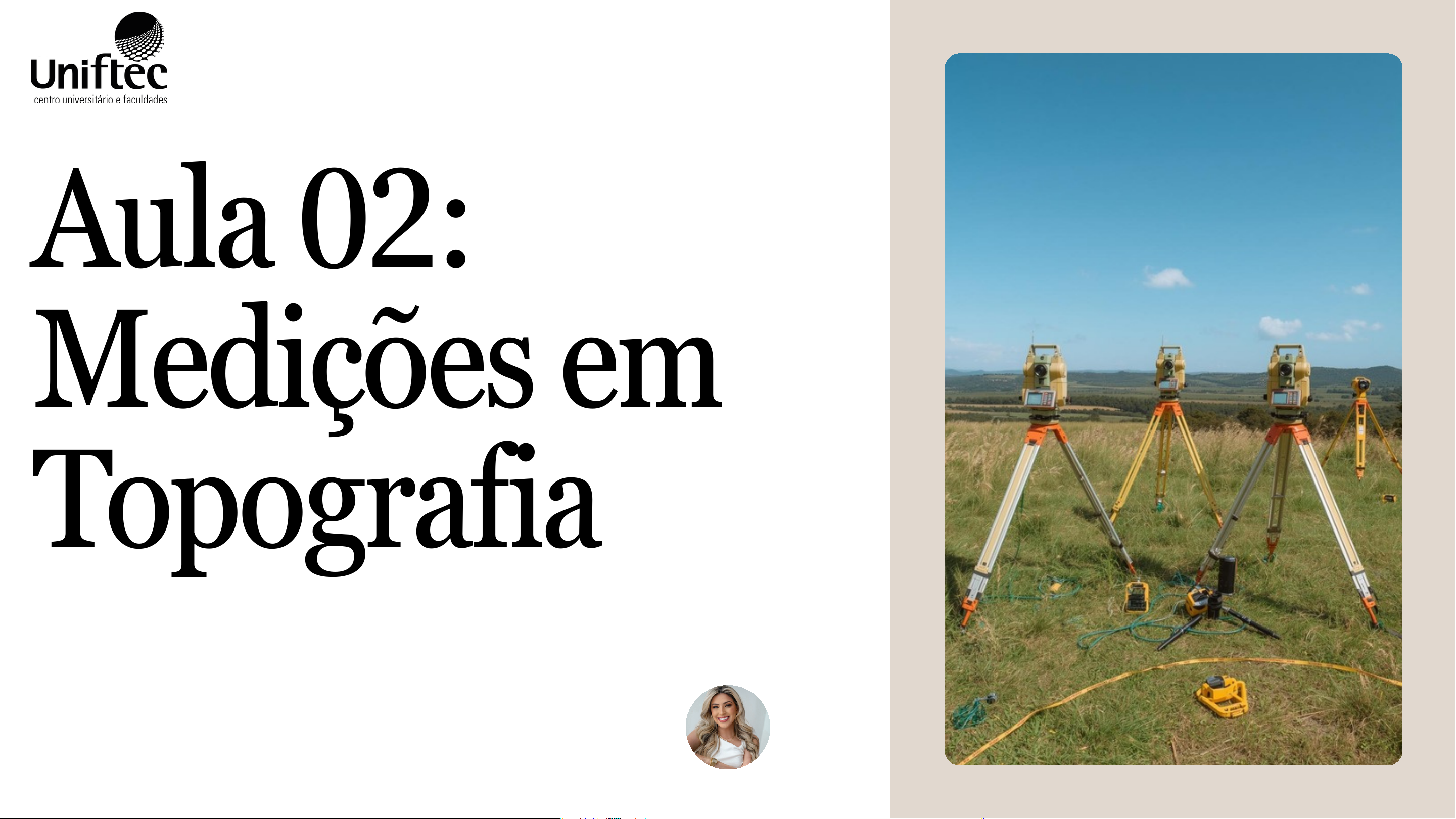 Cursos: Engenharia Civil - Arquitetura Aula 02: Medições em Topografia Prof: Me Renata Reis de Jesus 2 Conteúdo Programático 1.Grandezas medidas em topografia 2.Distâncias: horizontal, inclinada e vertical 3.Ângulos horizontais 4.Ângulos verticais 5.Sistemas de medida de ângulos 6.Erros de medição 3 Introduçao Após compreender os conceitos fundamentais da Topografia e as formas de representação do terreno (AULA 01) , é necessário entender como essas informações são obtidas. Os levantamentos topográficos baseiam-se principalmente na medição de distâncias e ângulos, que permitem determinar a posição dos pontos e descrever a geometria do terreno. 4 As grandezas medidas em um levantamento topográfico podem ser de dois tipos: angulares e lineares. 1.AS GRANDEZAS MEDIDAS 5 1.1 Grandezas Angulares 1.1.1 Ângulo Horizontal (Hz): É medido entre as projeções de dois alinhamentos do terreno, no plano horizontal. A figura a seguir exemplifica um ângulo horizontal medido entre as arestas (1 e 2) de duas paredes de uma edificação. O ângulo horizontal é o mesmo para os três planos horizontais mostrados 6 1.1 Grandezas Angulares 1.1.2 Ângulo Vertical (α) O ângulo vertical (α) é medido entre um alinhamento do terreno e o plano do horizonte, podendo ser ascendente (+) ou descendente (-). A Figura 2 exemplifica ângulos medidos nas arestas superior e inferior de uma parede, que diferem conforme a posição do horizonte. Em equipamentos como teodolito e estação total, também pode ser medido a partir da vertical, sendo denominado ângulo zenital ou nadiral, conforme ilustrado na figura 3. FIGURA 02 FIGURA 03 7 1.2 Grandezas Lineares 1.2.1Distância Horizontal (DH)) é a distância medida entre dois pontos, no plano horizontal. Este plano pode, conforme indicado na figura a seguir (GARCIA, 1984), passar tanto pelo ponto A, quanto pelo ponto B em questão. 1.2.2 Distância Vertical ou Diferença de Nível (DV ou DN) é a distância medida entre dois pontos, num plano vertical que é perpendicular ao plano horizontal. Este plano vertical pode passar por qualquer um dos pontos A/A’ ou B/B’ já 1.2.3 Distância Inclinada (DI): é a distância medida entre dois pontos, em planos que seguem a inclinação da superfície do terreno. É importante relembrar que as grandezas representadas pela planimetria são: distância e ângulo horizontais (planta); enquanto as grandezas representadas pela altimetria são: distância e ângulo verticais, representados em planta através das curvas de nível, ou, através de um perfil. 8 2 Sistemas de Medida de Ângulos Os ângulos utilizados em topografia podem ser expressos em diferentes sistemas de medida. Os principais sistemas utilizados são o sistema sexagesimal, o sistema centesimal e o sistema circular. 9 2 Sistemas de Medida de Ângulos 2.1 Sistema Sexagesimal É o sistema mais utilizado na topografia. No sistema sexagesimal, o círculo trigonométrico é dividido em 360 partes, tendo como unidade básica o grau (Figura 4). FIGURA 04 Exemplo 10 2 Sistemas de Medida de Ângulos 2.1 Sistema Sexagesimal Exemplo: 11 2 Sistemas de Medida de Ângulos 2.2 Sistema centesimal e radiano O sistema centesimal já foi empregado na topografi a, mas já não é tão comum na atualidade. No sistema centesimal, o círculo trigonométrico é dividido em 400 partes, tendo como unidade básica o grado (Figura 4). Círculo: 400gr Unidade básica: 1gr Submúltiplos: centígrados e decimiligrados. 12 2 Sistemas de Medida de Ângulos 2.2 Sistema centesimal e radiano Radiano O radiano é o ângulo central correspondente a um arco de comprimento igual ao raio (Figura 5). É muito utilizado na construção de rotinas automatizadas e algoritmos matemáticos. 13 2 Sistemas de Medida de Ângulos 2.3 Conversão de medidas No Quadro 1, apresentamos a conversão de sistemas de unidades de medidas angulares vistos anteriormente. 14 2 Sistemas de Medida de Ângulos 15 3 Teoria dos erros em medições Nas atividades topográficas, medições de distâncias e ângulos são fundamentais para determinar a posição dos pontos no terreno. Entretanto, nenhuma medição é perfeitamente exata. Diversos fatores podem influenciar os resultados, como: • instrumentos utilizados • condições ambientais • atuação do operador Por isso, é necessário compreender os erros que podem ocorrer nas medições topográficas. 16 3 Teoria dos erros em medições 3.1 Classificação dos erros Os erros nas medições topográficas podem ser classificados em três categorias principais: Erros grosseiros Erros sistemáticos Erros acidentais (ou aleatórios) Esses erros possuem origens diferentes e afetam os resultados das medições de maneiras distintas. 17 3 Teoria dos erros em medições 3.1.1 Erros grosseiros São erros causados por falhas humanas durante a realização das medições. Exemplos: erro de leitura no instrumento erro de anotação dos valores visada em ponto incorreto erro na contagem de medições Esses erros devem ser identificados e eliminados durante o trabalho de campo. 18 3 Teoria dos erros em medições 3.1.2 Erros sistemáticos São erros que seguem uma tendência ou uma lei definida, podendo ocorrer sempre no mesmo sentido. Quando sua causa é conhecida, podem ser identificados e corrigidos. Exemplos: dilatação da trena devido à temperatura erro de calibração do instrumento força de tração aplicada durante a medição 19 São erros que ocorrem de forma imprevisível, causados por pequenas variações nas condições de observação. Podem apresentar valores positivos ou negativos. Exemplos: pequenas variações na leitura do instrumento imperfeições na visada variações nas condições ambientais Esses erros não podem ser totalmente eliminados, mas podem ser reduzidos por meio da repetição das medições. 3 Teoria dos erros em medições 3.1.3 Erros acidentais (ou aleatórios) 20 4 Instrumentos utilizados nas medições topográficas 4.