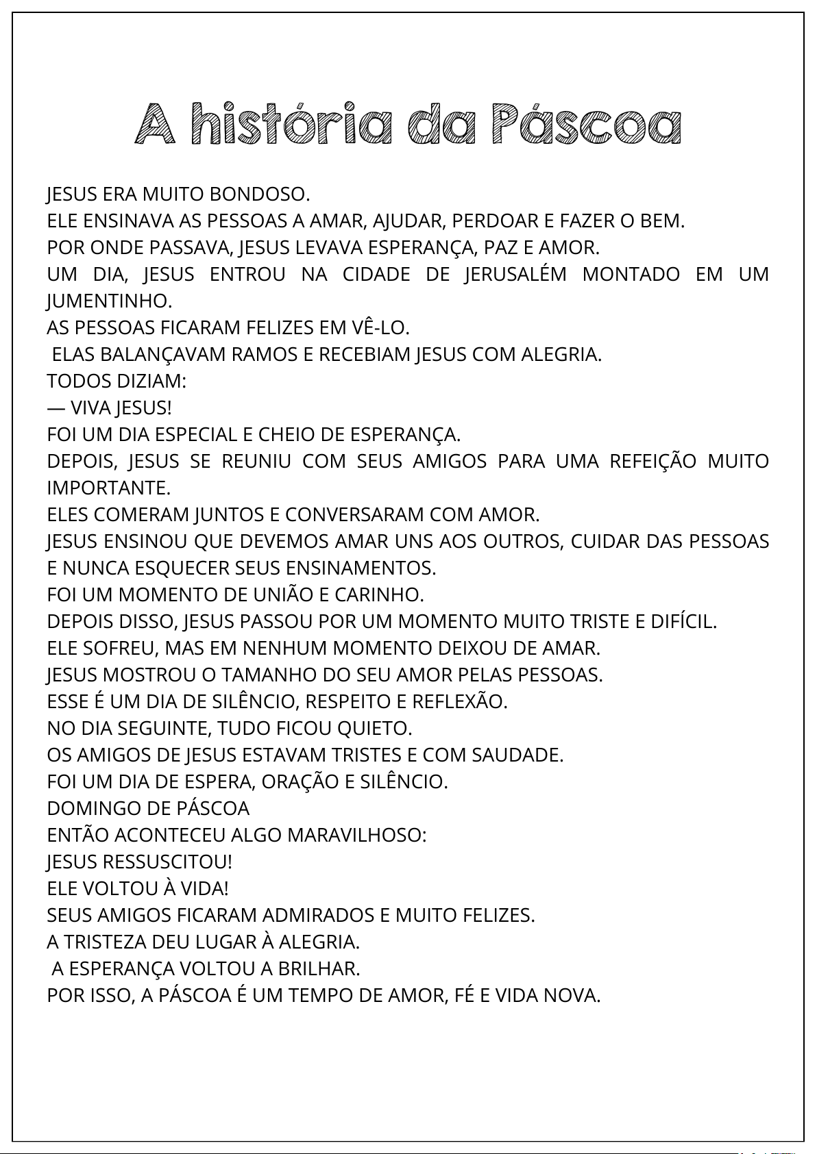A história da Páscoa JESUS ERA MUITO BONDOSO. ELE ENSINAVA AS PESSOAS A AMAR, AJUDAR, PERDOAR E FAZER O BEM. POR ONDE PASSAVA, JESUS LEVAVA ESPERANÇA, PAZ E AMOR. UM DIA, JESUS ENTROU NA CIDADE DE JERUSALÉM MONTADO EM UM JUMENTINHO. AS PESSOAS FICARAM FELIZES EM VÊ-LO. ELAS BALANÇAVAM RAMOS E RECEBIAM JESUS COM ALEGRIA. TODOS DIZIAM: — VIVA JESUS! FOI UM DIA ESPECIAL E CHEIO DE ESPERANÇA. DEPOIS, JESUS SE REUNIU COM SEUS AMIGOS PARA UMA REFEIÇÃO MUITO IMPORTANTE. ELES COMERAM JUNTOS E CONVERSARAM COM AMOR. JESUS ENSINOU QUE DEVEMOS AMAR UNS AOS OUTROS, CUIDAR DAS PESSOAS E NUNCA ESQUECER SEUS ENSINAMENTOS. FOI UM MOMENTO DE UNIÃO E CARINHO. DEPOIS DISSO, JESUS PASSOU POR UM MOMENTO MUITO TRISTE E DIFÍCIL. ELE SOFREU, MAS EM NENHUM MOMENTO DEIXOU DE AMAR. JESUS MOSTROU O TAMANHO DO SEU AMOR PELAS PESSOAS. ESSE É UM DIA DE SILÊNCIO, RESPEITO E REFLEXÃO. NO DIA SEGUINTE, TUDO FICOU QUIETO. OS AMIGOS DE JESUS ESTAVAM TRISTES E COM SAUDADE. FOI UM DIA DE ESPERA, ORAÇÃO E SILÊNCIO. DOMINGO DE PÁSCOA ENTÃO ACONTECEU ALGO MARAVILHOSO: JESUS RESSUSCITOU! ELE VOLTOU À VIDA! SEUS AMIGOS FICARAM ADMIRADOS E MUITO FELIZES. A TRISTEZA DEU LUGAR À ALEGRIA. A ESPERANÇA VOLTOU A BRILHAR. POR ISSO, A PÁSCOA É UM TEMPO DE AMOR, FÉ E VIDA NOVA. ´ DOMINGO DE PÁSCOA