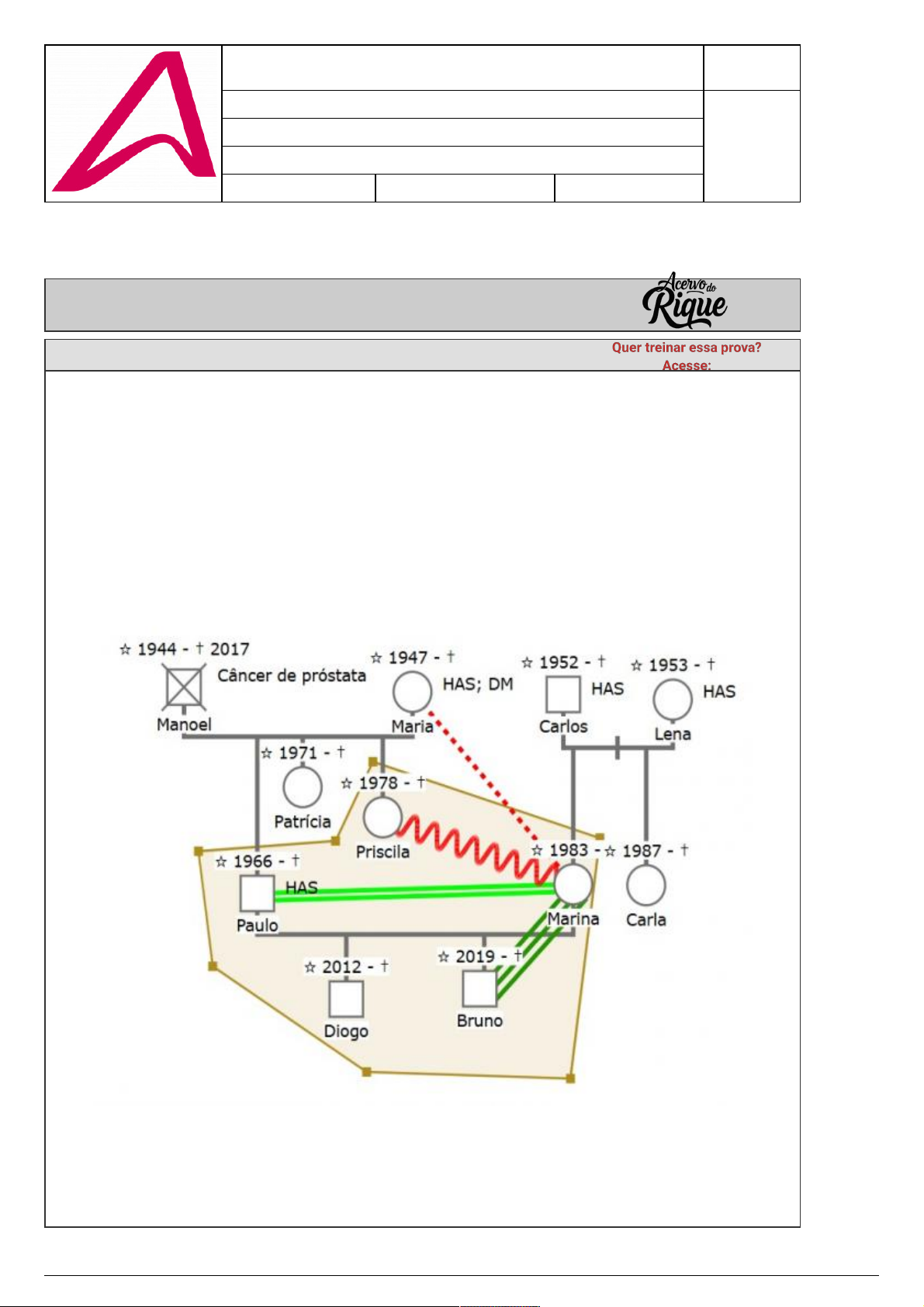 AFYA CURSO DE MEDICINA - AFYA NOTA FINAL Aluno: Componente Curricular: Integração Ensino Serviço Comunidade III Professor (es): Período: 202402 Turma: Data: N1 ESPECÍFICA_3 PERIODO_25 SETEMBRO_2024.2_PROVA_IESC RELATÓRIO DE DEVOLUTIVA DE PROVA PROVA 13538 - CADERNO 001 1ª QUESTÃO Enunciado: ( AFYA PARAÍBA) O genograma é uma representação gráfica usada para mapear a estrutura familiar, incluindo relacionamentos, padrões de saúde e dinâmicas emocionais ao longo de gerações. Ele utiliza símbolos padronizados para identificar membros da família, suas relações e aspectos importantes como doenças, eventos marcantes e características comportamentais. O genograma abaixo foi construído por uma equipe de saúde da família e se refere a Família Queiroga. GENOGRAMA DA FAMÍLIA QUEIROGA (22/11/2022) Alves (2024) Com base no exposto, descreva as informações presentes nesta ferramenta de abordagem familiar e interprete as relações entre os membros da família. 000135.38001d.c44af3.95bfae.b8a3ec.579231.84559c.ced91 Pgina 1 de 15 acervo.top / acervotop.com Alternativas: -- Resposta comentada: O genograma foi elaborado, no dia 22/11/2022, sendo possível obter as seguintes informações: 1 - Manoel, já falecido, foi casado com Maria e tiveram 3 filhos (Paulo, Patrícia e Priscila); 2 - Carlos separado de Lena, tiveram 2 filhas (Marina e Carla); 3 - Paulo se casou com Marina e têm 2 filhos (Diogo e Bruno); 4 - Moram no mesmo domicílio: Paulo, Marina, Diogo, Bruno e Priscila; 5 - Marina e Paulo possuem uma relação próxima; Marina e Bruno têm uma relação muito forte; Marina tem conflito com sua cunhada (Priscila) e um relacionamento distante com sua sogra (Maria); 6 - Paulo e os pais de Marina são hipertensos; Manoel teve câncer de próstata e Maria é hipertensa e diabética. Referência: DUNCAN, BRUCE, B. et al. Medicina ambulatorial: condutas de atenção primária baseadas em evidências. Disponível em: Minha Biblioteca, (5th edição). Grupo A, 2022. (cap. 20). Feedback: -- 2ª QUESTÃO Enunciado: ( UNISL PORTO VELHO) Durante uma visita domiciliar, um médico realiza a avaliação da dinâmica familiar para entender melhor o contexto em que sua paciente vive. Ele decide usar a ferramenta APGAR familiar para esta finalidade. O APGAR familiar é um instrumento útil para avaliar a estrutura e o funcionamento familiar, sendo especialmente relevante em contextos de apoio psicológico e social. Considerando a aplicação do APGAR familiar, identifique qual das seguintes afirmações melhor descreve a característica do APGAR familiar como ferramenta de abordagem familiar. 000135.38001d.c44af3.95bfae.b8a3ec.579231.84559c.ced91 Pgina 2 de 15 Alternativas: (alternativa A) O APGAR familiar é uma ferramenta diagnóstica para avaliar e tratar transtornos psiquiátricos individuais e familiares. (alternativa B) O APGAR familiar foca exclusivamente na avaliação dos aspectos econômicos da família e na qualidade das relações. (alternativa C) O APGAR familiar substitui a necessidade de uma avaliação médica convencional ao fornecer diagnósticos clínicos detalhados. (alternativa D) (CORRETA) O APGAR familiar avalia o grau de apoio emocional e funcional dos membros da família e a qualidade das relações familiares. Resposta comentada: A ferramenta reflete a satisfação de cada membro da família, representado pela sigla APGAR, que significa: Adaptation (Adaptação), Partnership (Participação), Growth (Crescimento), Affection (Afeição) e Resolve (Resolução). A avaliação será feita para cada membro da família, por questionário de cinco perguntas referentes aos aspectos abordados, que serão pontuadas e analisadas depois. Os diferentes índices de cada membro devem ser comparados para se avaliar o estado funcional da família. A partir da aplicação do questionário e da avaliação do quadro familiar pode-se desenhar um plano terapêutico que poderá ser desenvolvido pelo próprio médico de família ou pode exigir a participação de outros profissionais, como enfermeiros, psicólogos, psiquiatras, terapeutas ocupacionais ou de família. Sendo assim o APGAR familiar é projetado para avaliar como a família funciona em termos de apoio emocional, coesão e satisfação dos membros. Não é focado apenas em aspectos econômicos, nem substitui diagnósticos médicos convencionais, e não se destina a diagnosticar transtornos psiquiátricos individuais. Referência: CHAPADEIRO, C. A. et al. A família como foco da atenção primária à Saúde. Belo Horizonte: Nescon/UFMG, 2011. Feedback: -- 3ª QUESTÃO Enunciado: ( AFYA MANACAPURU) Família é um grupo de pessoas que convivem, tem laços intensos de proximidade, compartilham sentimento de identidade e pertencimento, possui objetivos relacionados com a preservação, a nutrição e a proteção daqueles que vivem em conjunto e tem seu próprio modo de perceber o mundo. A respeito do ciclo de vida de uma família, identifique as características e mudanças necessárias referentes aos estágios do ciclo de vida e assinale a alternativa correta. 000135.38001d.c44af3.95bfae.b8a3ec.579231.84559c.ced91 Pgina 3 de 15 Alternativas: (alternativa A) São características do estágio familiar de um novo casal: ajustar o sistema conjugal para criar espaço para os filhos, unindo-se na tarefa de educar, deve incluir papeis importantes dentro da família como de pais e avós. (alternativa B) São características do estágio de famílias com filhos pequenos: aumentar a flexibilidade das fronteiras familiares para incluir a independência dos filhos e a fragilidade dos avós, procurando novo foco em questões familiares. (alternativa C) São características do estágio de famílias com adolescentes: renegociar o sistema conjugal como uma díade, aceitando entradas e saídas no sistema familiar é um grande desafio nesse ciclo familiar apresentando muitas mudanças. (alternativa D) (CORRETA) São características do est