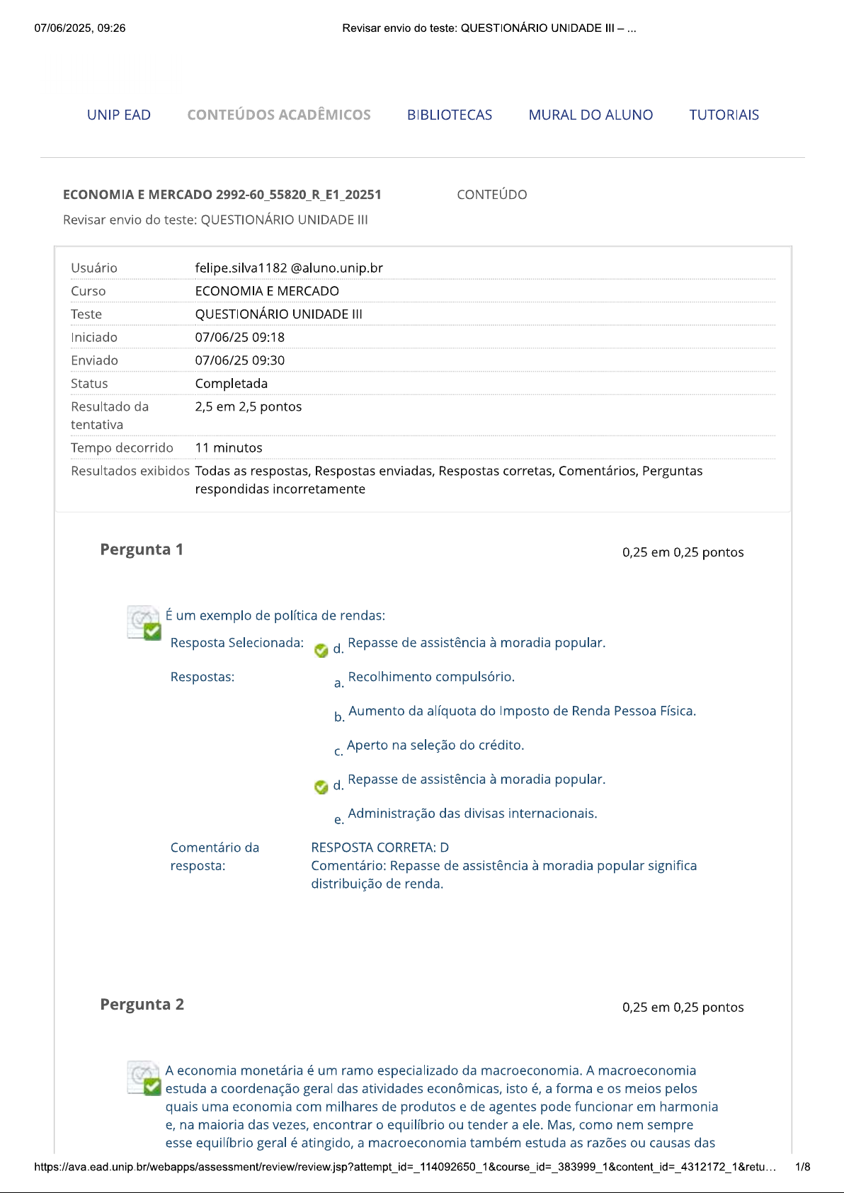 07/06/2025, 09:26 Revisar envio do teste: QUESTIONÁRIO UNIDADE III UNIP EAD CONTEÚDOS ACADÊMICOS BIBLIOTECAS MURAL DO ALUNO TUTORIAIS ECONOMIA E MERCADO 2992-60_55820_R_E1_20251 CONTEÚDO Revisar envio do teste: QUESTIONÁRIO UNIDADE III Usuário felipe.silva1182 @aluno.unip.br Curso ECONOMIA E MERCADO Teste QUESTIONÁRIO UNIDADE III Iniciado 07/06/25 09:18 Enviado 07/06/25 09:30 Status Completada Resultado da 2,5 em 2,5 pontos tentativa Tempo decorrido 11 minutos Resultados exibidos Todas as respostas, Respostas enviadas, Respostas corretas, Comentários, Perguntas respondidas incorretamente Pergunta 1 0,25 em 0,25 pontos É um exemplo de política de rendas: Resposta Selecionada: d. Repasse de assistência à moradia popular. Respostas: Recolhimento compulsório. a. b. Aumento da alíquota do Imposto de Renda Pessoa Física. Aperto na seleção do crédito. d. Repasse de assistência à moradia popular. Administração das divisas internacionais. e. Comentário da RESPOSTA CORRETA: D resposta: Comentário: Repasse de assistência à moradia popular significa distribuição de renda. Pergunta 2 0,25 em 0,25 pontos A economia monetária é um ramo especializado da macroeconomia. A macroeconomia estuda a coordenação geral das atividades econômicas, isto é, a forma e os meios pelos quais uma economia com milhares de produtos e de agentes pode funcionar em harmonia e, na maioria das vezes, encontrar equilíbrio ou tender a ele. Mas, como nem sempre esse equilíbrio geral é atingido, a macroeconomia também estuda as razões ou causas das 1/807/06/2025, 09:26 Revisar envio do teste: QUESTIONÁRIO UNIDADE III falhas dessa coordenação, bem como as suas possíveis correções por meio de políticas econômicas apropriadas. Essas falhas se manifestam por desequilíbrios tais como instabilidade do nível de preços, do balanço de pagamentos e do crescimento da renda, com repercussões na oferta de emprego. Diante dessas falhas, a condução da política econômica apresenta-se como norteadora dos objetivos que um governo pretende traçar para sua sociedade. Sobre políticas econômicas, assinale a alternativa correta. Resposta e. Selecionada: Se governo elevar a cobrança de impostos das empresas, duas importantes repercussões estão previstas: redução dos resultados, que torna capital investido menos atraente, e também menor capacidade de investimento por acumular menores fluxos de caixa, tornando a empresa mais dependente de empréstimos para financiar sua atividade. Respostas: a. A política fiscal enfatiza sua atuação sobre os meios de pagamento, títulos públicos e taxas de juros, modificando custo e nível de oferta do crédito. b. A política monetária centraliza suas preocupações nos gastos do setor público e nos impostos cobrados da sociedade, procurando, por meio de maior eficácia no equilíbrio entre a arrecadação tributária e as despesas governamentais, atingir determinados objetivos macroeconômicos e sociais. C. A política cambial está baseada na administração das taxas de câmbio, promovendo alterações das cotações cambiais, e, de forma mais abrangente, no controle das transações internacionais executadas por um país. É fixada de maneira a dificultar as necessidades de expansão da economia e promover seu desenvolvimento econômico. d. Banco Central costuma realizar diversos empréstimos às instituições financeiras, conhecidos por empréstimos de assistência à liquidez, visando equilibrar suas necessidades de caixa diante de um aumento mais acentuado de demanda por recursos de seus depositantes. A este tipo de instrumento dá-se nome de operação de recolhimento compulsório. e. Se governo elevar a cobrança de impostos das empresas, duas importantes repercussões estão previstas: redução dos resultados, que torna capital investido menos atraente, e também menor capacidade de investimento por acumular menores fluxos de caixa, tornando a empresa mais dependente de empréstimos para financiar sua atividade. Comentário RESPOSTA CORRETA: E da resposta: Comentário: A alternativa A está incorreta, pois os exemplos citados referem-se à política monetária. A alternativa está incorreta, pois os exemplos citados remetem à política fiscal. A alternativa está incorreta, pois a política cambial visa permitir maior crescimento econômico. A alternativa D está, incorreta pois nome correto do instrumento é operação de redesconto ou ainda assistência à liquidez. Pergunta 3 0,25 em 0,25 pontos 2/807/06/2025, 09:26 Revisar envio do teste: QUESTIONÁRIO UNIDADE III Avalie as afirmativas que tratam dos objetivos da política fiscal, bem como das funções do governo. I. Função alocativa compreende a produção e a provisão de bens e serviços que atenderão às necessidades da sociedade. II. Função distributiva pode ser caracterizada como transferências de renda, de que são exemplos pagamentos de aposentadorias e pensões. III. principal objetivo da função estabilizadora é manter nível de atividade econômica e governo tende a reduzir gastos públicos quando deseja expandir as condições de crescimento econômico. É correto que se afirma em: Resposta Selecionada: b. e apenas. Respostas: a. I, e III. b. le apenas. e III apenas. d. le III apenas. e. III apenas. Comentário da RESPOSTA CORRETA: B resposta: Comentário: Se governo desejar expandir as condições de crescimento econômico deverá aumentar os gastos públicos e não diminuir. Pergunta 4 0,25 em 0,25 pontos Com relação às características da moeda, indique a alternativa incorreta. Resposta d. Selecionada: As moedas metálicas e cédulas devem ser facilmente manuseáveis, de tamanho e peso apropriados para que se permita representar sua característica de divisibilidade. Respostas: a. A constante troca de moeda entre diferentes pessoas requer que a moeda assuma a durabilidade como uma de suas características. b. A característica manuseabilidade é permitida à m