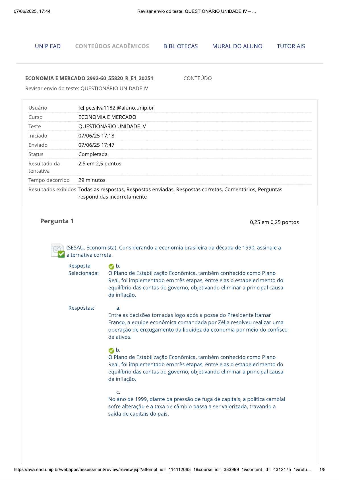 07/06/2025, 17:44 Revisar envio do teste: QUESTIONÁRIO UNIDADE IV UNIP EAD CONTEÚDOS ACADÊMICOS BIBLIOTECAS MURAL DO ALUNO TUTORIAIS ECONOMIA E MERCADO 2992-60_55820_R_E1_20251 CONTEÚDO Revisar envio do teste: QUESTIONÁRIO UNIDADE IV Usuário felipe.silva1182 @aluno.unip.br Curso ECONOMIA E MERCADO Teste QUESTIONÁRIO UNIDADE IV Iniciado 07/06/25 17:18 Enviado 07/06/25 17:47 Status Completada Resultado da 2,5 em 2,5 pontos tentativa Tempo decorrido 29 minutos Resultados exibidos Todas as respostas, Respostas enviadas, Respostas corretas, Comentários, Perguntas respondidas incorretamente Pergunta 1 0,25 em 0,25 pontos (SESAU, Economista). Considerando a economia brasileira da década de 1990, assinale a alternativa correta. Resposta b. Selecionada: Plano de Estabilização Econômica, também conhecido como Plano Real, foi implementado em três etapas, entre elas estabelecimento do equilíbrio das contas do governo, objetivando eliminar a principal causa da inflação. Respostas: a. Entre as decisões tomadas logo após a posse do Presidente Itamar Franco, a equipe econômica comandada por Zélia resolveu realizar uma operação de enxugamento da liquidez da economia por meio do confisco de ativos. b. Plano de Estabilização Econômica, também conhecido como Plano Real, foi implementado em três etapas, entre elas estabelecimento do equilíbrio das contas do governo, objetivando eliminar a principal causa da inflação. C. No ano de 1999, diante da pressão de fuga de capitais, a política cambial sofre alteração e a taxa de câmbio passa a ser valorizada, travando a saída de capitais do país. 1/807/06/2025, 17:44 Revisar envio do teste: QUESTIONÁRIO UNIDADE IV d. As reformas estruturais promovidas pelos governos da década de 1990 colocavam Estado no centro da discussão, com objetivo de promover bem-estar social por meio da adoção de mecanismos de controle da livre-iniciativa, inclusive para cumprir papel de gerador de renda e riqueza. e. Entre os resultados econômicos do Plano Real, ao final do primeiro governo de FHC, pode-se mencionar a adoção de uma política agressiva para eliminar desemprego estrutural advindo das medidas de abertura do mercado. Comentário da RESPOSTA CORRETA: resposta: Comentário: A implantação do Plano Real deu-se em três etapas diferentes e consecutivas, a primeira com o controle fiscal, a segunda com a criação da URV e a terceira com a introdução da nova moeda. Pergunta 2 0,25 em 0,25 pontos (Adaptado de Fundação Getúlio Vargas 2016) As opções a seguir apresentam mudanças importantes realizadas no governo FHC, notadamente no período 1995-2002, que deixaram uma herança positiva para futuro, à exceção de uma. Assinale-a. Resposta Queda acentuada da taxa de juros. C. Selecionada: Respostas: a. As privatizações. b. ajuste fiscal. Queda acentuada da taxa de juros. C. d. A renegociação de dívidas. e. A criação de diversas agências reguladoras de serviços públicos. Comentário da Resposta: resposta: Comentário: a única resposta incorreta se refere à queda dos juros, pois, do contrário, para poder levar adiante processo de estabilização, as taxas de juros tiveram que ser elevadas como forma de atração e manutenção de capital estrangeiro no país. Pergunta 3 0,25 em 0,25 pontos Dilma Roussef assumiu a presidência do Brasil em janeiro de 2011, sendo a primeira Presidente mulher do país. Sobre os primeiros meses de seu governo, assinale a alternativa 2/807/06/2025, 17:44 Revisar envio do teste: QUESTIONÁRIO UNIDADE IV incorreta. Resposta b. Selecionada: Uma mudança do governo Dilma foi a adoção de medidas liberalizantes como forma de provocar concorrência entre as empresas, notadamente as do setor automobilístico. Respostas: a. O governo optou por uma gestão com política monetária expansionista. b. Uma mudança do governo Dilma foi a adoção de medidas liberalizantes como forma de provocar concorrência entre as empresas, notadamente as do setor automobilístico. A Presidenta Dilma mudou a política cambial, deixando de lado que se chama de flutuação suja e se fixando na busca de uma taxa de câmbio mais desvalorizada, com a utilização de medidas de intervenção como IOF. d. No governo de Dilma, um dos objetivos da política de aumento da proteção da indústria era claramente o de permitir aumentos salariais superiores aos de nossos concorrentes externos. e. Em janeiro de 2011, primeiro mês do governo Dilma, índice de inflação registrou uma alta maior desde 2005. Comentário da RESPOSTA CORRETA: resposta: Comentário: governo procurou proteger a indústria automobilística com a diminuição do IPI. Pergunta 4 0,25 em 0,25 pontos No começo de 2002, Lula, uma vez mais candidato do Partido dos Trabalhadores (PT), pareceu ter fortes probabilidades de vencer a eleição presidencial. Leia as afirmativas a seguir e assinale a alternativa correta. I- Com a possibilidade da eleição de Lula para Presidente em 2002, os mercados financeiros internacionais reagiram negativamente e a moeda nacional desvalorizou-se. II- medo generalizado que havia surgido em 1989, depois da vitória de Collor, não se repetiu com a candidatura de Lula em 2001 e diversos empresários expressaram apoio ao candidato. III- Em 2002, a meta do superávit anual foi elevada e Banco Central elevou a taxa Selic. IV- governo Lula, em 2002, rompeu com o FMI. É correto o que se afirma em: Resposta Selecionada: I, e III apenas. a. Respostas: a. I, e III apenas. b. e III apenas. C. e IV apenas. 3/807/06/2025, 17:44 Revisar envio do teste: QUESTIONÁRIO UNIDADE IV d. I, III e IV apenas. e. e IV apenas. Comentário da RESPOSTA CORRETA: A resposta: Comentário: A possibilidade de Lula ser presidente não foi bem vista pelos mercados financeiros e a cotação do dólar disparou. governo Lula continuou a política de câmbio desvalorizado e cumpriu os acordos com FMI anteriormente firmados. Pergunta 5 0,25 em 0,25 pontos No seu discurso