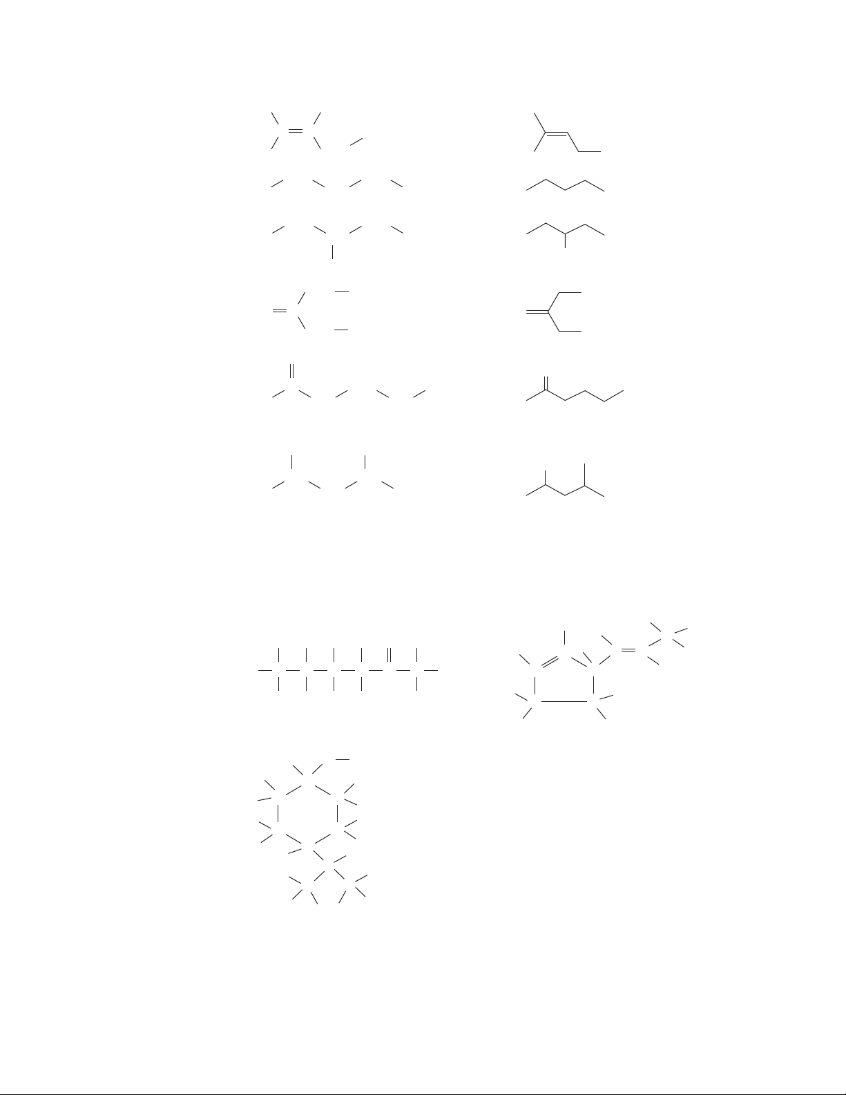 4 THE BASICS: BONDING AND MOLECULAR STRUCTURE (f ) (d) (c) (e) (g) (h) CH2 CH2 CH3 CH3CH2 = CH3 CH3 C C C H CH3 CH2 = CH3 CH2 CH2 CH OH CH3 = ΟΗ CH3 CH2 CH2 CH2 CH3 = CH3 CH3 C CH2 O CH2 CH3 CH2 = Ο CH CH Cl CH2 CH3 CH3 = Cl 1.15 (a) and (d) are constitutional isomers with the molecular formula C5H12. (b) and (e) are constitutional isomers with the molecular formula C5H12O. (c) and (f) are constitutional isomers with the molecular formula C6H12. 1.16 CH H H H C H H C H H C H H C O C H Cl (a) H (c) H H H H C C C C H HH C C C H HH C H (b) H O H H H H C H H H H H H C C C H H H H H H C C C CC H