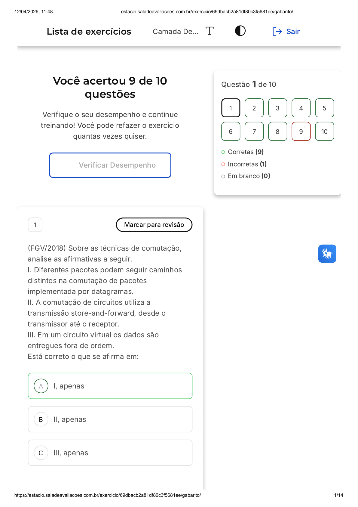 Você acertou 9 de 10 questões Verifique o seu desempenho e continue treinando! Você pode refazer o exercício quantas vezes quiser. Verificar Desempenho A B C 1 Marcar para revisão (FGV/2018) Sobre as técnicas de comutação, analise as afirmativas a seguir. I. Diferentes pacotes podem seguir caminhos distintos na comutação de pacotes implementada por datagramas. II. A comutação de circuitos utiliza a transmissão store-and-forward, desde o transmissor até o receptor. III. Em um circuito virtual os dados são entregues fora de ordem. Está correto o que se afirma em: I, apenas II, apenas III, apenas Questão 1 de 10 Corretas (9) Incorretas (1) Em branco (0) 1 2 3 4 5 6 7 8 9 10 Lista de exercícios Camada De… Sair 12/04/2026, 11:48 estacio.saladeavaliacoes.com.br/exercicio/69dbacb2a81df80c3f5681ee/gabarito/ https://estacio.saladeavaliacoes.com.br/exercicio/69dbacb2a81df80c3f5681ee/gabarito/ 1/14 D E I e II, apenas I, II e III. Resposta correta Parabéns, você selecionou a alternativa correta. Confira o gabarito comentado! Gabarito Comentado Em um circuito virtual, os dados são entregues na ordem em que foram enviados. O circuito virtual é estabelecido antes da transmissão dos dados e garante que os pacotes serão entregues ao destino na ordem correta. A comutação de pacotes utiliza a transmissão store-and-forward. 2 Marcar para revisão (UFR/2021 - Adaptada) O IPv4 é uma versão do Protocolo de Internet. Sobre as características do IPv4, marque V para as afirmativas verdadeiras e F para as falsas. ( ) Possui um limite de endereçamento. ( ) Requer uso de classe G e H em rede. ( ) Utiliza campo que informa sua versão. ( ) Elimina o uso de TTL, Offset e flags. Assinale a sequência correta. 12/04/2026, 11:48 estacio.saladeavaliacoes.com.br/exercicio/69dbacb2a81df80c3f5681ee/gabarito/ https://estacio.saladeavaliacoes.com.br/exercicio/69dbacb2a81df80c3f5681ee/gabarito/ 2/14 A B C D E V F F V V F V F F F V F F V F V F F F F Resposta correta Parabéns, você selecionou a alternativa correta. Confira o gabarito comentado! Gabarito Comentado Verdadeiro (V): O IPv4 possui um limite de endereçamento, que é de 32 bits. Isso significa que existem cerca de 4 bilhões de endereços IPv4 possíveis. Falso (F): O IPv4 não requer o uso de classes G e H em rede. As classes existentes são A, B e C. Verdadeiro (V): O IPv4 utiliza um campo no cabeçalho para informar sua versão. Esse campo tem 4 bits e é denominado "Versão do IP". Falso (F): O IPv4 utiliza o campo Time-to- Live (TTL) para limitar o tempo de vida de um pacote e evitar que ele circule indefinidamente na rede. Além disso, o IPv4 também utiliza o campo Offset para indicar a posição dos dados no pacote, e o 12/04/2026, 11:48 estacio.saladeavaliacoes.com.br/exercicio/69dbacb2a81df80c3f5681ee/gabarito/ https://estacio.saladeavaliacoes.com.br/exercicio/69dbacb2a81df80c3f5681ee/gabarito/ 3/14 A B C D E campo Flags para controlar a fragmentação de pacotes. 3 Marcar para revisão Dentre as alternativas, selecione a correta em relação à tabela de repasse. Deve possuir uma entrada para cada possível hospedeiro. São criadas para estabelecer as rotas em algoritmos de roteamento estáticos. São montadas com base em informações processadas pelo algoritmo de roteamento. São necessárias apenas quando se utiliza algoritmo de roteamento adaptativo. Todos os roteadores da sub-rede devem possuir a mesma tabela de repasse. Resposta correta Parabéns, você selecionou a alternativa correta. Confira o gabarito comentado! Gabarito Comentado 12/04/2026, 11:48 estacio.saladeavaliacoes.com.br/exercicio/69dbacb2a81df80c3f5681ee/gabarito/ https://estacio.saladeavaliacoes.com.br/exercicio/69dbacb2a81df80c3f5681ee/gabarito/ 4/14 A alternativa correta é: "São montadas com base em informações processadas pelo algoritmo de roteamento". A tabela de roteamento, também conhecida como tabela de repasse, é uma estrutura de dados que os roteadores utilizam para determinar o melhor caminho para encaminhar pacotes de rede até seu destino final. Essa tabela é construída a partir das informações coletadas e processadas pelo algoritmo de roteamento, que pode ser tanto estático quanto dinâmico. Essa tabela armazena informações sobre as rotas para diferentes destinos de rede e os endereços dos gateways ou próximos saltos a serem utilizados para alcançar esses destinos. Portanto, a tabela de roteamento é fundamental para o funcionamento eficiente de uma rede. 4 Marcar para revisão A camada de rede de uma rede de computadores pode oferecer os serviços de circuitos virtuais ou de datagramas. O tipo de serviço oferecido influencia diretamente na forma como os pacotes serão transportados entre origem e destino. Abaixo são realizadas comparações entre circuitos virtuais e datagramas: I - Nas redes de circuitos virtuais é estabelecido um caminho a ser seguido por todos os pacotes de uma conexão, enquanto nas redes de datagrama não existe o conceito de conexão. II - Em uma rede de circuitos virtuais os roteadores precisam armazenar as informações de todas as conexões que passam por ele, 12/04/2026, 11:48 estacio.saladeavaliacoes.com.br/exercicio/69dbacb2a81df80c3f5681ee/gabarito/ https://estacio.saladeavaliacoes.com.br/exercicio/69dbacb2a81df80c3f5681ee/gabarito/ 5/14 A B C D E enquanto nas redes de datagrama basta saber como chegar a cada destino. III - Como necessitam conhecer o caminho, somente as redes de circuito virtual precisam executar algoritmos de roteamento. Redes de datagramas não possuem esta necessidade. Com base nas comparações acima, é correto o que se afirma em: I somente. I e II somente. II e III somente. I e III somente. Todas as afirmações estão corretas. Resposta correta Parabéns, você selecionou a alternativa correta. Confira o gabarito comentado! Gabarito Comentado As afirmações I e II estão corretas. Na rede de circuitos virtuais, é estabelecido um caminho a ser seguido por todos os pa