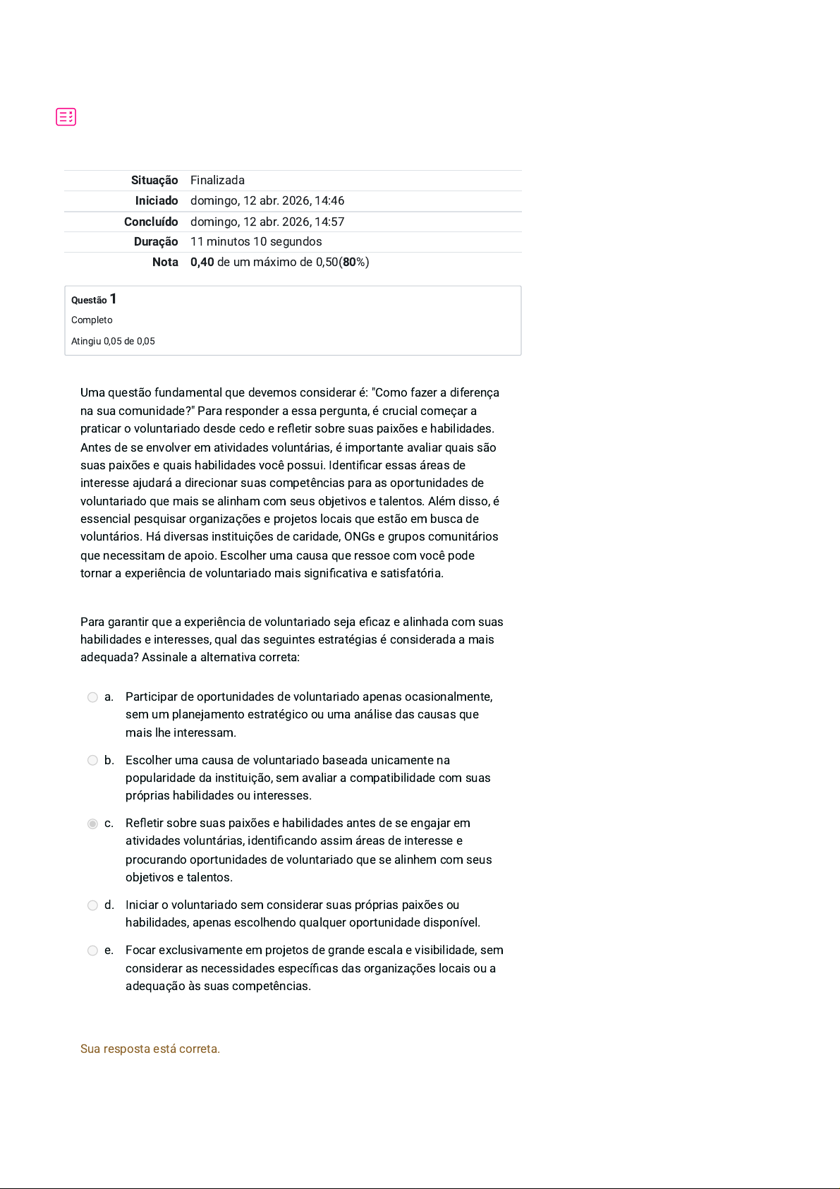Situação Finalizada Iniciado domingo, 12 abr. 2026, 14:46 Concluído domingo, 12 abr. 2026, 14:57 Duração 11 minutos 10 segundos Nota 0,40 de um máximo de 0,50(80%) Questão 1 Completo Atingiu 0,05 de 0,05 Uma questão fundamental que devemos considerar é: "Como fazer a diferença na sua comunidade?" Para responder a essa pergunta, é crucial começar a praticar o voluntariado desde cedo e refletir sobre suas paixões e habilidades. Antes de se envolver em atividades voluntárias, é importante avaliar quais são suas paixões e quais habilidades você possui. Identificar essas áreas de interesse ajudará a direcionar suas competências para as oportunidades de voluntariado que mais se alinham com seus objetivos e talentos. Além disso, é essencial pesquisar organizações e projetos locais que estão em busca de voluntários. Há diversas instituições de caridade, ONGs e grupos comunitários que necessitam de apoio. Escolher uma causa que ressoe com você pode tornar a experiência de voluntariado mais significativa e satisfatória. Para garantir que a experiência de voluntariado seja eficaz e alinhada com suas habilidades e interesses, qual das seguintes estratégias é considerada a mais adequada? Assinale a alternativa correta: a. Participar de oportunidades de voluntariado apenas ocasionalmente, sem um planejamento estratégico ou uma análise das causas que mais lhe interessam. b. Escolher uma causa de voluntariado baseada unicamente na popularidade da instituição, sem avaliar a compatibilidade com suas próprias habilidades ou interesses. c. Refletir sobre suas paixões e habilidades antes de se engajar em atividades voluntárias, identificando assim áreas de interesse e procurando oportunidades de voluntariado que se alinhem com seus objetivos e talentos. d. Iniciar o voluntariado sem considerar suas próprias paixões ou habilidades, apenas escolhendo qualquer oportunidade disponível. e. Focar exclusivamente em projetos de grande escala e visibilidade, sem considerar as necessidades específicas das organizações locais ou a adequação às suas competências. Sua resposta está correta. Questão 2 Completo Atingiu 0,00 de 0,05 Programas de voluntariado corporativo têm o potencial de melhorar significativamente o clima organizacional, aumentar a satisfação e motivação dos colaboradores e fortalecer a relação entre a empresa e seus funcionários. Além de trazer benefícios internos, esses programas também contribuem para a comunidade ao apoiar causas e projetos locais. As empresas podem utilizar seus recursos, expertise e tempo para ajudar organizações que atuam diretamente na sociedade, gerando um impacto positivo e transformador. Para implementar um programa de voluntariado corporativo eficaz, é essencial seguir algumas etapas básicas: I. Defina uma Política de Voluntariado: estabeleça uma política clara que detalhe os objetivos, áreas de atuação e expectativas da empresa e dos colaboradores. II. Identifique Causas Relevantes: escolha causas que estejam alinhadas com os valores da empresa e que também ressoem com os interesses dos funcionários. III. Envolva os Funcionários: engaje os funcionários desde o início, permitindo que eles sugiram projetos e participem da escolha das iniciativas apoiadas. IV. Estabeleça Parcerias com ONGs e Instituições: forme parcerias estratégicas com organizações que atuam nas áreas de interesse para facilitar a participação dos funcionários. V. Facilite a Participação: ofereça flexibilidade nos horários de trabalho e considere folgas remuneradas para atividades de voluntariado. VI. Monitore e Avalie o Impacto: implemente sistemas para monitorar a participação e avaliar o impacto das ações de voluntariado. Com base nesta informação, analise as asserções abaixo: I. A definição de uma política de voluntariado e a identificação de causas relevantes são etapas iniciais essenciais para a implementação eficaz de um programa de voluntariado corporativo. PORQUE II. Apenas fornecer flexibilidade de horários para participação em atividades de voluntariado, sem envolvimento dos funcionários na escolha das iniciativas ou estabelecimento de parcerias, é suficiente para garantir o sucesso do programa. A respeito dessas asserções, assinale a opção correta: a. A asserção I é uma proposição falsa e a II é uma proposição verdadeira. b. As asserções I e II são proposições verdadeiras e a II é uma justificativa correta da I. c. As asserções I e II são proposições verdadeiras, mas a II não é uma justificativa correta da I. d. A asserção I é uma proposição verdadeira e a II é uma proposição falsa. Questão 3 Completo Atingiu 0,05 de 0,05 e. As asserções I e II são proposições falsas. Sua resposta está incorreta. Pensando na ideia: “Transformando o mundo através do voluntariado: histórias inspiradoras”. Nos voltamos a duas histórias que podemos conhecer como o projeto de Roberto que nos remete a um banho de dignidade. Roberto, um empreendedor social brasileiro, fundou o “Projeto Banho Solidário” em São Paulo para oferecer a pessoas em situação de rua acesso a um banho quente e serviços adicionais. Assinale Verdadeiro (V) ou Falso (F): ( ) O “Projeto Banho Solidário” criado por Roberto oferece não apenas banho, mas também cortes de cabelo e orientação para serviços sociais. ( ) A Biblioteca Itinerante de Sofia não inclui atividades educativas, apenas a distribuição de livros. ( ) O projeto de Roberto visa proporcionar acesso à higiene básica e ajudar na recuperação da autoestima e dignidade das pessoas em situação de rua. ( ) A iniciativa de Sofia visa levar livros a comunidades rurais e não envolve a realização de sessões de leitura. ( ) O impacto do projeto de Sofia é significativo, inspirando crianças a buscar uma educação melhor através da promoção da leitura. Assinale a alternativa correta: a. V - F - V - F - V