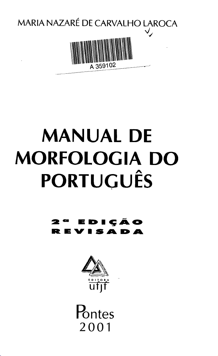 MARIA NAZARÉ DE CARVALHO LAROCA MANUAL DE MORFOLOGIA DO PORTUGUÊS • S A DA E D I T O R A Fbntes 2001 SUMARIO APRESENTAÇÃO 9 MORFOLOGIA 11 Breve histórico 11 Conceito e objeto 13 Divisão 14 PALAVRA, VOCABULÁRIO E LEXEMA 21 MORFEMA, MORFE, ALOMORFE 29 Conceitos 29 Alomorfia 34 Tipos de morfes e morfemas 36 MORFEMAS NOMINAIS 45 Género 45 Número 51 MORFEMAS VERBAIS 61 Estrutura dos verbos regulares 61 Sufixos temáticos (ST) 66 Sufixos modo-temporais (SMT) e sufixos verbo-nominais (SVN) 67 Sufixos número-pessoais (SNP) 69 ESTRUTURA MÓRFICA E MORFÊMICA DAS PALAVRAS 73 Radical flexionai e radical lexical 73 Diagramas-árvore: representação das estruturas mórfica e morfêmica 74 PROCESSOS DE FORMAÇÃO DE NOVAS PALAVRAS 83 REFERÊNCIAS BIBLIOGRÁFICAS 97