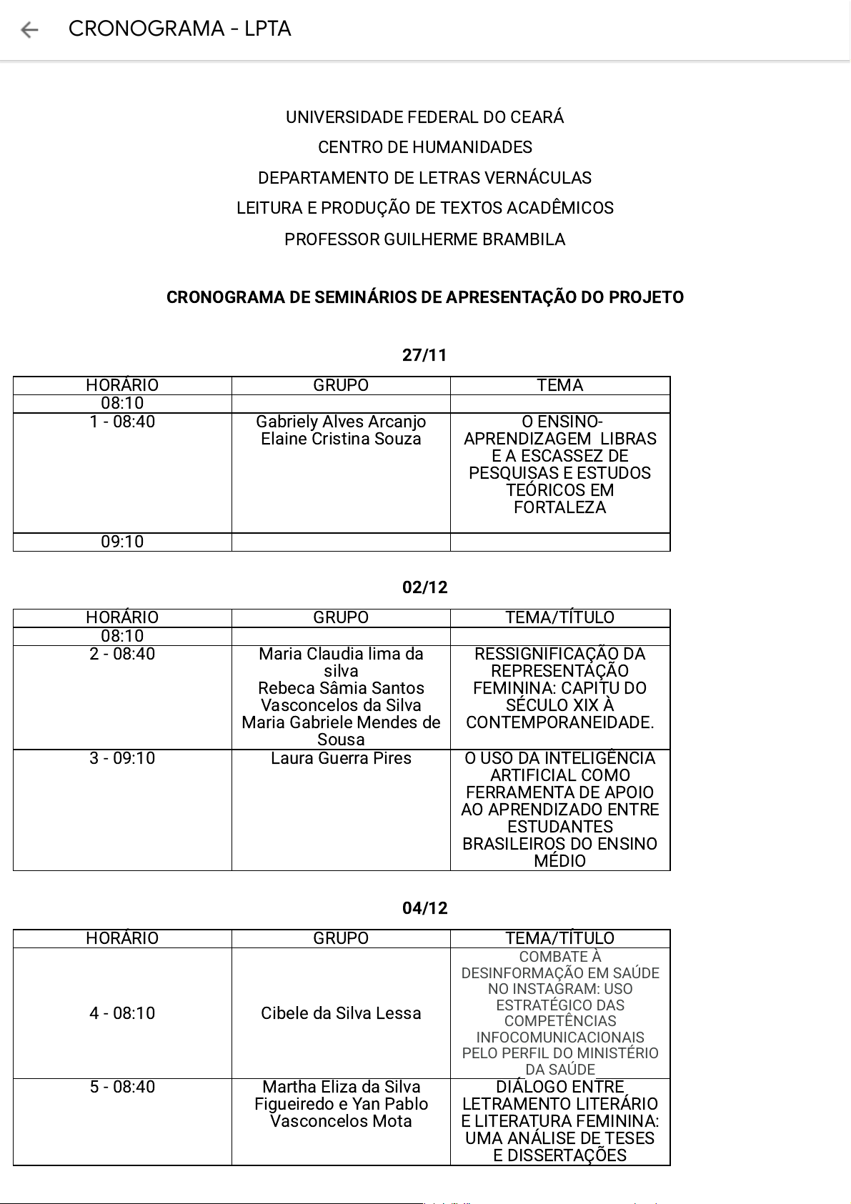UNIVERSIDADE FEDERAL DO CEARÁ CENTRO DE HUMANIDADES DEPARTAMENTO DE LETRAS VERNÁCULAS LEITURA E PRODUÇÃO DE TEXTOS ACADÊMICOS PROFESSOR GUILHERME BRAMBILA CRONOGRAMA DE SEMINÁRIOS DE APRESENTAÇÃO DO PROJETO 27/11 HORÁRIO GRUPO TEMA 08:10 1 - 08:40 Gabriely Alves Arcanjo Elaine Cristina Souza O ENSINO- APRENDIZAGEM LIBRAS E A ESCASSEZ DE PESQUISAS E ESTUDOS TEÓRICOS EM FORTALEZA 09:10 02/12 HORÁRIO GRUPO TEMA/TÍTULO 08:10 2 - 08:40 Maria Claudia lima da silva Rebeca Sâmia Santos Vasconcelos da Silva Maria Gabriele Mendes de Sousa RESSIGNIFICAÇÃO DA REPRESENTAÇÃO FEMININA: CAPITU DO SÉCULO XIX À CONTEMPORANEIDADE. 3 - 09:10 Laura Guerra Pires O USO DA INTELIGÊNCIA ARTIFICIAL COMO FERRAMENTA DE APOIO AO APRENDIZADO ENTRE ESTUDANTES BRASILEIROS DO ENSINO MÉDIO 04/12 HORÁRIO GRUPO TEMA/TÍTULO 4 - 08:10 Cibele da Silva Lessa COMBATE À DESINFORMAÇÃO EM SAÚDE NO INSTAGRAM: USO ESTRATÉGICO DAS COMPETÊNCIAS INFOCOMUNICACIONAIS PELO PERFIL DO MINISTÉRIO DA SAÚDE 5 - 08:40 Martha Eliza da Silva Figueiredo e Yan Pablo Vasconcelos Mota DIÁLOGO ENTRE LETRAMENTO LITERÁRIO E LITERATURA FEMININA: UMA ANÁLISE DE TESES E DISSERTAÇÕES CRONOGRAMA - LPTA https://drive.google.com/u/0?usp=docs_web https://drive.google.com/u/0?usp=docs_web https://drive.google.com/u/0?usp=docs_web https://drive.google.com/u/0?usp=docs_web https://drive.google.com/u/0?usp=docs_web 6 - 09:10 Pedro Gabriel Lívia Mandarino SUBCOMUNIDADE INCEL: COMO AS COMUNIDADES MISÓGINAS DO APLICATIVO X AFETAM A VISÃO MASCULINA DA MULHER NO BRASIL 09/12 HORÁRIO GRUPO TEMA/TÍTULO 08:10 7 - 08:40 Bianca Pinheiro luiane Gabriele Moises HQ’S NA SALA DE AULA: COMO AS HISTÓRIAS EM QUADRINHO PODEM AUXILIAR NA APRENDIZAGEM LÚDICO DAS FIGURAS DE LINGUAGEM NOS ANOS FINAIS DO ENSINO FUNDAMENTAL E INÍCIO DO ENSINO MÉDIO 8 - 09:10 Francisca Helena da Silva Soares, Rafaela Bernardo da Fonseca e Vitorya Evyllen da Silva A AUSÊNCIA DA PROFICIÊNCIA LINGUÍSTICA EM INGLÊS E SUAS IMPLICACÕES PARA OS INGRESSANTES DO CURSO DE LETRAS - PORTUGUÊS/INGLÊS DA UFC 11/12 HORÁRIO GRUPO TEMA/TÍTULO 08:10 9 - 08:40 Yohan Rafael Monteiro Eduarda Gonçalves Mulheres no League of Legends: a falta de punição e as falhas da Riot Games contra a misoginia. 10 - 09:10 Amanda Maria Silva Faier Nicolas Leonardo Ribeiro Elói Thiago Mendonça de Castro A música popular cearense na educação: a musicalização como alternativa educacional no ensino de literatura nas salas de ensino médio das escolas públicas de Fortaleza 16/12 HORÁRIO GRUPO TEMA/TÍTULO 11 - 08:10 Erica Maria Alves de Lima Bianca Coelho Barreto Análise da eficácia da colaboração entre escola e família no CRONOGRAMA - LPTA https://drive.google.com/u/0?usp=docs_web https://drive.google.com/u/0?usp=docs_web https://drive.google.com/u/0?usp=docs_web https://drive.google.com/u/0?usp=docs_web https://drive.google.com/u/0?usp=docs_web aprimoramento da aquisição da leitura em crianças de 6 a 7 anos da rede municipal de Fortaleza 12 - 08:40 Ana Keyse de Lima Rodrigues e Natália Maria Gomes Muniz Desigualdade educacional no Brasil: uma análise das diferenças de desempenho entre escolas públicas e particulares no acesso à universidade pública. 13 - 09:10 Hellen Sousa Nunes e Ana Alice Silva Felix Como a influência midiática pode 18/12 HORÁRIO GRUPO TEMA/TÍTULO 08:10 14 - 08:40 Isabely Vitória Pinheiro Silva Izy Silveira De Freitas Os empecilhos que impedem o diálogo sobre relações de gênero e sexualidade entre os discentes e docentes do ensino médio público e como isso afeta na vida escolar. 15 - 09:10 Jéssica Alves da Silva CRONOGRAMA - LPTA https://drive.google.com/u/0?usp=docs_web https://drive.google.com/u/0?usp=docs_web https://drive.google.com/u/0?usp=docs_web https://drive.google.com/u/0?usp=docs_web https://drive.google.com/u/0?usp=docs_web