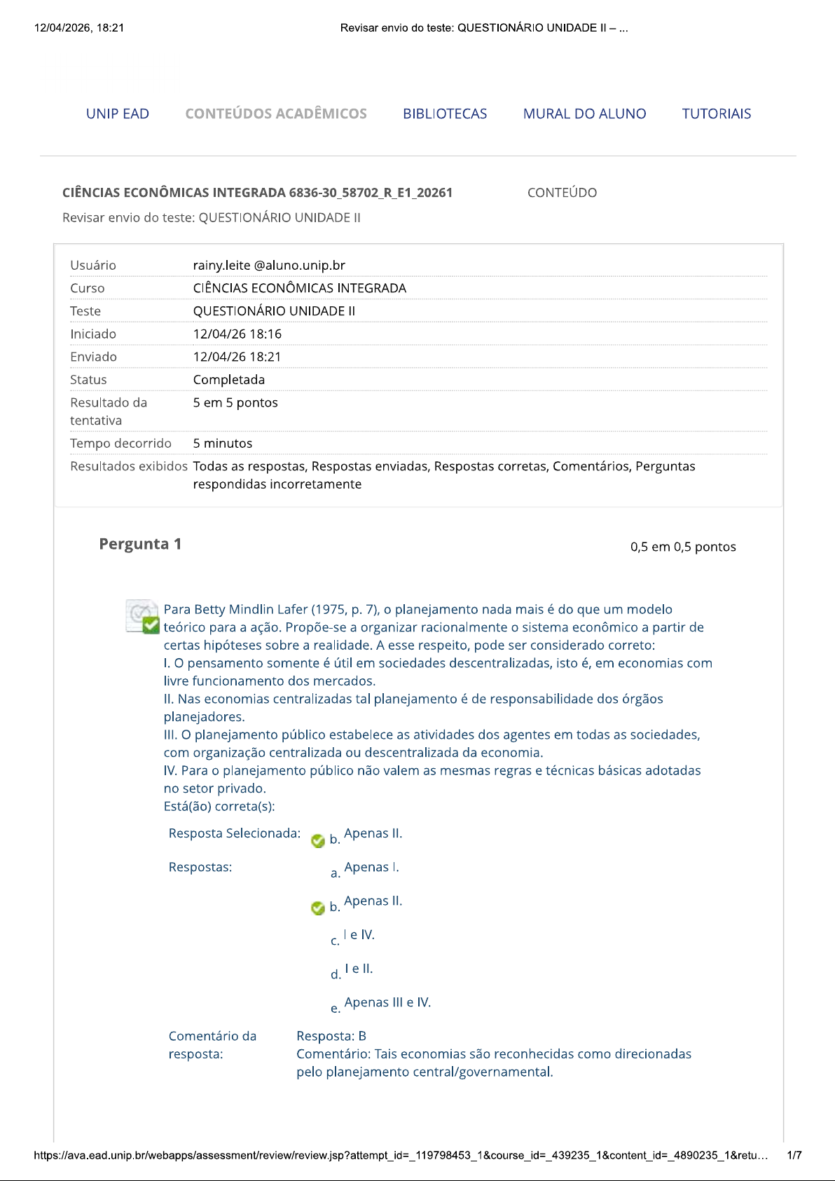 12/04/2026, 18:21 Revisar envio do teste: QUESTIONÁRIO UNIDADE UNIP EAD CONTEÚDOS ACADÊMICOS BIBLIOTECAS MURAL DO ALUNO TUTORIAIS CIÊNCIAS ECONÔMICAS INTEGRADA CONTEÚDO Revisar envio do teste: QUESTIONÁRIO UNIDADE Usuário rainy.leite @aluno.unip.br Curso CIÊNCIAS ECONÔMICAS INTEGRADA Teste QUESTIONÁRIO UNIDADE Iniciado 12/04/26 18:16 Enviado 12/04/26 18:21 Status Completada Resultado da 5 em 5 pontos tentativa Tempo decorrido 5 minutos Resultados exibidos Todas as respostas, Respostas enviadas, Respostas corretas, Comentários, Perguntas respondidas incorretamente Pergunta 1 0,5 em 0,5 pontos Para Betty Mindlin Lafer (1975, p. 7), planejamento nada mais é do que um modelo teórico para a ação. Propõe-se a organizar racionalmente o sistema econômico a partir de certas hipóteses sobre a realidade. A esse respeito, pode ser considerado correto: I. pensamento somente é útil em sociedades descentralizadas, isto é, em economias com livre funcionamento dos mercados. II. Nas economias centralizadas tal planejamento é de responsabilidade dos órgãos planejadores. III. planejamento público estabelece as atividades dos agentes em todas as sociedades, com organização centralizada ou descentralizada da economia. IV. Para planejamento público não valem as mesmas regras e técnicas básicas adotadas no setor privado. Está(ão) correta(s): Resposta Selecionada: b. Apenas II. Respostas: a. Apenas I. b. Apenas II. C. le IV. d. le II. Apenas III e IV. e. Comentário da Resposta: resposta: Comentário: Tais economias são reconhecidas como direcionadas pelo planejamento central/governamental. 1/712/04/2026, 18:21 Revisar envio do teste: QUESTIONÁRIO UNIDADE Pergunta 2 0,5 em 0,5 pontos O planejamento governamental não tem a finalidade de substituir a economia de mercado. Na verdade, que almeja é: I. Corrigir suas imperfeições, "aproximando a alocação de recursos correspondente a um Ótimo de Pareto. II. Evitar que desenvolvimento de uma economia seja exclusivamente vinculado ao alcance de uma situação que reflita Ótimo de Pareto. III. Permitir a participação da economia no mercado internacional, independentemente dos resultados dessa providência. IV. Orientar todas as atividades dos agentes econômicos para atingimento da equidade de condições sociais e políticas. Está(ão) correta(s): Resposta Selecionada: a. Apenas I. Respostas: a. Apenas I. b. Apenas IV. e III. d. e III. e. Apenas II. Comentário da Resposta: A resposta: Comentário: Ótimo de Pareto conceitua uma situação em que não há ganhos para um agente sem a perda de outro(s). Pergunta 3 0,5 em 0,5 pontos Escolha, entre as alternativas a seguir, a que não é considerada pelos estudiosos como razões que conduziram ao crescimento da participação do Estado na economia brasileira. Resposta Substituir funções que estejam a cargo do setor privado. e. Selecionada: Respostas: a. Expandir a produção no país em decorrência de um setor privado restrito. b. Atenuar impacto das tensões internas provocadas por efeitos de crises internacionais. Controlar crescimento da utilização do capital estrangeiro em áreas de interesse público bem como nas áreas de exploração de recursos naturais. d. Acelerar desenvolvimento industrial do país. Substituir funções que estejam a cargo do setor privado. e. 2/712/04/2026, 18:21 Revisar envio do teste: QUESTIONÁRIO UNIDADE Comentário da Resposta: E resposta: Comentário: As participações do governo na economia foram motivadas por vários objetivos voltados ao combate às falhas de mercado e à obtenção de crescimento econômico sem a preocupação de tornar-se sempre uma alternativa à atuação do setor privado. Pergunta 4 0,5 em 0,5 pontos Plano de Metas da segunda metade dos anos 1950 é reconhecido com um dos mais importantes esforços de planejamento no Brasil e sobre ele pode ser dito que: I. Obteve pouco sucesso em atingir as metas a que se propôs. II. Seu principal intuito era combate à alta inflação existente no país na ocasião. III. Ficou conhecido como plano que enxugou drasticamente os recursos monetários em poder dos agentes econômicos. IV. Procurou atuar em setores considerados estratégicos para a obtenção do crescimento no país. Está(ão) correta(s): Resposta Selecionada: d. Apenas IV. Respostas: a. le II. b. III e IV. Apenas III. d. Apenas IV. e. le IV. Comentário da Resposta: D resposta: Comentário: plano objetivava a expansão da indústria nacional por parte da iniciativa privada com apoio de investimentos em infraestrutura para suporte à industrialização; Pergunta 5 0,5 em 0,5 pontos Sobre o funcionamento de uma economia capitalista economia de mercado -, indique a alternativa correta. Resposta a. Selecionada: Os três problemas básicos que e quanto, como e para quem são resolvidos pelos sistemas de preços, com predomínio da livre-iniciativa dos agentes econômicos e a propriedade privada dos meios de produção. 3/712/04/2026, 18:21 Revisar envio do teste: QUESTIONÁRIO UNIDADE Respostas: a. Os três problemas básicos que e quanto, como e para quem são resolvidos pelos sistemas de preços, com predomínio da livre-iniciativa dos agentes econômicos e a propriedade privada dos meios de produção. b. Os problemas básicos mencionados na alternativa (a), imediatamente anterior, são resolvidos pela atuação de órgãos planejadores centrais. Os órgãos planejadores fixam as metas que devem ser cumpridas, transferindo-as a unidades setoriais e regionais, as quais controlam os produtores dos bens e serviços. d. Tanto na economia de mercado quanto nas centralizadas, os meios de produção são considerados como pertencentes a toda a sociedade. e. Os três problemas básicos que e quanto, como e para quem são resolvidos pelos sistemas de preços, com predomínio da livre-iniciativa dos agentes econômicos e a propriedade coletiva dos meios de produção. Comentário da Resposta: A resposta: Comentário: Em uma ec