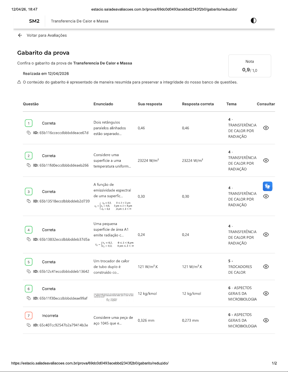 12/04/26, 18:47 estacio.saladeavaliacoes.com.br/prova/69dc0d0493acebbd2343f2b0/gabarito/reduzido/ SM2 Transferencia De Calor e Massa Voltar para Avaliações Gabarito da prova Nota Confira o gabarito da prova de Transferencia De Calor e Massa 0,9/ 1,0 Realizada em 12/04/2026 conteúdo do gabarito é apresentado de maneira resumida para preservar a integridade do nosso banco de questões. Questão Enunciado Sua resposta Resposta correta Tema Consultar 1 Correta Dois retângulos TRANSFERÊNCIA paralelos alinhados 0,46 0,46 DE CALOR POR ID: 65b116cceccdbbbddeace67d estão RADIAÇÃO 2 Correta Considere uma TRANSFERÊNCIA superfície a uma 23224 23224 DE CALOR POR ID: 65b11fd0eccdbbbddeaeb266 temperatura uniform... RADIAÇÃO A função de 3 Correta emissividade espectral TRANSFERÊNCIA de uma superfíc... 0,30 0,30 DE CALOR POR ID: 65b13518eccdbbbddeb2d739 0,2, 0,8, RADIAÇÃO 0,1 Uma pequena 4 Correta superfície de área A1 TRANSFERÊNCIA emite radiação 0,24 0,24 DE CALOR POR ID: 65b13832eccdbbbddeb37d5a 0,2,12/04/26, 18:47 estacio.saladeavaliacoes.com.br/prova/69dc0d0493acebbd2343f2b0/gabarito/reduzido/ Determine o número de 8 Correta 6 ASPECTOS Sherwood (Sh). 2813 2813 GERAIS DA o ID: 65b11de5eccdbbbddeae63a3 massa MICROBIOLOGIA 1 atm) 9 Correta Um trocador de calor 5 em contrafluxo ou 46,4 °C 46,4 °C TROCADORES ID: 67251886891bf24e72fb9cbc corrente op... DE CALOR 10 Correta Um trocador de calor 5 em contrafluxo ou 1,24 X 106 W 1,24 X 106 W TROCADORES ID: 672517cf891bf24e72fb94e6 corrente DE CALOR i Encontrou algum problema? Você pode copiar o ID da questão e abrir um requerimento. Na tela inicial do Campus Virtual (SIA), acesse "Atendimento > Requerimento > Novo > Currículo/Aula/horário > Analisar ambiente de avaliação/exercícios" 2/2