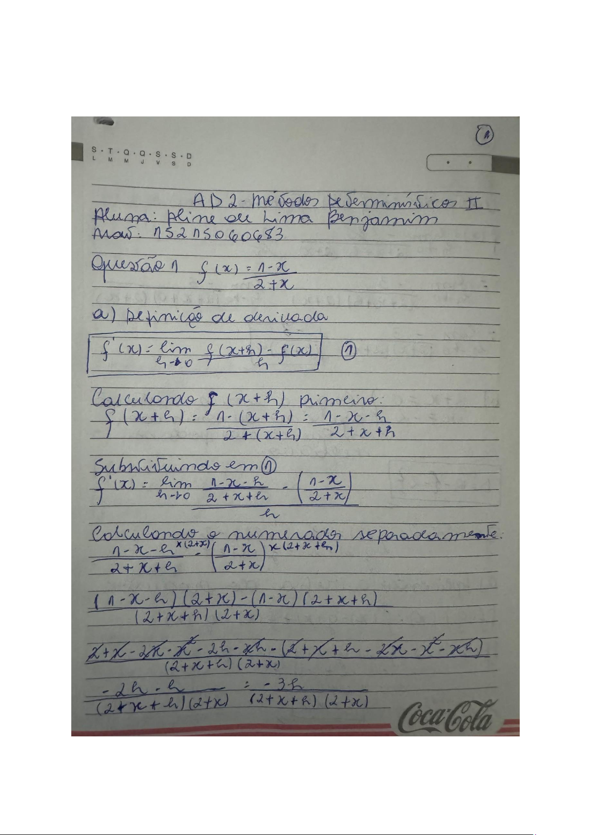 a M J V S D II Aluma: pline all Lima Benjamim = n-x a) de h - f(x) 1 : 2+xth em = lim 1-x-h - ( n-x 2+x h Colculondo n-x-h 2+x - (2+x+h) - - - = - 3h (2+x) Coca-Cola2 LMMJVSD f(x) lim - h = -3 - : lim - 3 G G-60 (2+x) (2+x+0) :- - 3 = -3 G -60 (2+x) (2+x) (2+ 2 b) 6 a noo pode sen f (2) = 2 7 g' (2) = a) refra do (x) : (x). g (x) + (x) g (x) 2) f' (2) g (2) + f (2) g (2) : - 2 + = - - Rekreshing :-25b) a do 3 g = (x) g (x) f (x) f (2) = g (2) - f 2 g' (2) (2) : - = : 17 22 4 4 c) a fog (g g' f' (g (2) = (2) (2) = - 2.7 = - 14 h(x) log 3 n + que a log i ( log a us In Coca-Cola4 LMMJVSD 3 : e a = 3 2x (x) 1 2x = 2x 4 a) 200 unidades R$ 350 ( um) A no 20 p(x) : 350 - 10n 200 funcóo (x) Com: + = 7 0000 + 7 000 - 2000 - 200 x2 70000 - RefreshingS . T Q . Q . S S . D L M M J V S D . . 5 b) ow : - 5000 - 5000