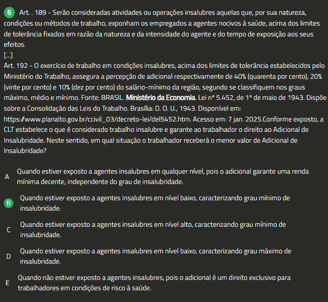6 189 Serão consideradas atividades ou operações insalubres aquelas que, por sua natureza, condições ou métodos de trabalho, exponham empregados a agentes nocivos à saúde, acima dos limites de tolerância fixados em razão da natureza e da intensidade do agente e do tempo de exposição aos seus efeitos. [...] Art. 192 0 exercício de trabalho em condições insalubres, acima dos limites de tolerância estabelecidos pelo Ministério do Trabalho, assegura a percepção de adicional respectivamente de 40% (quarenta por cento), 20% (vinte por cento) e 10% (dez por cento) do salário-mínimo da região, segundo se classifiquem nos graus máximo, médio e mínimo. Fonte: BRASIL. Ministério da Economia. Lei n° 5.452, de 1° de maio de 1943. Dispõe sobre a Consolidação das Leis do Trabalho. Brasilia: D. U., 1943. Disponível em: https://www.planalto.gov.br/ccivil_03/decreto-lei/del5452.htm. Acesso em: 7 jan. 2025.Conforme exposto, a CLT estabelece 0 que considerado trabalho insalubre e garante ao trabalhador 0 direito ao Adicional de Insalubridade. Neste sentido, em qual situação 0 trabalhador 0 menor valor de Adicional de Insalubridade? Quando estiver exposto a agentes insalubres em qualquer nivel, pois 0 adicional garante uma renda A mínima decente, independente do grau de insalubridade. Quando estiver exposto a agentes insalubres em nível baixo, caracterizando grau mínimo de B insalubridade. Quando estiver exposto a agentes insalubres em alto, caracterizando grau mínimo de insalubridade. Quando estiver exposto a agentes insalubres em nivel baixo, caracterizando grau de D insalubridade. Quando não estiver exposto a agentes insalubres, pois 0 adicional é um direito exclusivo para E trabalhadores em condições de risco à