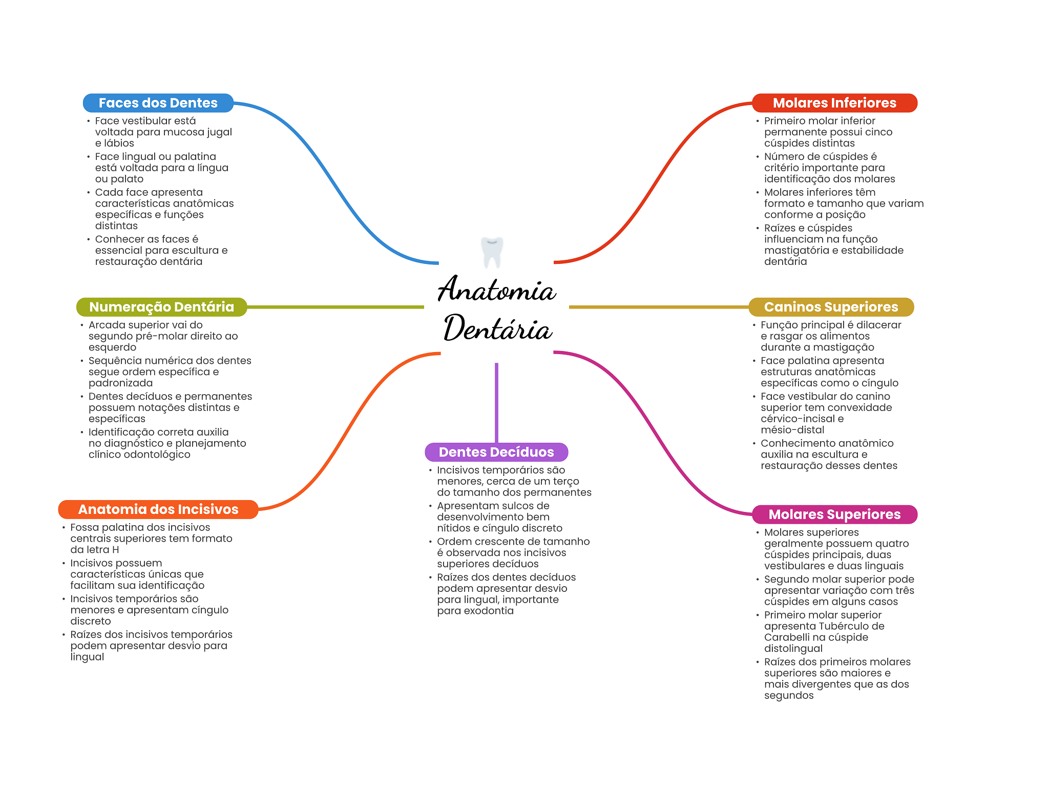 Faces dos Dentes Molares Inferiores Face vestibular está Primeiro molar inferior voltada para mucosa jugal permanente possui cinco e lábios cúspides distintas Face lingual ou palatina Número de cúspides é está voltada para a língua critério importante para ou palato identificação dos molares Cada face apresenta Molares inferiores têm características anatômicas formato e tamanho que variam específicas e funções conforme a posição distintas Raízes e cúspides Conhecer as faces é influenciam na função essencial para escultura e mastigatória e estabilidade restauração dentária dentária Anatomia Numeração Dentária Caninos Superiores Arcada superior vai do segundo pré-molar direito ao Dentária Função principal é dilacerar e rasgar alimentos esquerdo durante a mastigação Sequência numérica dos dentes Face palatina apresenta segue ordem específica e estruturas anatômicas padronizada específicas como O cíngulo Dentes decíduos e permanentes Face vestibular do canino possuem notações distintas e superior tem convexidade específicas cérvico-incisal e Identificação correta auxilia mésio-distal no diagnóstico e planejamento Conhecimento anatômico clínico odontológico Dentes Decíduos auxilia na escultura e Incisivos temporários são restauração desses dentes menores, cerca de um terço do tamanho dos permanentes Anatomia dos Incisivos Apresentam sulcos de desenvolvimento bem Molares Superiores Fossa palatina dos incisivos nítidos e cíngulo discreto centrais superiores tem formato Molares superiores Ordem crescente de tamanho da letra H geralmente possuem quatro é observada nos incisivos cúspides principais, duas Incisivos possuem superiores decíduos vestibulares e duas linguais características únicas que Raízes dos dentes decíduos facilitam sua identificação Segundo molar superior pode podem apresentar desvio apresentar variação com três Incisivos temporários são para lingual, importante cúspides em alguns casos menores e apresentam cíngulo para exodontia discreto Primeiro molar superior apresenta Tubérculo de Raízes dos incisivos temporários Carabelli na cúspide podem apresentar desvio para distolingual lingual Raízes dos primeiros molares superiores são maiores e mais divergentes que as dos segundos