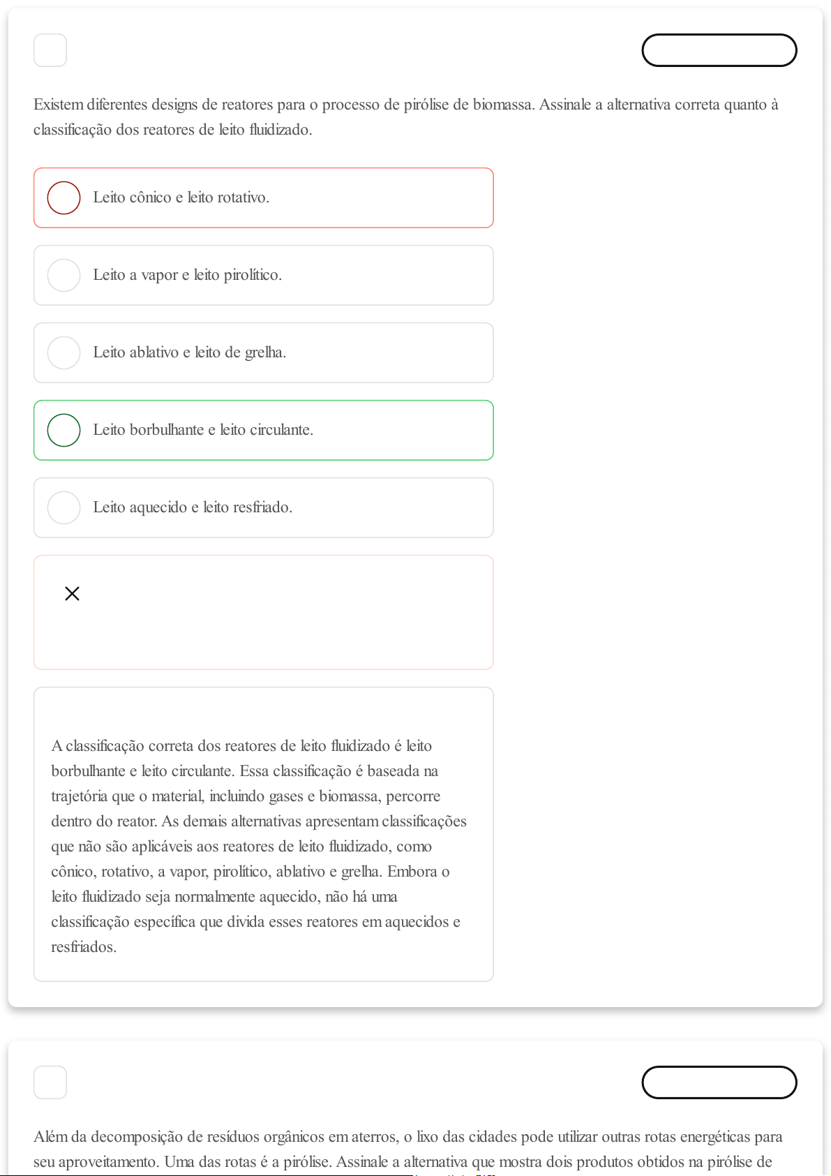 A B C D E 1 Marcar para revisão Existem diferentes designs de reatores para o processo de pirólise de biomassa. Assinale a alternativa correta quanto à classificação dos reatores de leito fluidizado. Leito cônico e leito rotativo. Leito a vapor e leito pirolítico. Leito ablativo e leito de grelha. Leito borbulhante e leito circulante. Leito aquecido e leito resfriado. Resposta incorreta Opa! A alternativa correta é a letra D. Confira o gabarito comentado! Gabarito Comentado A classificação correta dos reatores de leito fluidizado é leito borbulhante e leito circulante. Essa classificação é baseada na trajetória que o material, incluindo gases e biomassa, percorre dentro do reator. As demais alternativas apresentam classificações que não são aplicáveis aos reatores de leito fluidizado, como cônico, rotativo, a vapor, pirolítico, ablativo e grelha. Embora o leito fluidizado seja normalmente aquecido, não há uma classificação específica que divida esses reatores em aquecidos e resfriados. 2 Marcar para revisão Além da decomposição de resíduos orgânicos em aterros, o lixo das cidades pode utilizar outras rotas energéticas para seu aproveitamento. Uma das rotas é a pirólise. Assinale a alternativa que mostra dois produtos obtidos na pirólise de A B C D E resíduos sólidos. Gás de síntese e gás metano. Gás metano e fertilizante orgânico. Bio-óleo e biochar. Bio-óleo e chorume. Gás metano e gás propano. Resposta incorreta Opa! A alternativa correta é a letra C. Confira o gabarito comentado! Gabarito Comentado A pirólise é um processo de decomposição térmica de materiais orgânicos na ausência de oxigênio, que resulta na produção de três produtos principais: gás de síntese, bio-óleo e biochar. Portanto, a alternativa correta é a C, que menciona o bio-óleo e o biochar. As outras alternativas mencionam produtos que são obtidos por meio de outros processos. Por exemplo, o gás metano e o fertilizante orgânico são produzidos pelo processo de biodigestão, enquanto o metano e o chorume são produzidos em aterros sanitários. O gás propano, por sua vez, é originário da indústria de petróleo. 3 Marcar para revisão Um importante processo para a obtenção de produtos energéticos a partir da biomassa é a pirólise. Esse processo pode ser realizado em um reator no qual a biomassa é comprimida contra discos rotativos em altas temperaturas. Assinale a alternativa que indica o tipo de pirólise realizada no equipamento descrito. A B C D E Pirólise em leito fluidizado borbulhante. Pirólise em leito fluidizado circulante. Pirólise ablativa. Pirólise em reator cone rotativo. Pirólise em leito fixo. Resposta incorreta Opa! A alternativa correta é a letra C. Confira o gabarito comentado! Gabarito Comentado O tipo de pirólise descrito no enunciado é a pirólise ablativa. Nesse processo, a biomassa é comprimida contra um disco rotatório aquecido, o que resulta na liberação dos produtos mais energéticos desse material orgânico. As outras opções apresentadas referem-se a diferentes tipos de pirólise. A pirólise em leito fluidizado, seja borbulhante ou circulante, promove um contato mais direto entre a biomassa sólida e os gases do processo. No caso da pirólise em reator cone rotativo, a biomassa descreve uma trajetória descendente ao longo de um cone aquecido. Já na pirólise em leito fixo, a biomassa fica apoiada em uma grade fixa durante o seu processamento. Portanto, a alternativa correta é a "C", que se refere à pirólise ablativa. 4 Marcar para revisão A biodigestão, utilizada em fazendas agropecuárias de grande porte, gera como principal produto energético o gás metano. Assinale a alternativa que mostra a principal fonte de alimentação para o processo de biodigestão. A B C D E Restos de capim. Resíduos plásticos. Carcaça de animais mortos na criação. Esterco de gado. Carvão vegetal. Resposta incorreta Opa! A alternativa correta é a letra D. Confira o gabarito comentado! Gabarito Comentado A alternativa correta é a letra D, que indica o esterco de gado como a principal fonte de alimentação para o processo de biodigestão. A biodigestão é um processo que utiliza matéria orgânica, como o esterco de gado, para produzir energia na forma de gás metano. Embora restos de capim possam ser utilizados, eles não são a principal fonte de alimentação para o processo. Resíduos plásticos, carcaças de animais e carvão vegetal não são adequados para a biodigestão. As carcaças de animais são geralmente incineradas ou enterradas, enquanto os resíduos plásticos e o carvão vegetal não são tratados em biodigestores. 5 Marcar para revisão Materiais de origem orgânica são capazes de produzir diferentes quantidades de energia quando utilizados como fonte de combustível. Assinale a alternativa correta que mostra a definição adequada de poder calorífico superior. A B C D E Poder calorífico dos combustíveis fósseis. Poder calorífico considerando a geração de água no estado líquido no processo de combustão. Poder calorífico considerando a geração de água no estado vapor no processo de combustão. Poder calorífico considerando a geração de CO no estado vapor no processo de combustão. 2 Poder calorífico considerando a geração de gases resfriados no processo de combustão. Resposta incorreta Opa! A alternativa correta é a letra B. Confira o gabarito comentado! Gabarito Comentado O poder calorífico superior é definido como a quantidade total de energia liberada durante a combustão completa de uma substância, quando a água produzida é condensada e, portanto, está no estado líquido. Isso significa que toda a energia liberada na combustão, incluindo a energia usada para vaporizar a água, é contabilizada. A alternativa B está correta porque reflete essa definição. As outras alternativas são incorretas porque não descrevem corretamente o conceito de poder calorífico s