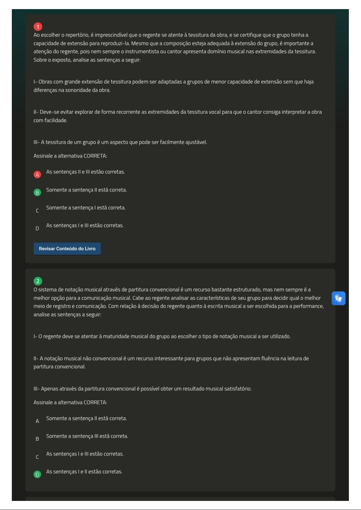1 Ao escolher o repertório, é imprescindível que regente se atente à tessitura da obra, e se certifique que o grupo tenha a capacidade de extensão para reproduzi-la. Mesmo que a composição esteja adequada à extensão do grupo, é importante a atenção do regente, pois nem sempre o instrumentista ou cantor apresenta domínio musical nas extremidades da tessitura. Sobre exposto, analise as sentenças a seguir: I- Obras com grande extensão de tessitura podem ser adaptadas a grupos de menor capacidade de extensão sem que haja diferenças na sonoridade da obra. II- Deve-se evitar explorar de forma recorrente as extremidades da tessitura vocal para que cantor consiga interpretar a obra com facilidade. III- A tessitura de um grupo é um aspecto que pode ser facilmente ajustável. Assinale a alternativa CORRETA: A As sentenças e III estão corretas. Somente a sentença II está correta. Somente a sentença I está correta. D As sentenças e III estão corretas. Revisar Conteúdo do Livro 2 sistema de notação musical através de partitura convencional é um recurso bastante estruturado, mas nem sempre é a melhor opção para a comunicação musical. Cabe ao regente analisar as características de seu grupo para decidir qual o melhor meio de registro e comunicação. Com relação à decisão do regente quanto à escrita musical a ser escolhida para a performance, analise as sentenças a seguir: I- regente deve se atentar à maturidade musical do grupo ao escolher tipo de notação musical a ser utilizado. II- A notação musical não convencional é um recurso interessante para grupos que não apresentam fluência na leitura de partitura convencional. III- Apenas através da partitura convencional é possível obter um resultado musical satisfatório. Assinale a alternativa CORRETA: A Somente a sentença está correta. Somente a sentença III está correta. As sentenças e III estão corretas. As sentenças e estão corretas. D3 canto coral é uma prática muito recorrente em locais como empresas, grupos da terceira idade e em espaços de cumprimento de medidas socioeducativas. A oferta de ensino musical nestes espaços é mais uma área de atuação para regente educador. Sobre esse campo de trabalho, avalie as asserções a seguir e a relação proposta entre elas: I- Em práticas musicais em que objetivo é a terapia e a socialização, é possível que regente se depare com resistência de participação do grupo, e precise adotar uma abordagem mais cordial do que em grupos profissionais. PORQUE II- É através de relações horizontalizadas e afetivas que se alcança a credibilidade de grupos resistentes à prática musical. Assinale a alternativa CORRETA: A As asserções e II são proposições verdadeiras, mas a II não é uma justificativa da I. As asserções le II são proposições falsas. A asserção é uma proposição verdadeira, e a II é uma proposição falsa. D As asserções le II são proposições verdadeiras, e a é uma justificativa da I. 4 Classificar instrumentos em formação mista pelo sistema SATB (soprano, alto, tenor e baixo) pode ajudar regente a determinar as funções que cada instrumento desempenhará nos arranjos e adaptações. Sobre o sistema de classificação SATB, assinale a alternativa CORRETA: sistema é de uso exclusivo da música coral. A Se originou na música coral a quatro vozes, e foi alargado para abarcar a música instrumental. Poucos instrumentos podem ser classificados pelo sistema SATB. D Se originou na música para quarteto de cordas e, posteriormente, foi utilizado na música coral. 5 Durante a história da música ocidental europeia a figura do regente sofreu muitas mudanças. No início, sua função era desempenhada por um dos próprios músicos em performance; tempos mais tarde, sua atividade foi atrelada aos encargos do compositor, até que conquistou seu posto frente ao grupo musical. Sobre as diversas funções que circundam a prática da regência, analise as sentenças a seguir: I- A interpretação musical realizada pelo regente não deve ser pautada no contexto histórico da obra. II- Ao idealizar a interpretação da obra, o regente precisa levar em conta nível técnico do grupo musical com quem trabalhará. III- A única atribuição do regente é garantir que grupo musical mantenha andamento indicado na partitura da obra. Assinale a alternativa CORRETA: A As sentenças e estão corretas. Somente a sentença está correta. As sentenças e III estão corretas. D Somente a sentença III está correta.6 A realização do gesto preparatório é fundamental para a precisão rítmica do grupo, e mesmo que regente não esteja utilizando as mãos para reger, é possível que a indicação seja feita através da movimentação da cabeça. Sobre a regência que utiliza a movimentação da cabeça, associe os itens, utilizando código a seguir: Plano de regência. II- Gesto preparatório. III- Marcação de entrada. ( ) Movimento ascendente com a cabeça, sincronizado com uma respiração. ( ) Contato do queixo à delimitação imaginária do espaço, movimento elástico. ( ) Movimento descendente com a cabeça, sincronizado com uma expiração. Assinale a alternativa que apresenta a sequência CORRETA: III A III. III II. III. D Revisar Conteúdo do Livro 7 Na notação musical renascentista as figuras musicais não seguiam proporções fixas, tais como utilizamos atualmente, e seus valores podiam adotar medidas distintas mesmo no decorrer de uma única peça. Desta forma, a regência nesse período demonstra a noção de "tactus", que pode ser entendido como pulso musical. Com relação ao gesto realizado durante a regência que indicava a marcação de "tactus"/pulso musical, assinale a alternativa CORRETA: A A mão regente realizava movimentos descendentes e ascendentes. movimento descendente da mão regente indicava tempo forte. B A mão regente realizava apenas movimentos descendentes. D movimento ascendente da mão r